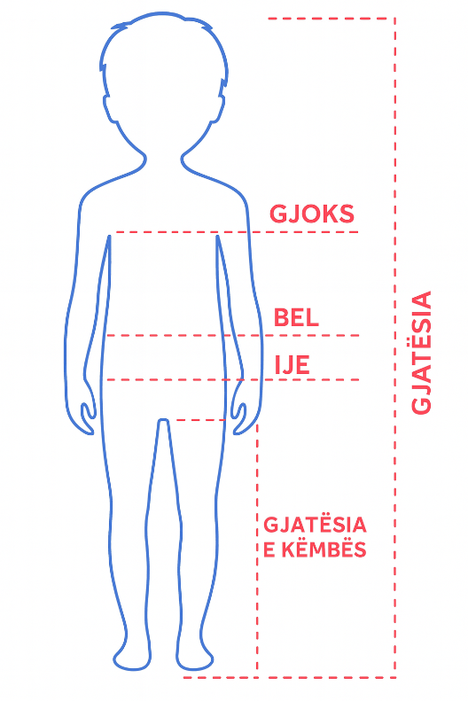 Në këtë seksion do të gjeni një udhëzues praktik për zgjedhjen e masës së duhur gjatë blerjeve online të veshjeve për fëmijën tuaj. Nga muajt e parë të jetës e deri në momentin kur bëhen adoleshentë, paraqesim në mënyrë të detajuar të gjitha matjet në centimetra sipas gjinisë dhe moshës së fëmijës. Në tabelat që pasojnë, mund të krahasoni gjatësinë, perimetrin e gjoksit, perimetrin e belit, perimetrin e ijeve, gjerësinë e shpatullave, gjatësinë e pjesës së brendshme të këmbës dhe gjatësinë e këmbës.