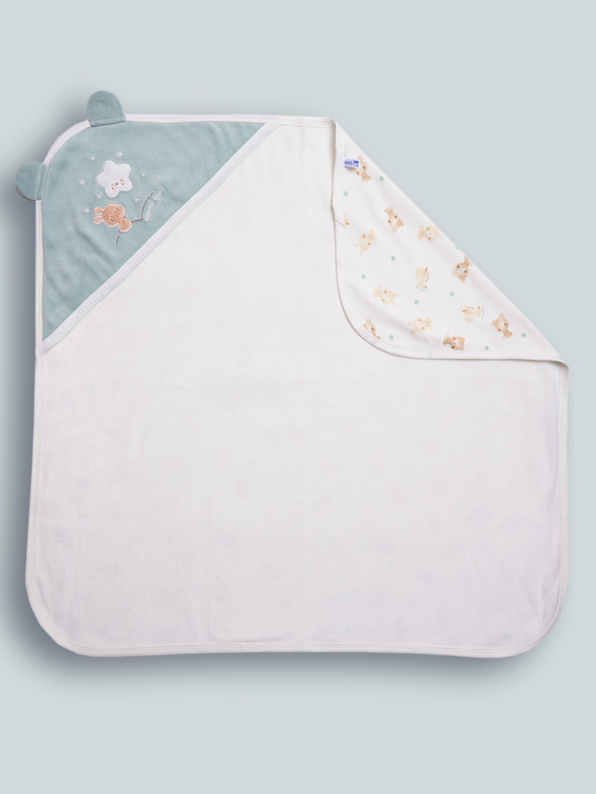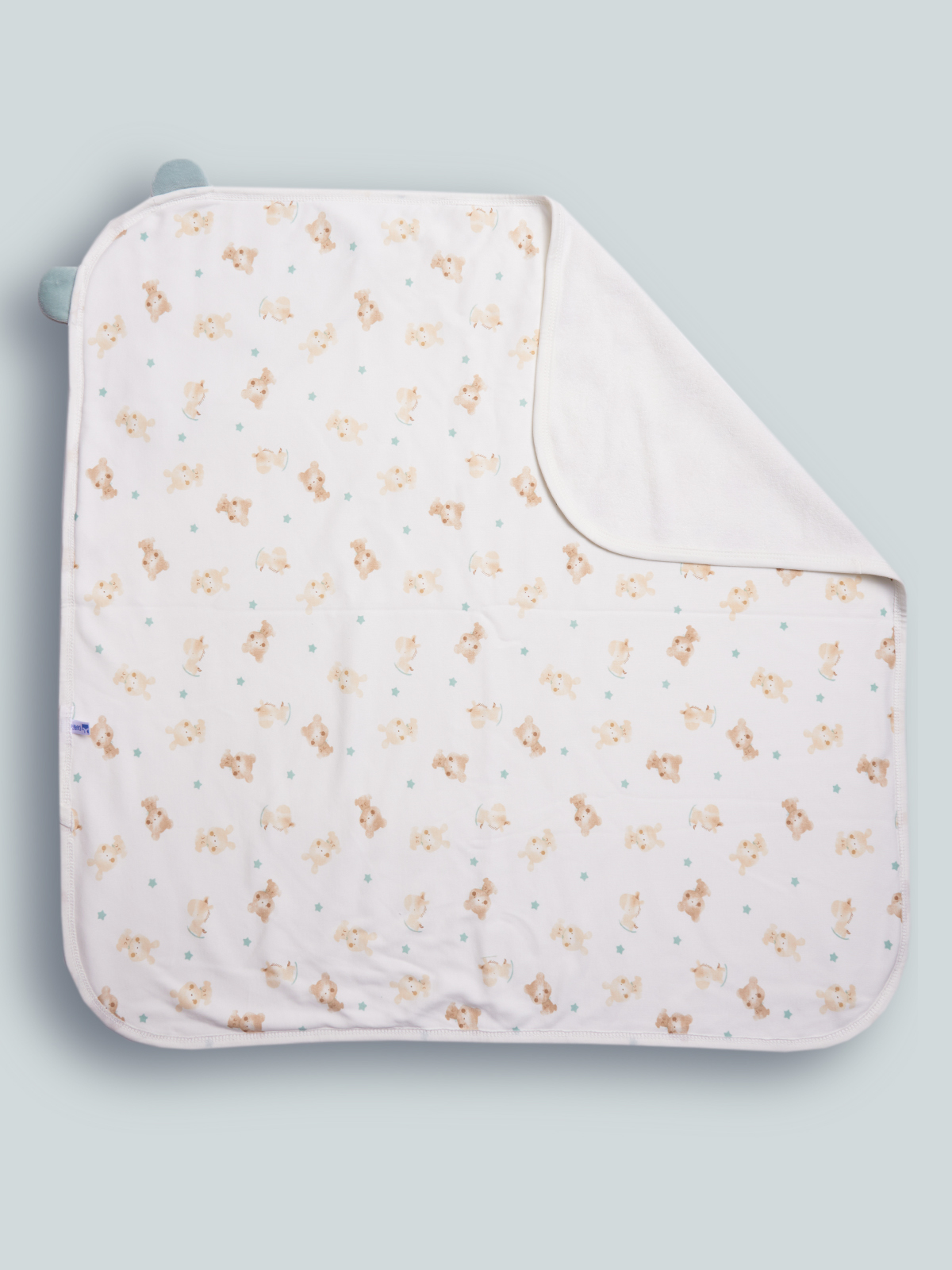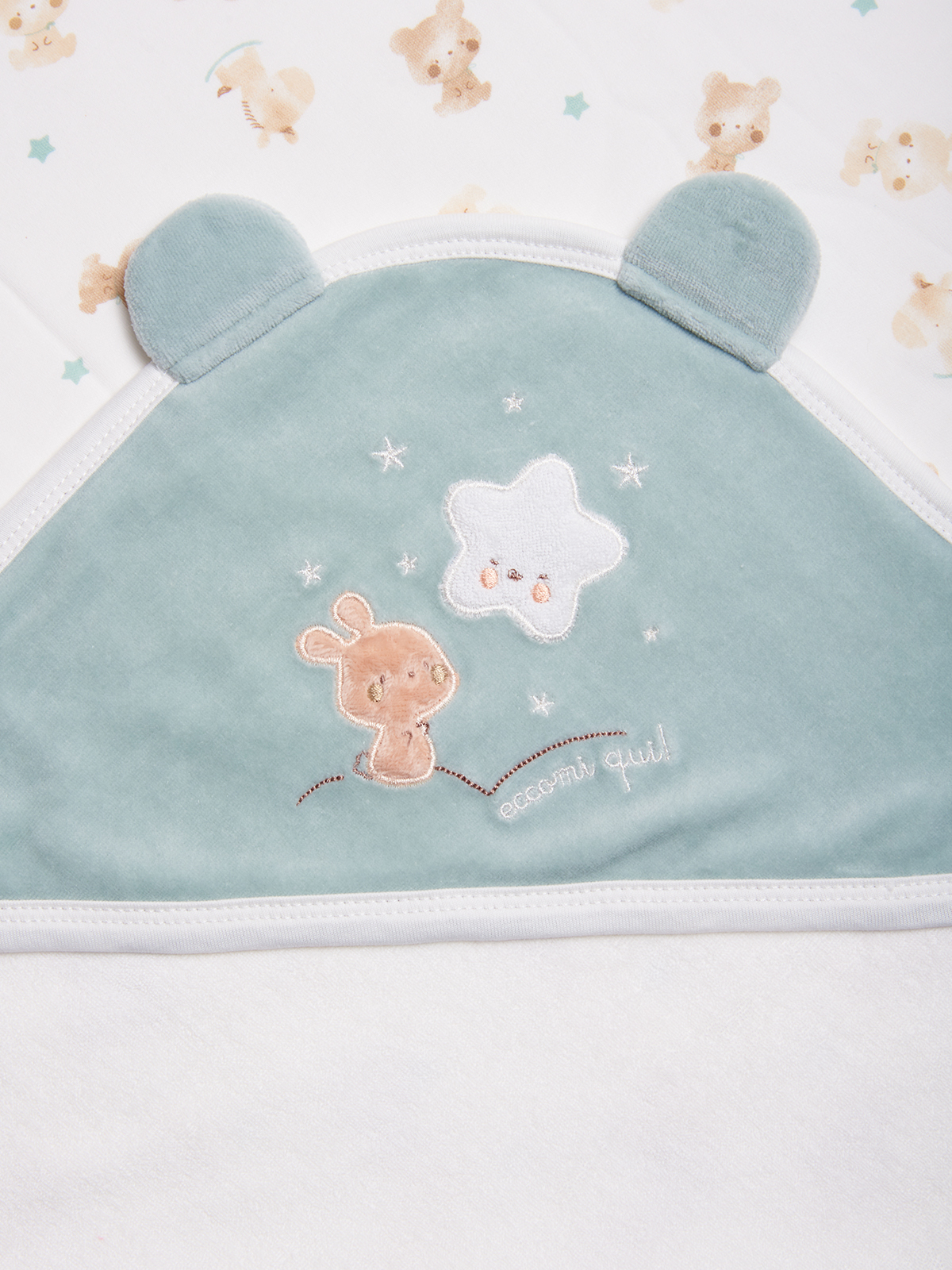Avvolgente asciugamano con la quale potrai asciugare il tuo neonato dopo il bagnetto. Tessuto spugna 100% cotone. Elemento decorativo: ricamo e orecchie 3D. Questo accessorio fa parte del corredino composto da tutti gli articoli indispensabili per il tuo neonato.