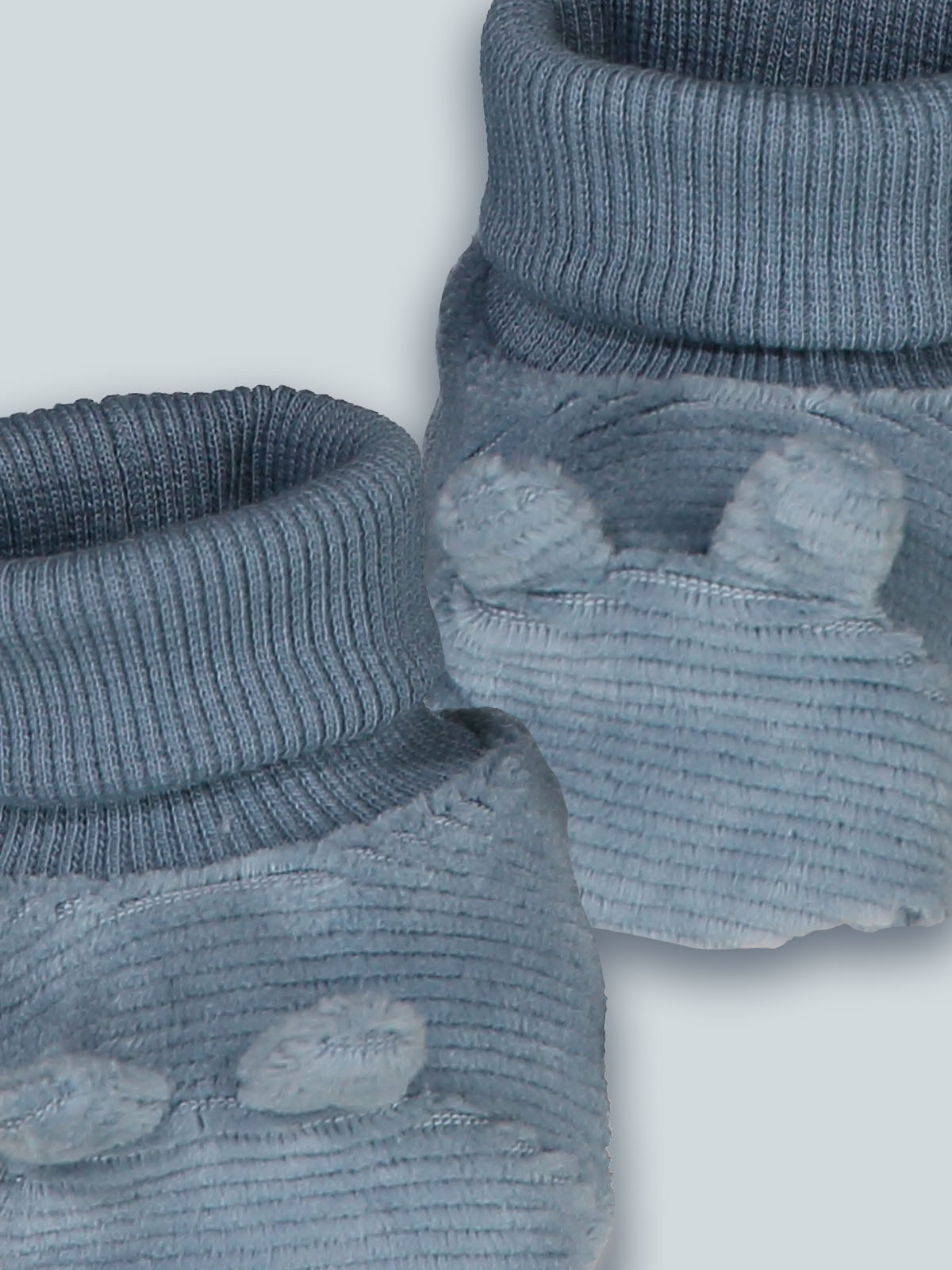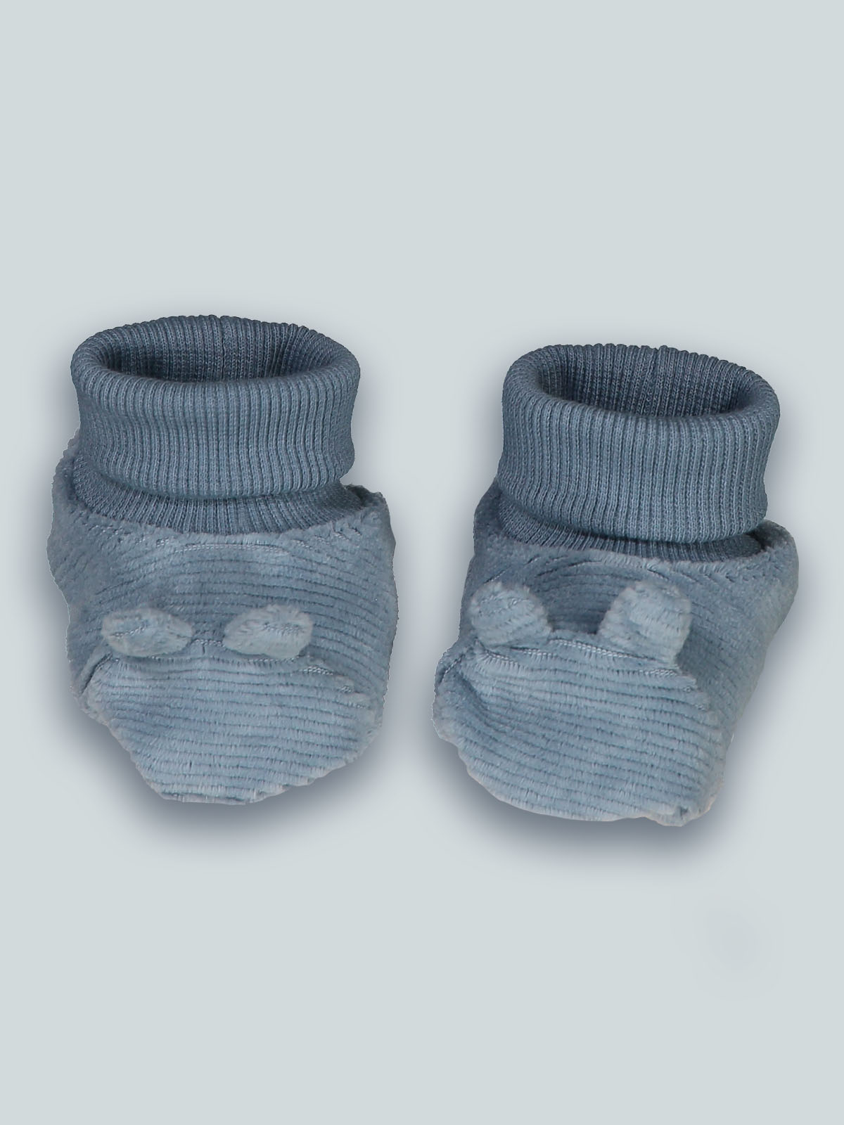 Babbuccia in ciniglia a coste. Particolarità del capo: simpatiche orecchie 3D. Questo accessorio fa parte del corredino composto da tutti gli articoli indispensabili per il tuo neonato.