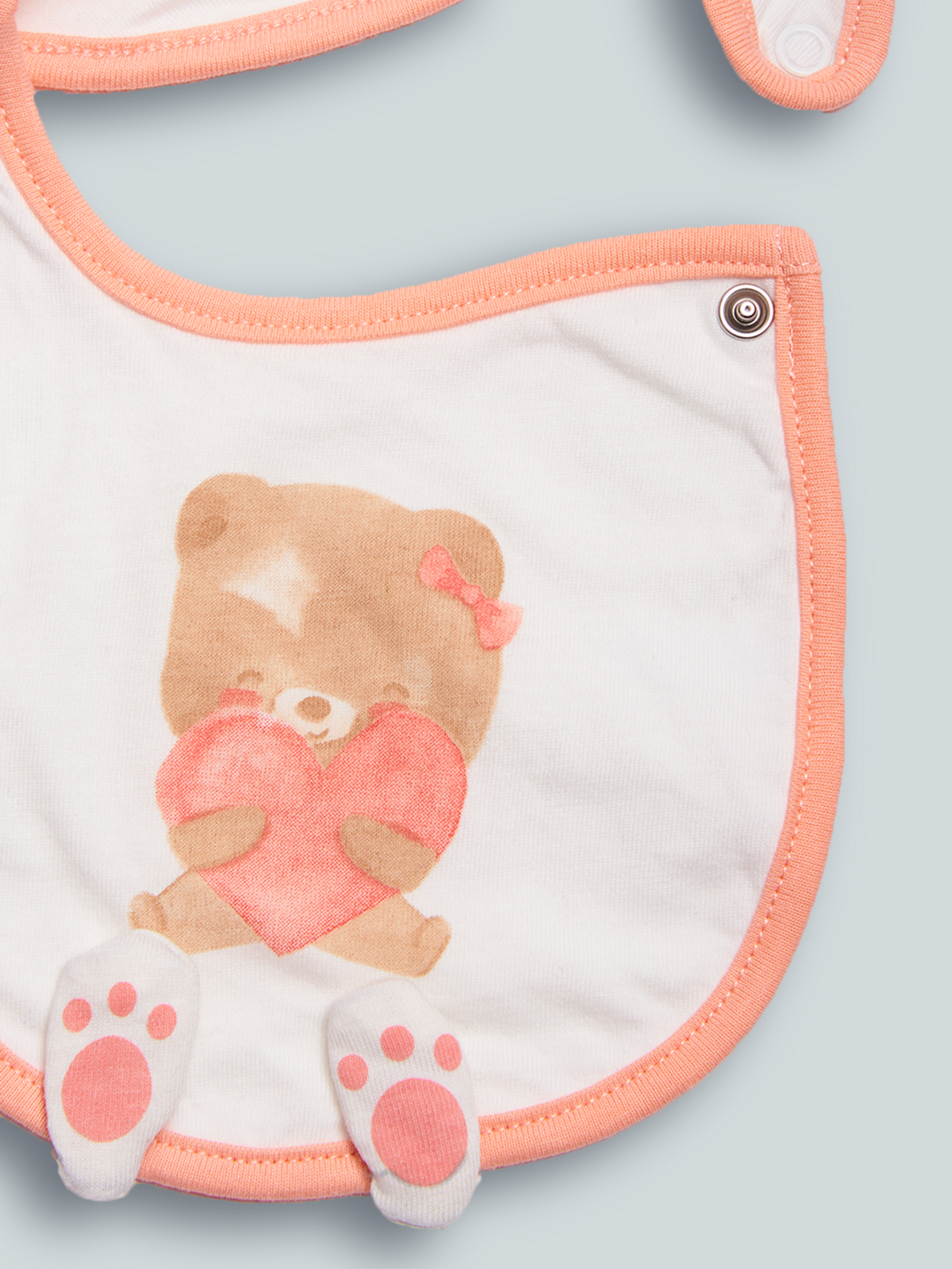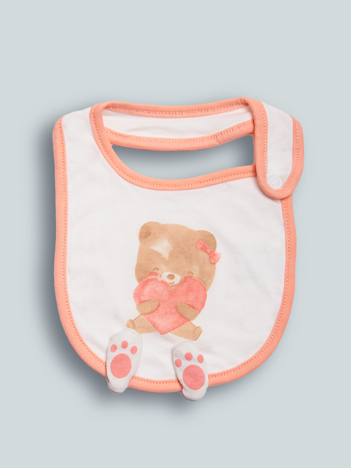 Morbido bavaglino doppiato in cotone e bordo contrasto. Apertura con bottone a pressione. Stampa con due simpatiche zampine 3D. Questo accessorio fa parte del corredino composto da tutti gli articoli indispensabili per la tua neonata.