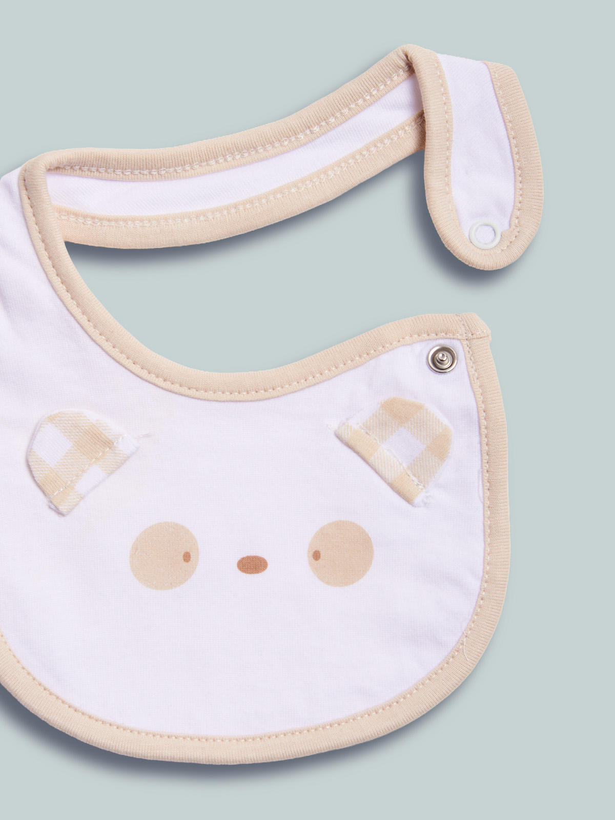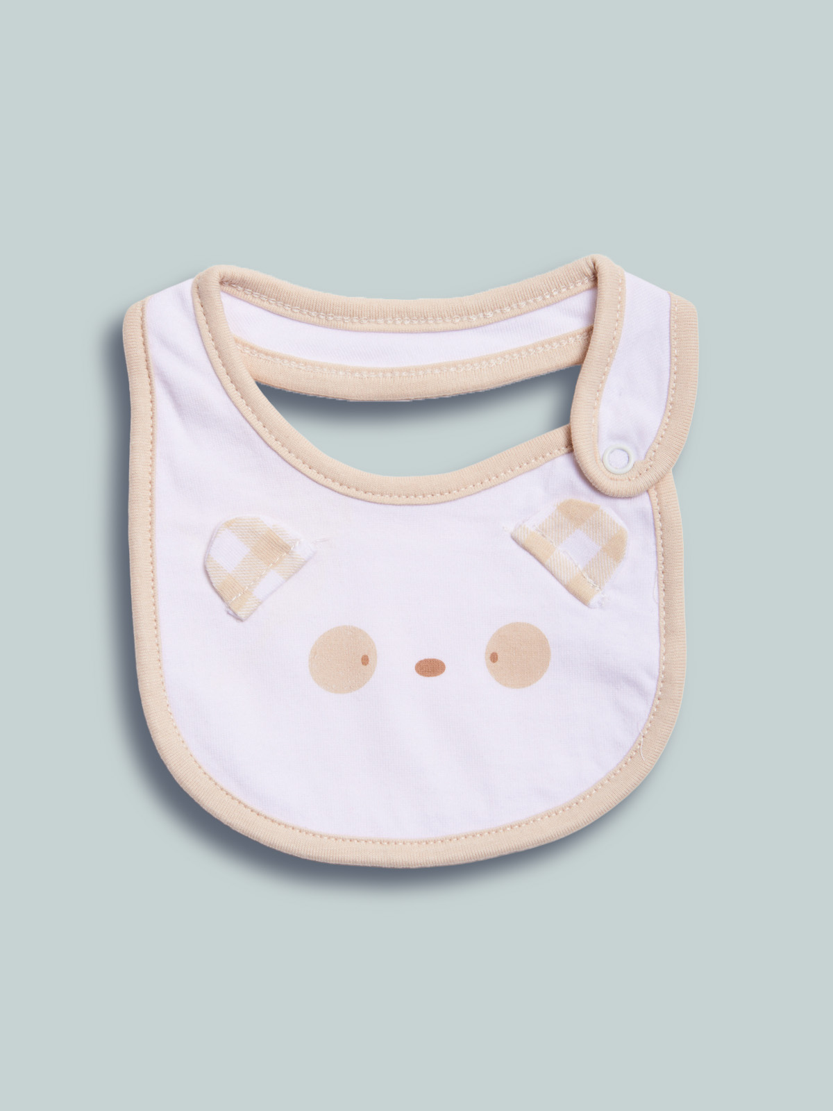 Bavetta in cotone decorato con stampa e orecchie 3D. Dotato di un pratico bottone a pressione sulla parte laterale per agevolarne l’indosso. Questo accessorio fa parte del corredino composto da tutti gli articoli indispensabili per il tuo neonato.