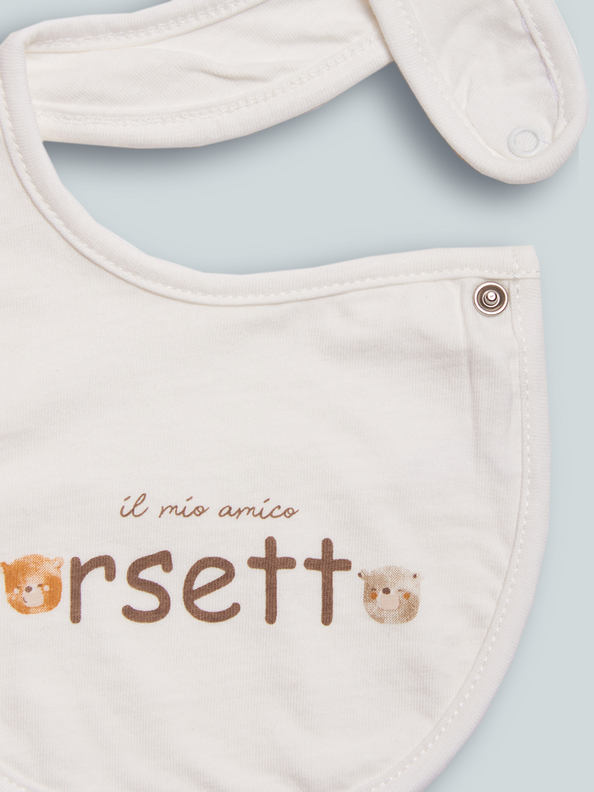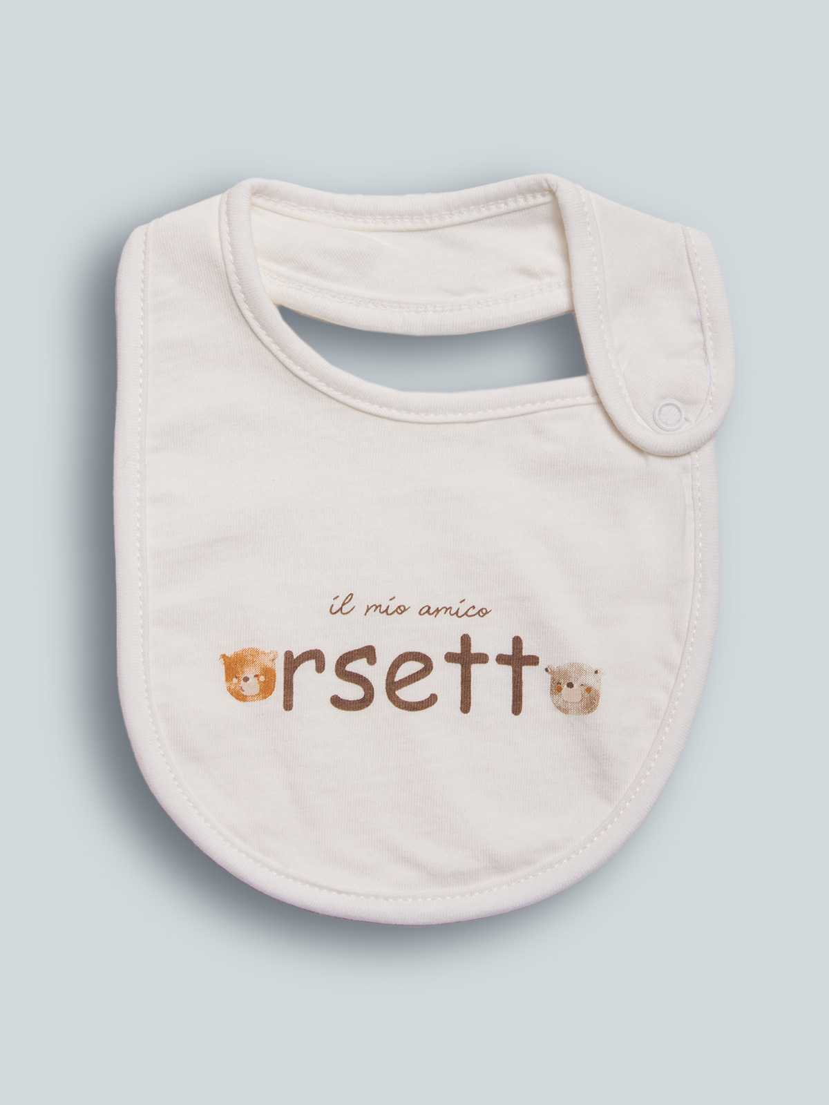 Morbido bavaglino doppiato in cotone. Apertura con bottone a pressione. Tenera stampa. Questo accessorio fa parte del corredino composto da tutti gli articoli indispensabili per il tuo neonato.
