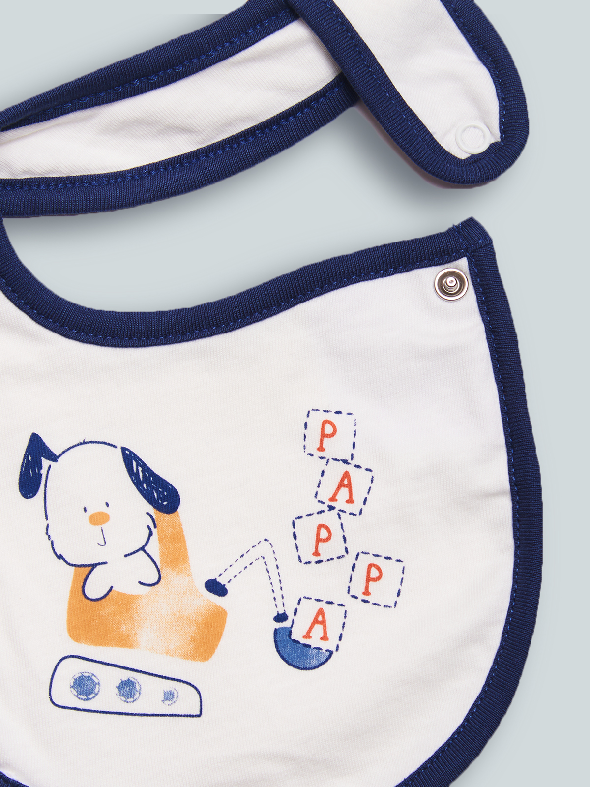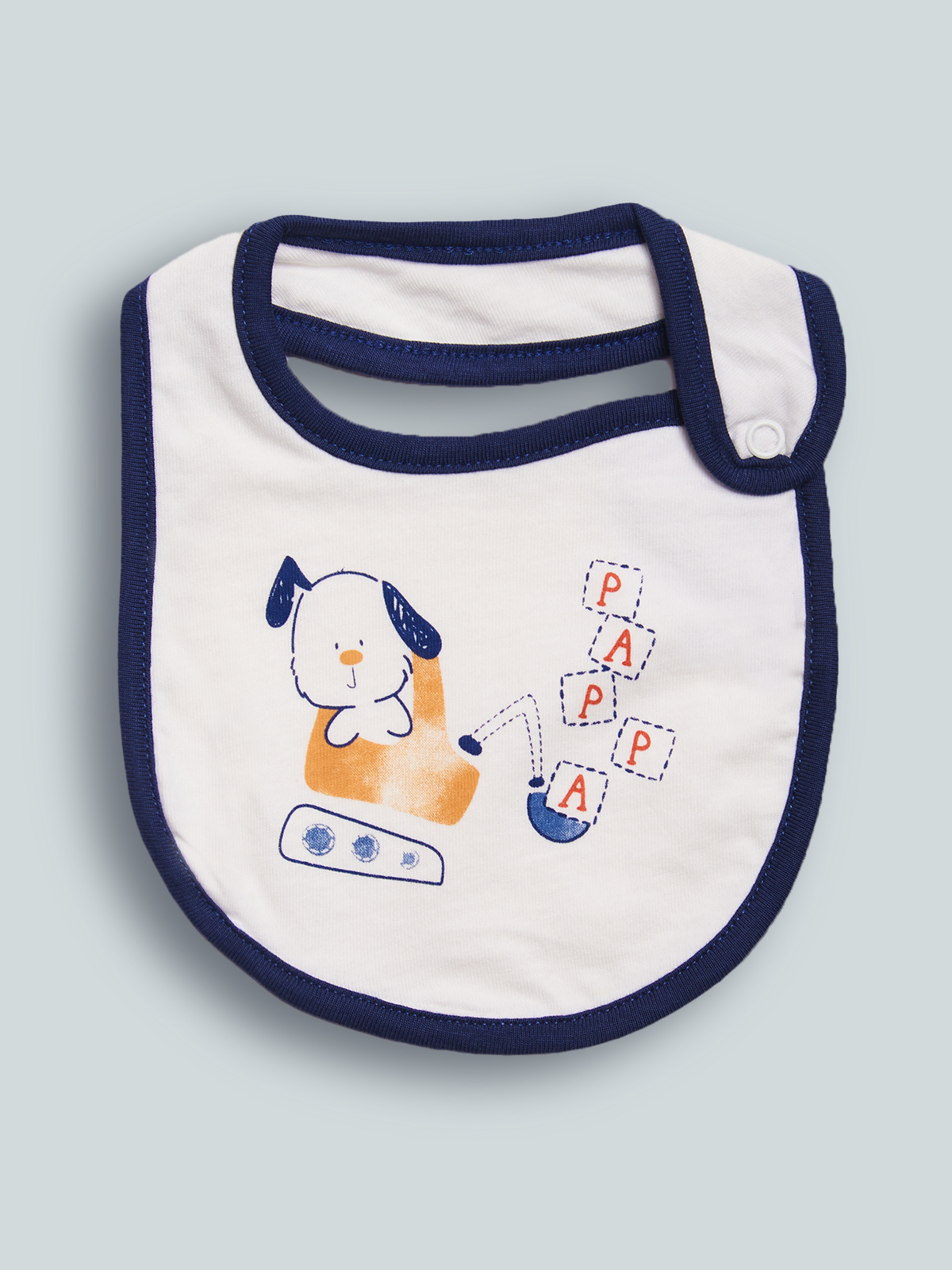 Morbido bavaglino doppiato in cotone e bordo contrasto. Apertura con bottone a pressione. Tenera stampa. Questo accessorio fa parte del corredino composto da tutti gli articoli indispensabili per il tuo neonato.