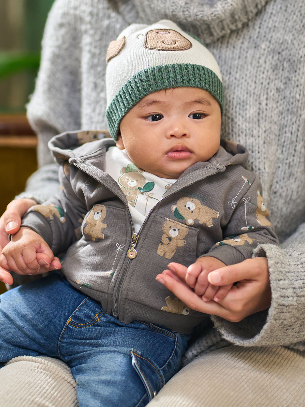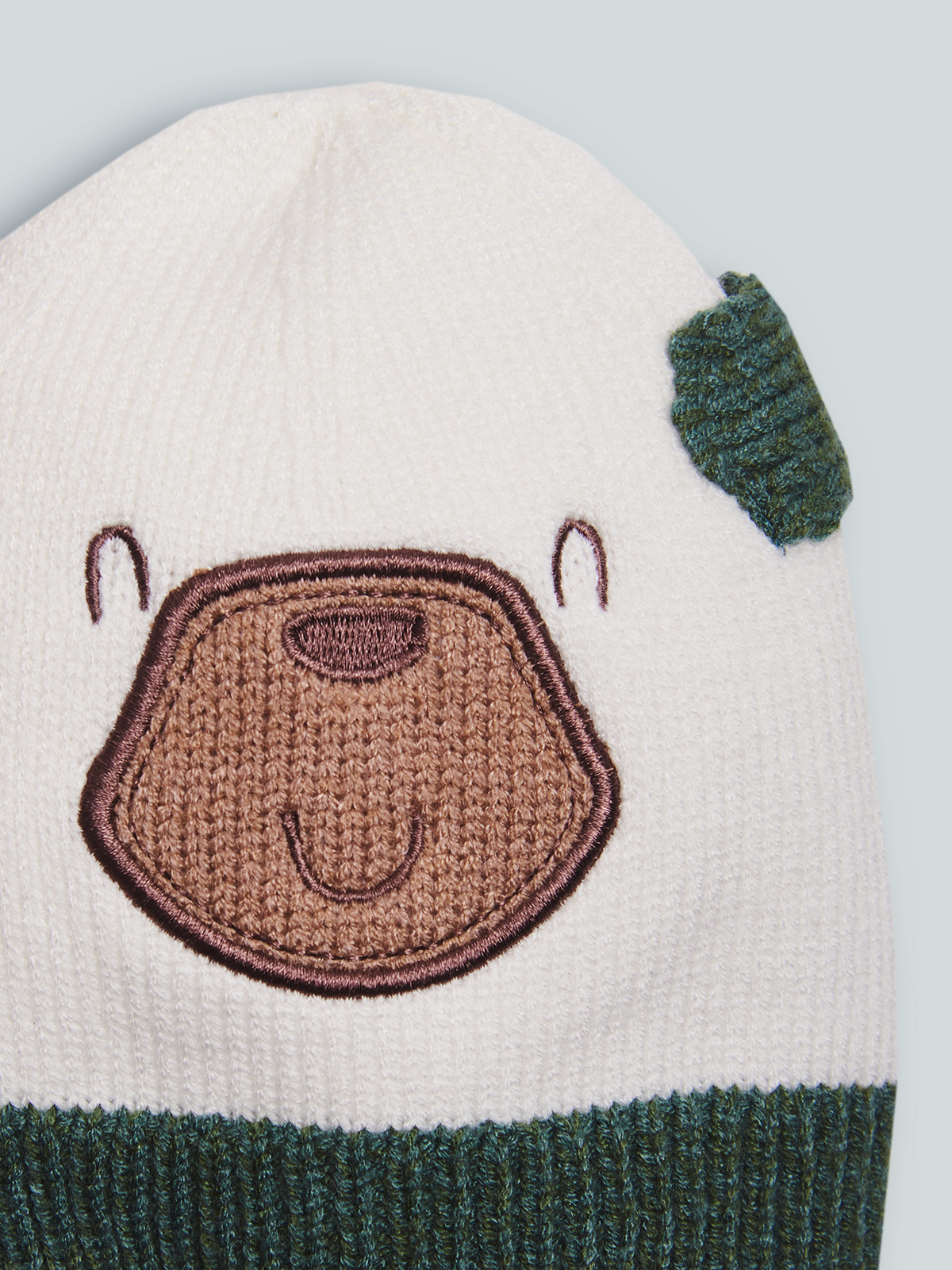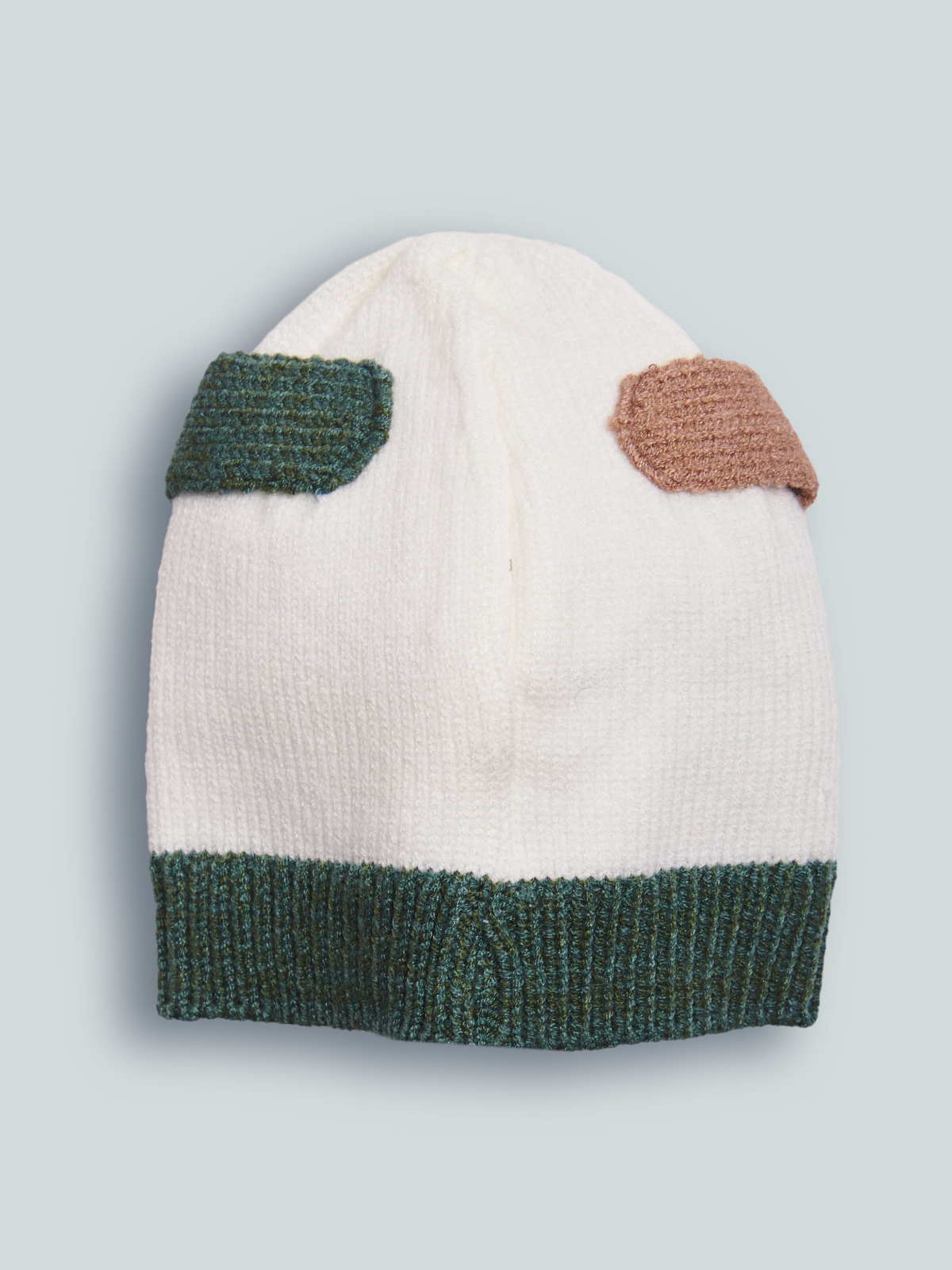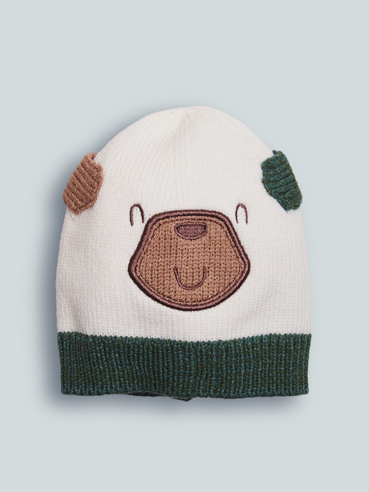 Cuffia neonato realizzata in morbido tricot, orecchie 3D e simpatico musetto. Facile abbinamento, ideale per le giornate fredde.