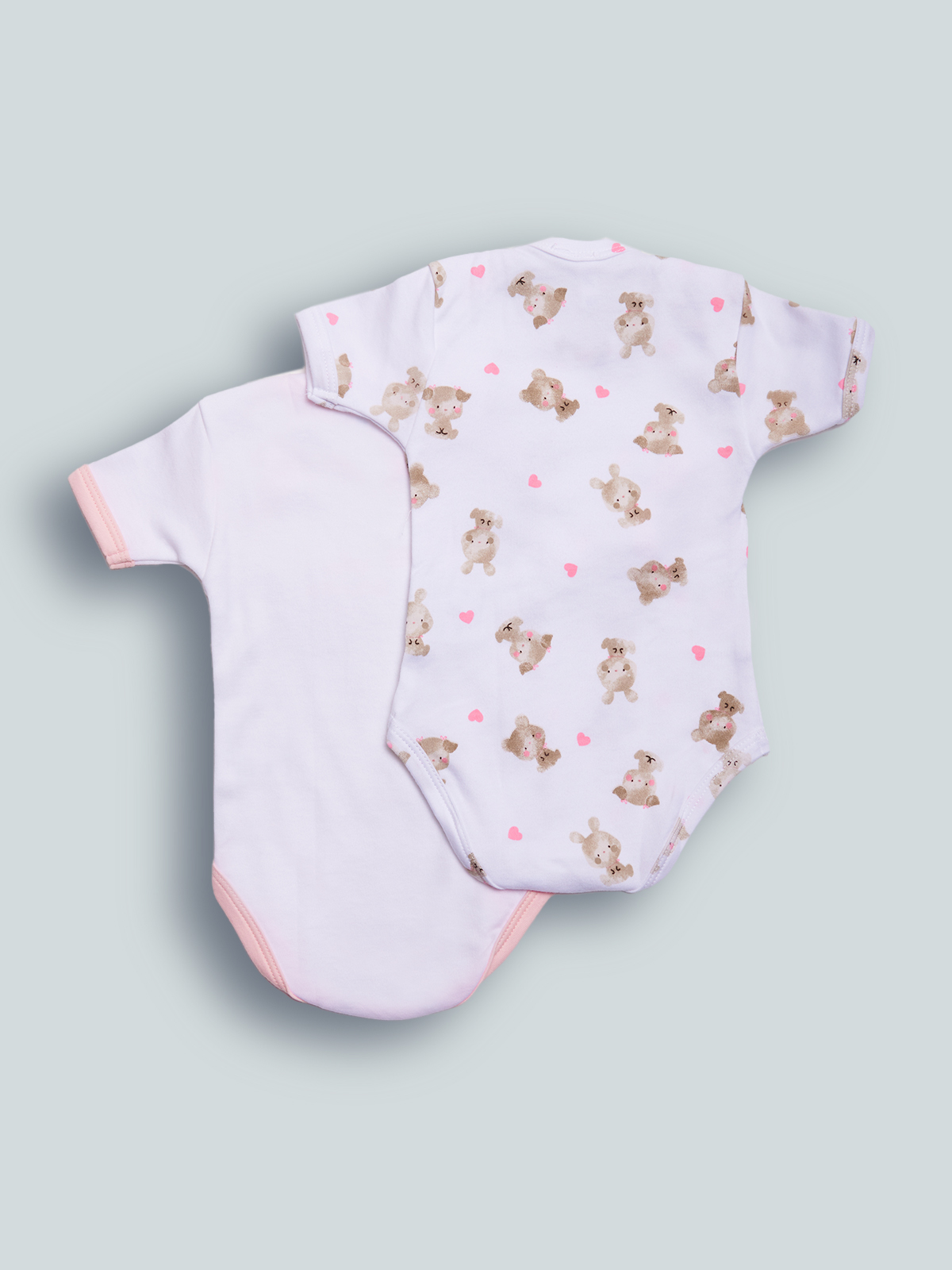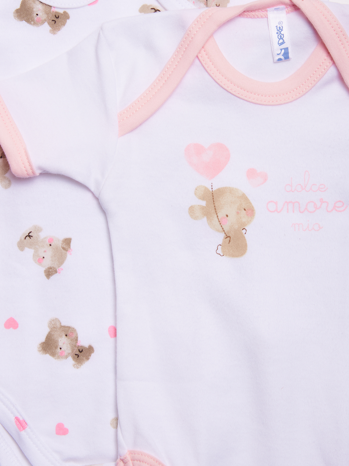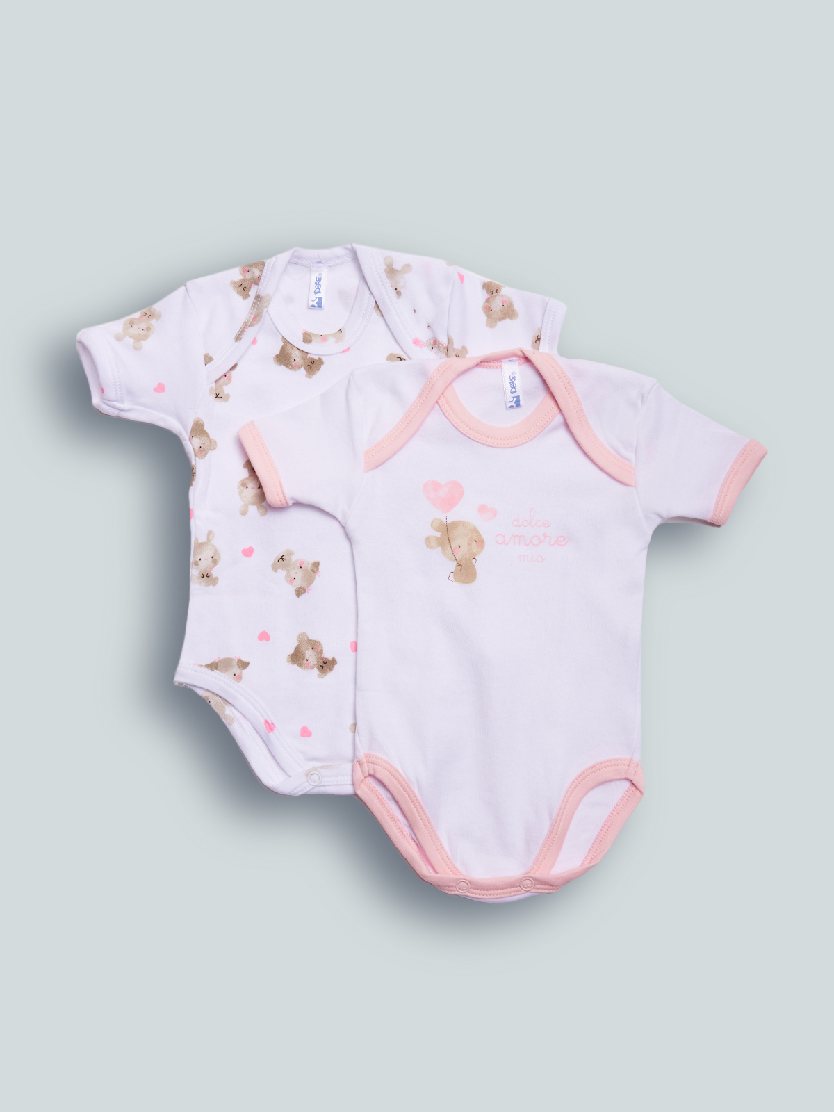 Set composto da due body in cotone garzato con scollo all’americana. Apertura al cavallo con pratici bottoncini a pressione. La confezione comprende due body uno tinta unita con grafica, il secondo fantasia sui toni del rosa.