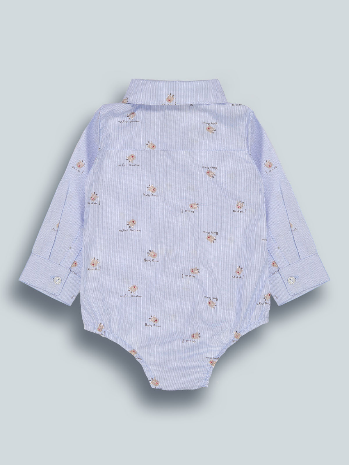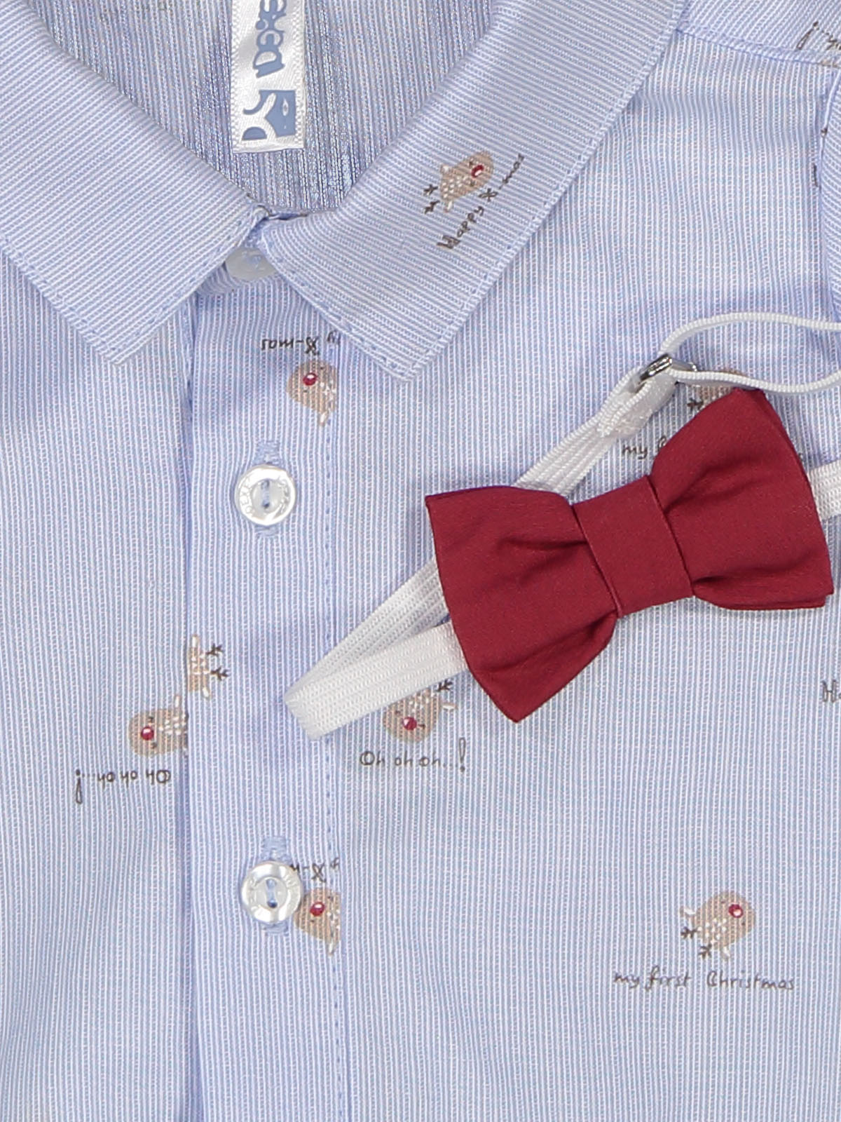 Camicia body in cotone rigato stampato fantasia natalizia, abbottonatura davanti e polsi con bottoni madreperla. Papillon removibile e regolabile abbinato. Un capo immancabile per le feste natalizie.