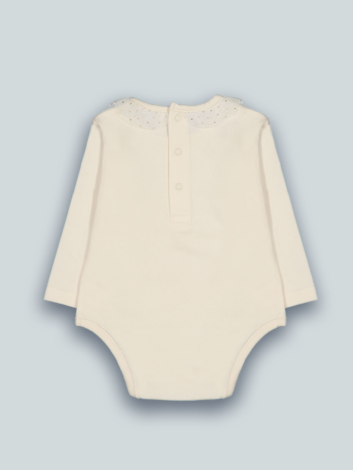 Body girocollo in caldo cotone elasticizzato, apertura sul dietro ed entrogamba con bottoncini a pressione per facilitarne l’indosso. Girocollo rifinito da rouches in tulle stampato glitter rendono il capo essenziale per ogni tipo di look.