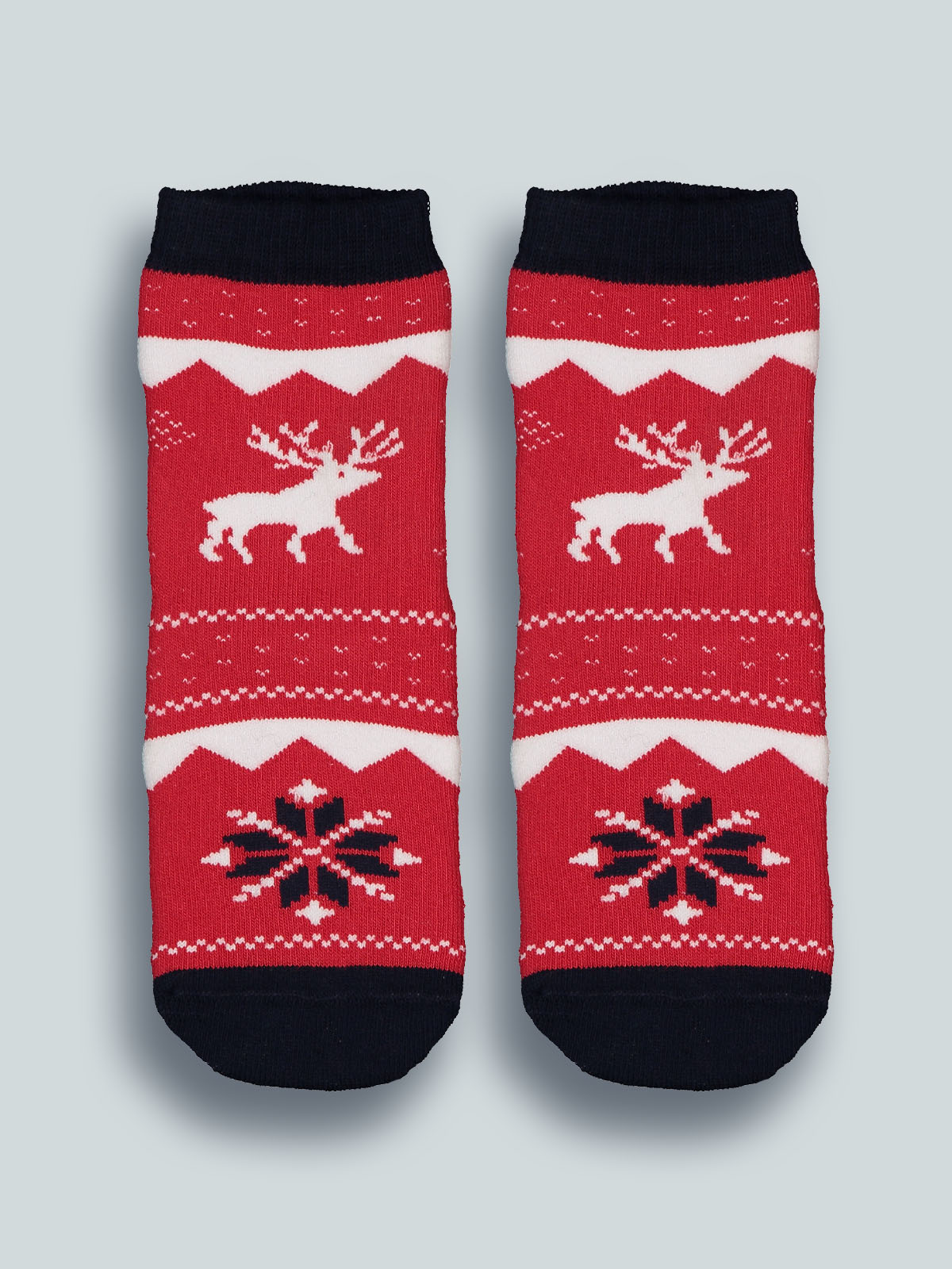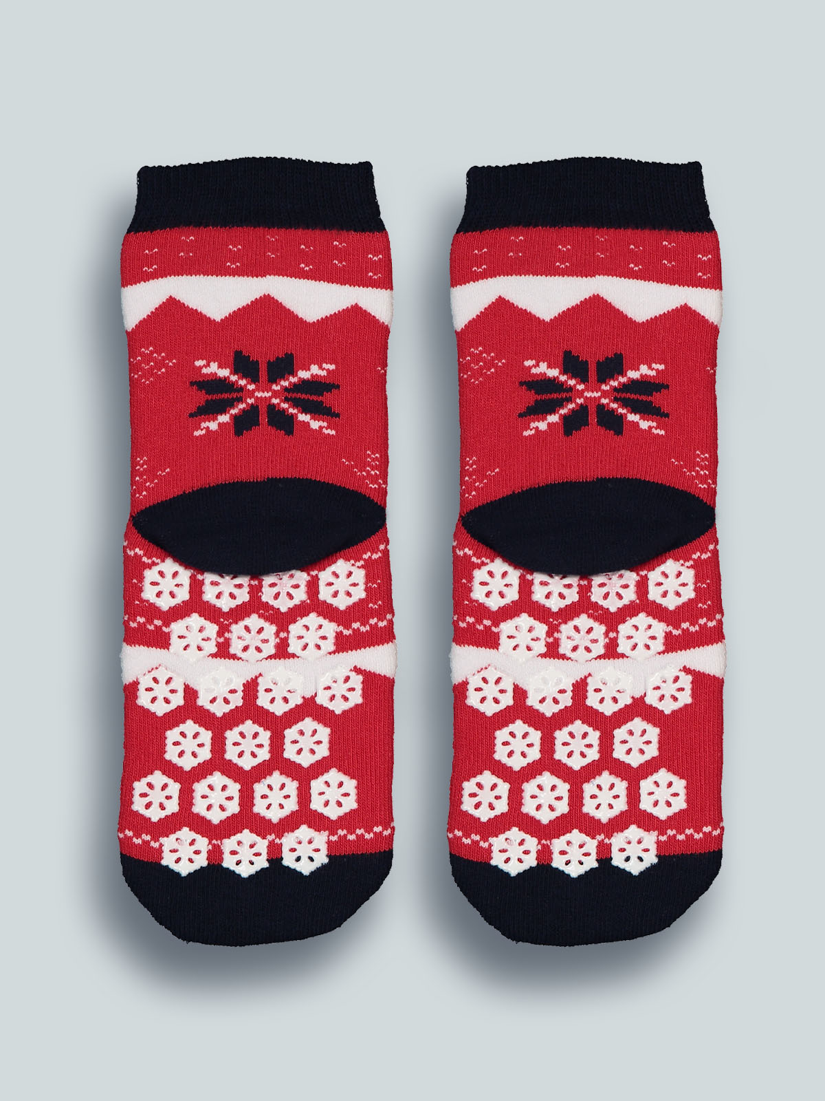 Calze antiscivolo in spugna in fantasia a tema natalizio. I fiocchi di neve in gomma antiscivolo sulla pianta del piede permettono al vostro bambino di scorrazzare per casa in piena libertà. Un’idea regalo perfetta per il Natale.