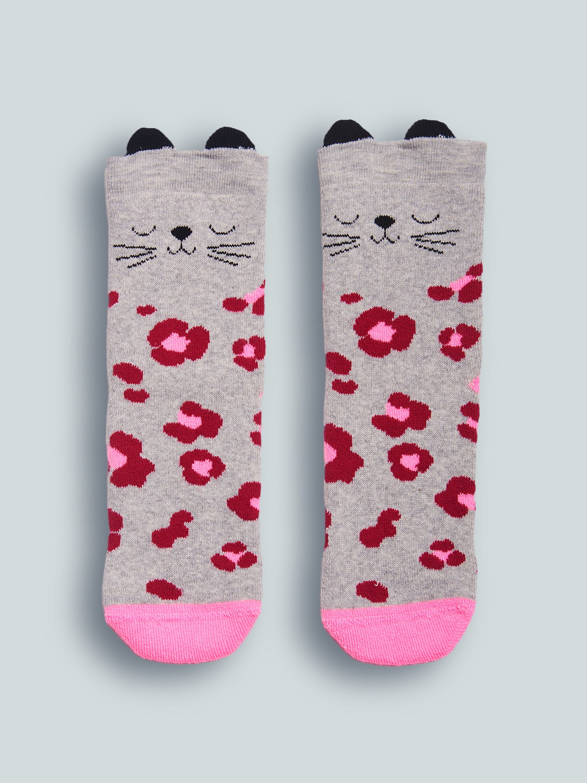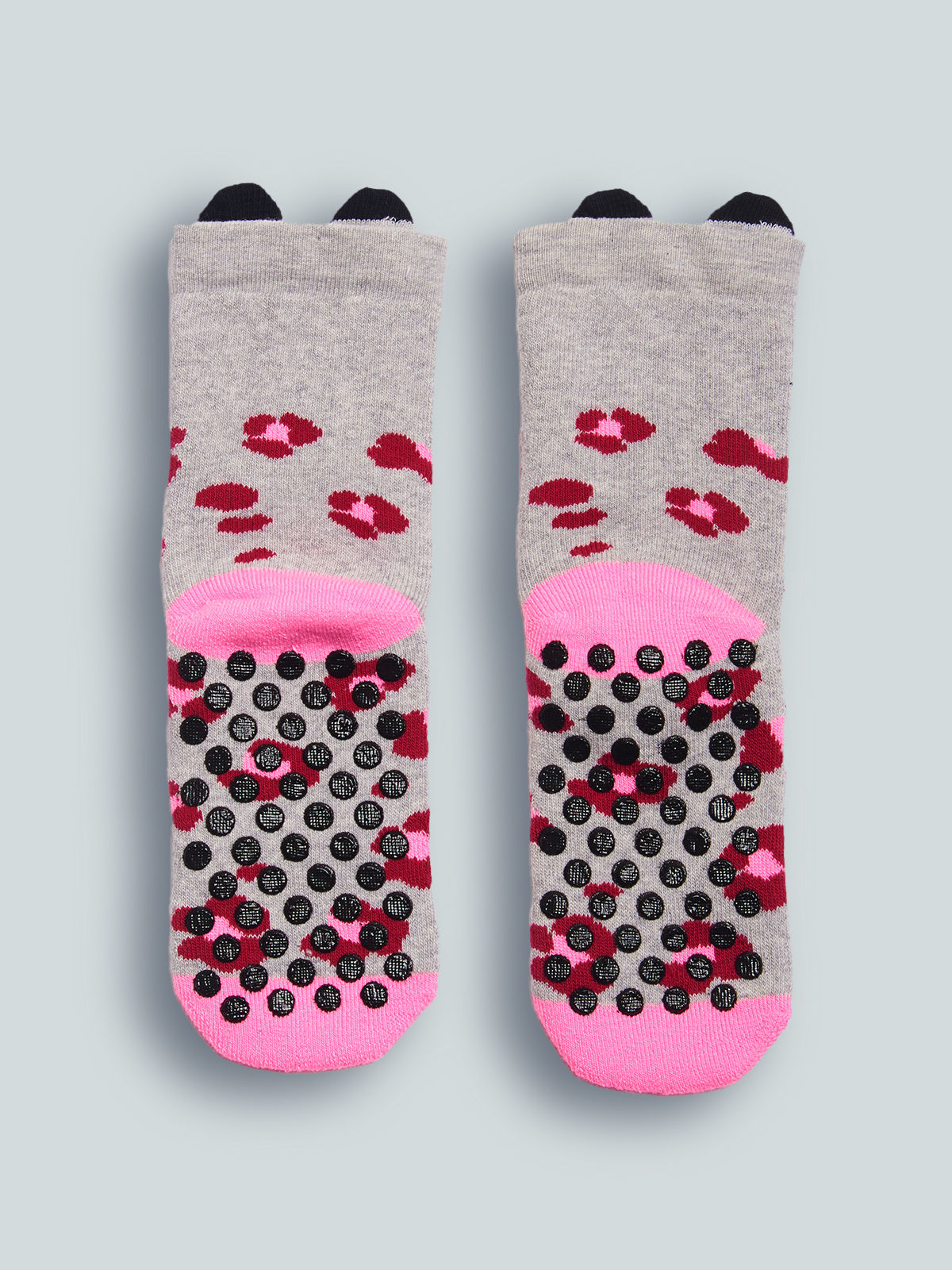 Calzini antiscivolo in Morbido Misto cotone Melange. Simpatico gattino con orecchie e fantasia Maculato. Pratici gommini antiscivolo sulla pianta del piede. Ideali da tenere in casa per le giornate fredde.