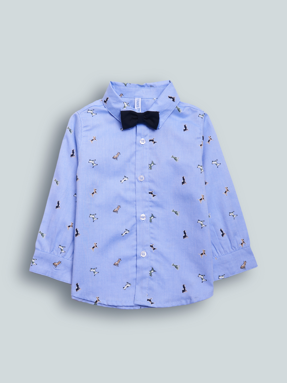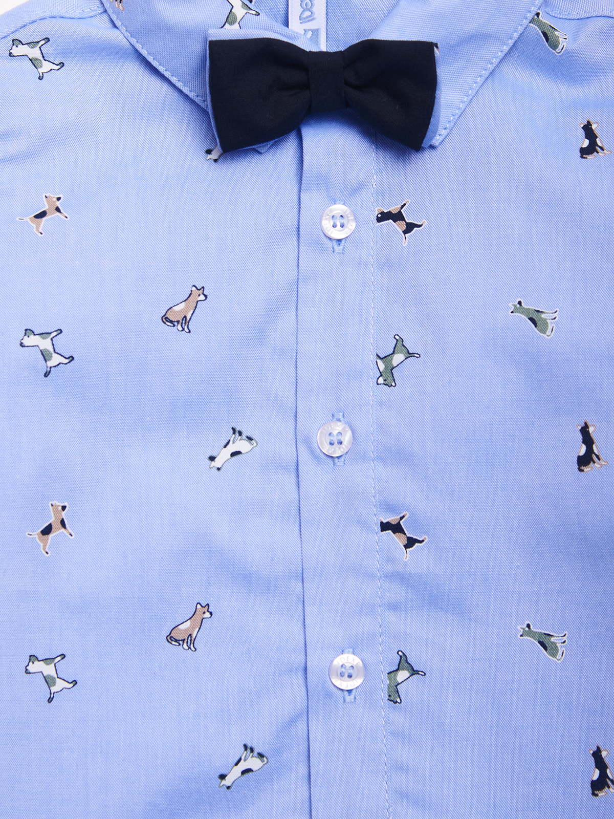 Camicia elegante a Manica lunga in oxford azzurro fantasia. Apertura davanti e polsini con bottoni effetto Madreperla. Papillon removibile e regolabile incluso, per un look in perfetto stile dandy.