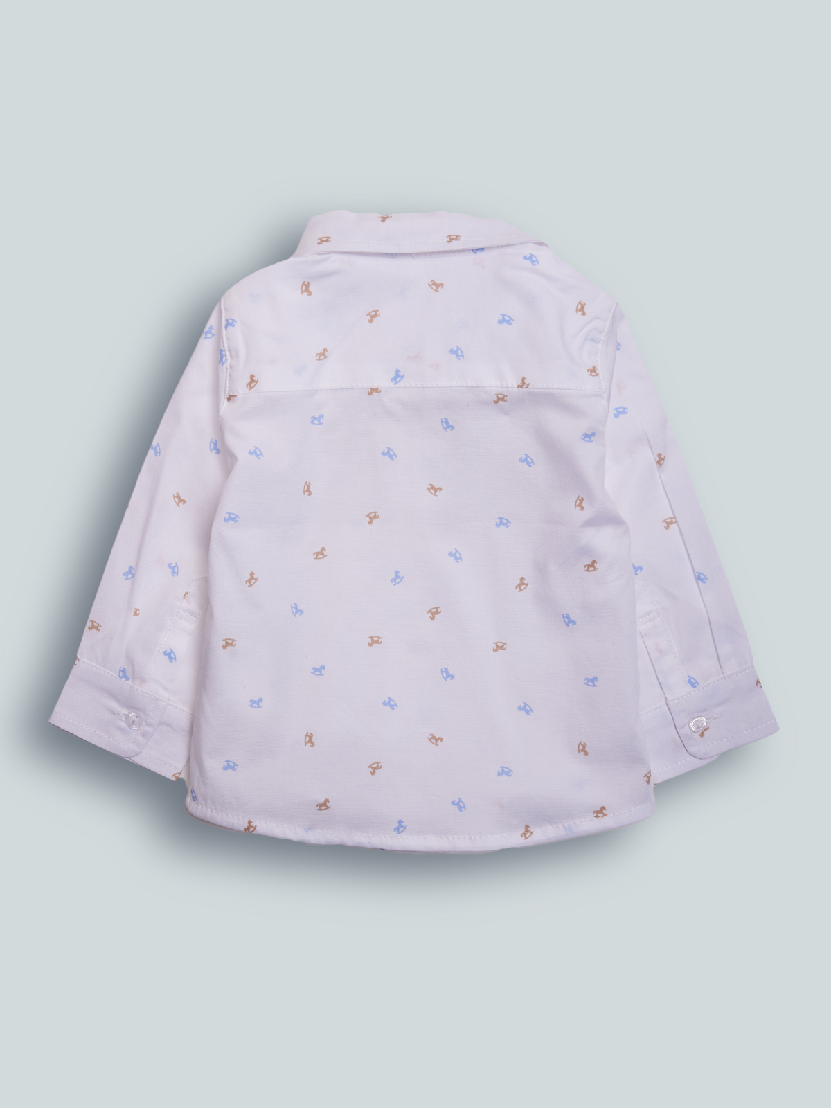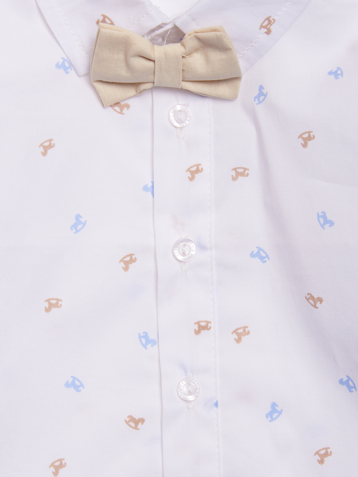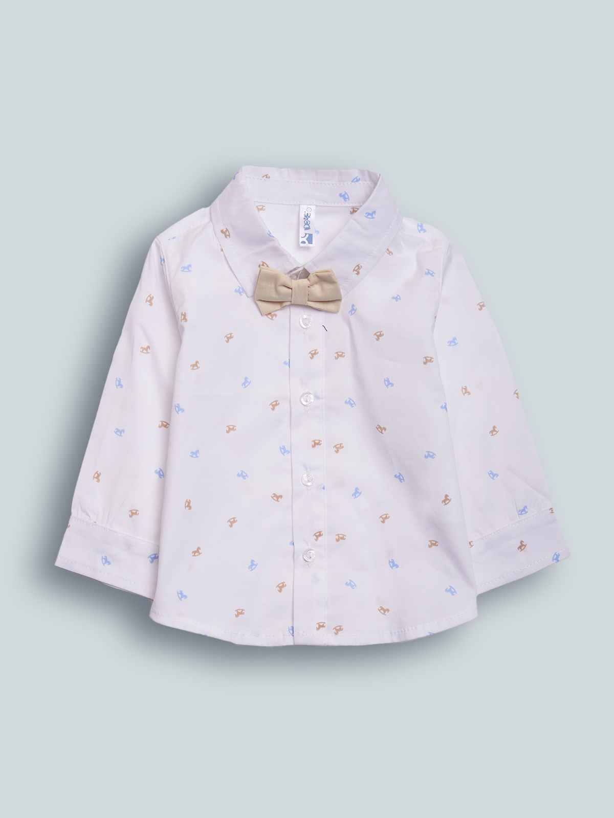 Camicia in Mussola elasticizzata stampato fantasia, abbottonatura davanti e polsi con bottoni Madreperla. Papillon removibile e regolabile abbinato. Il capo ideale per le occasioni speciali.