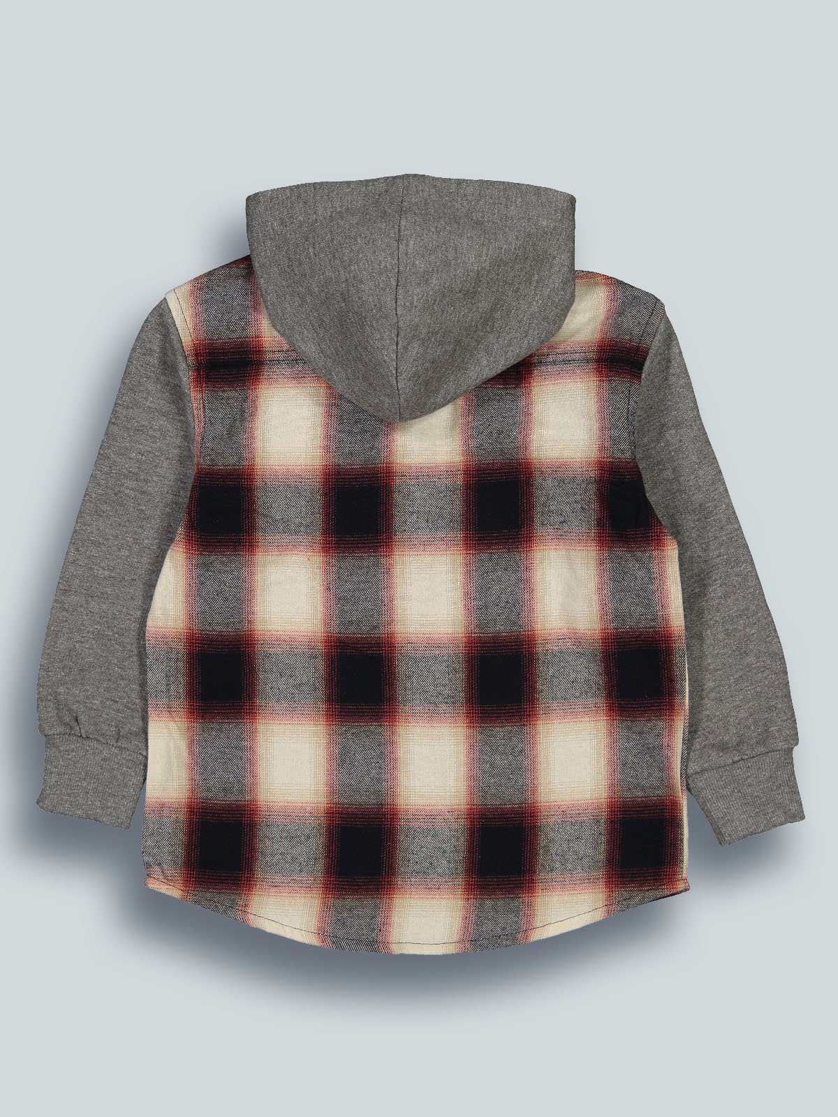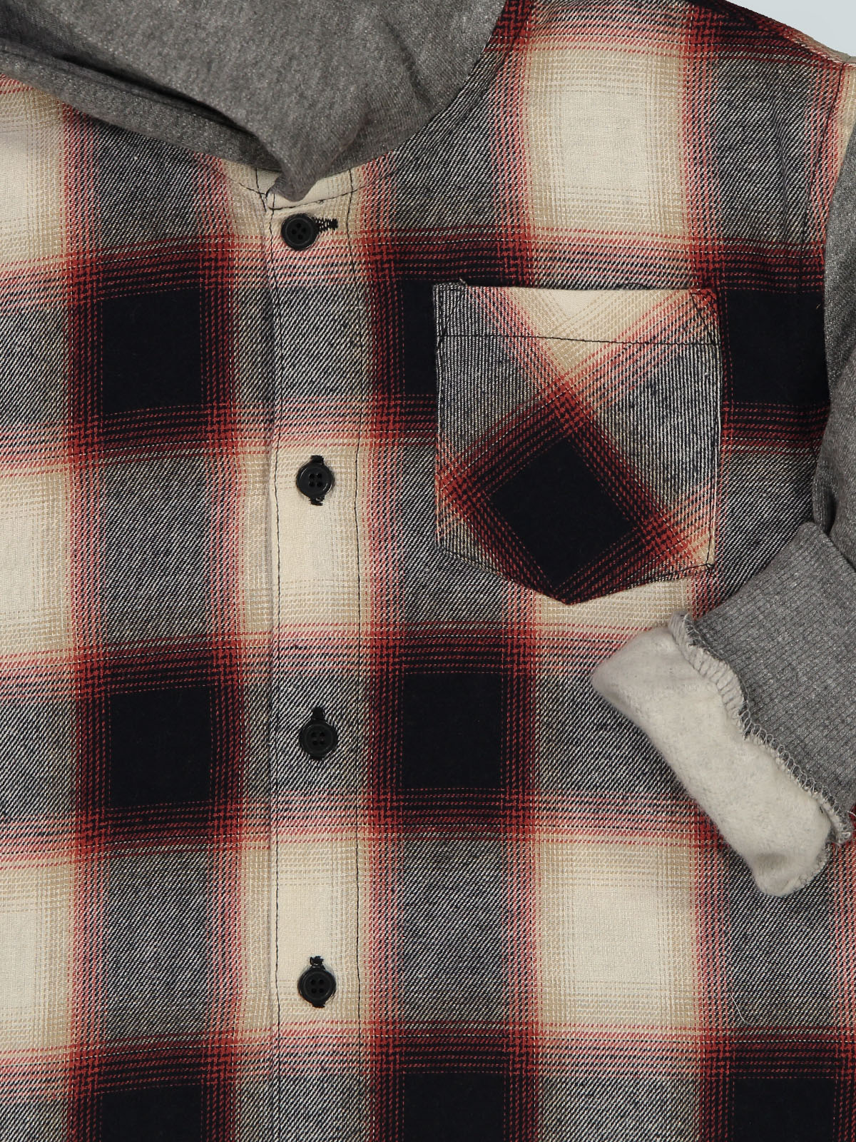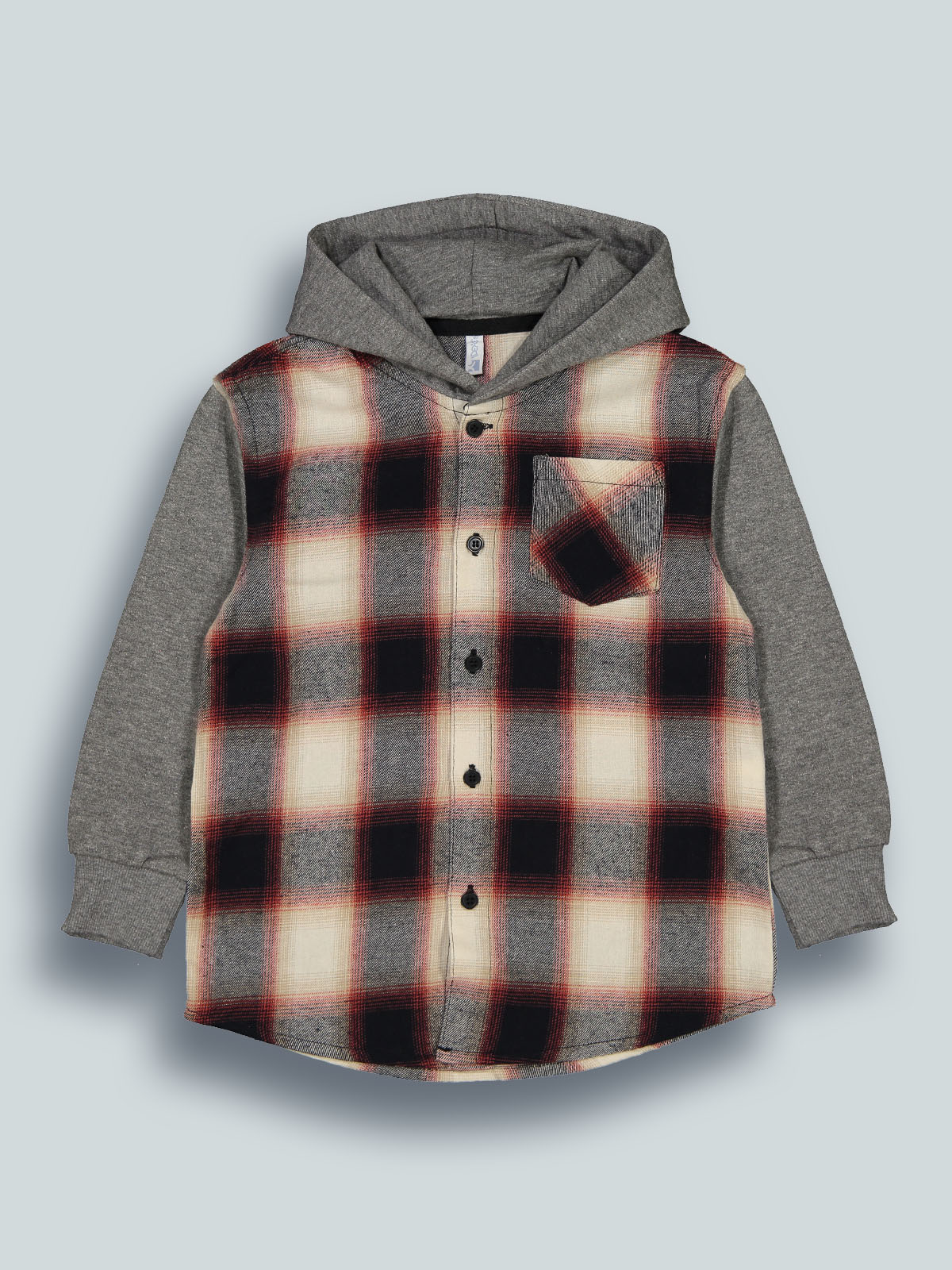 Camicia in flanella leggera fantasia scozzese, cappuccio e maniche in felpa melange. Apertura davanti con bottoncini, taschino sul petto. Perfetta indossata aperta, sopra una t-shirt, per un look super trendy.