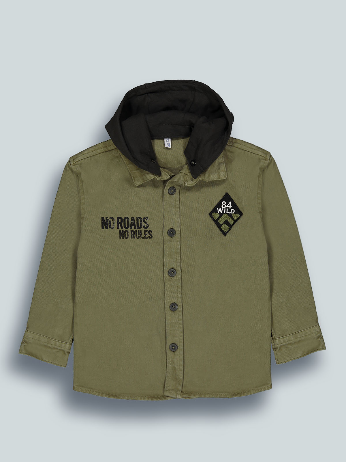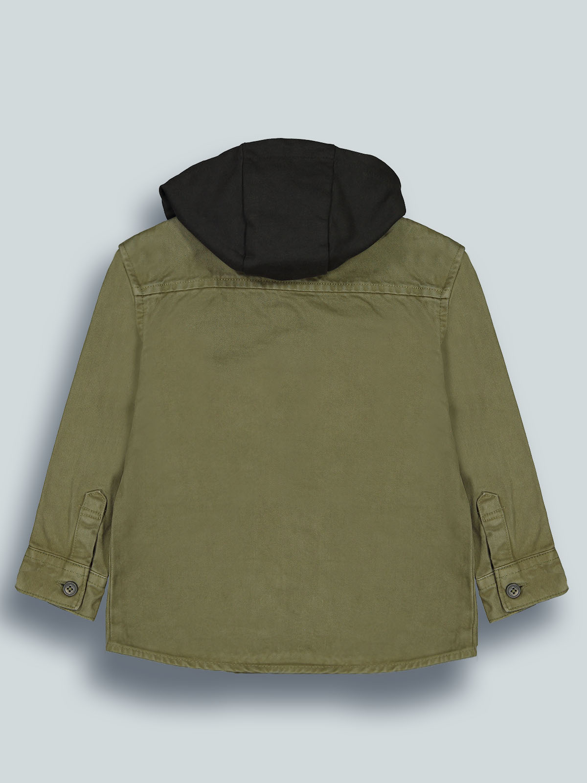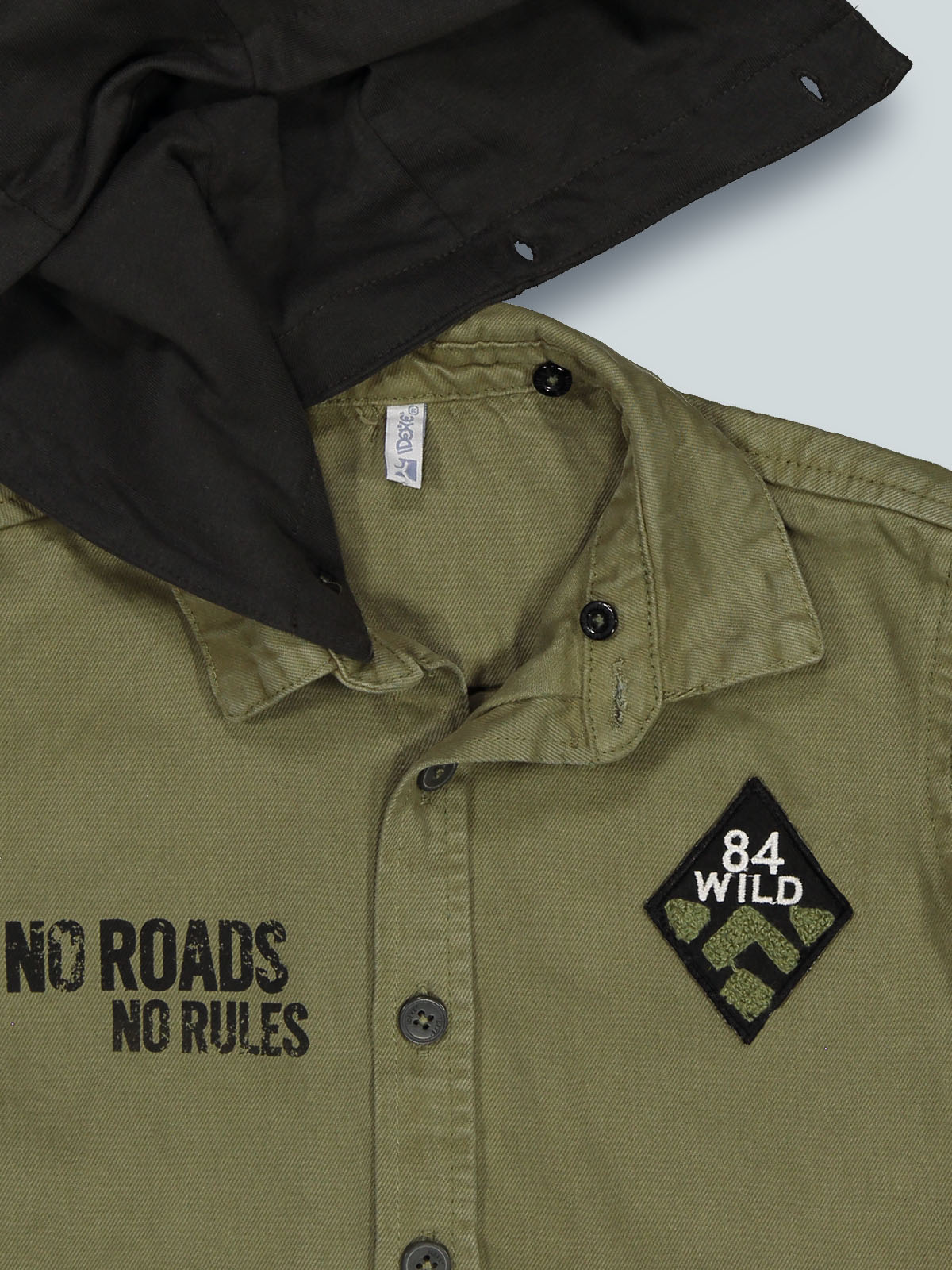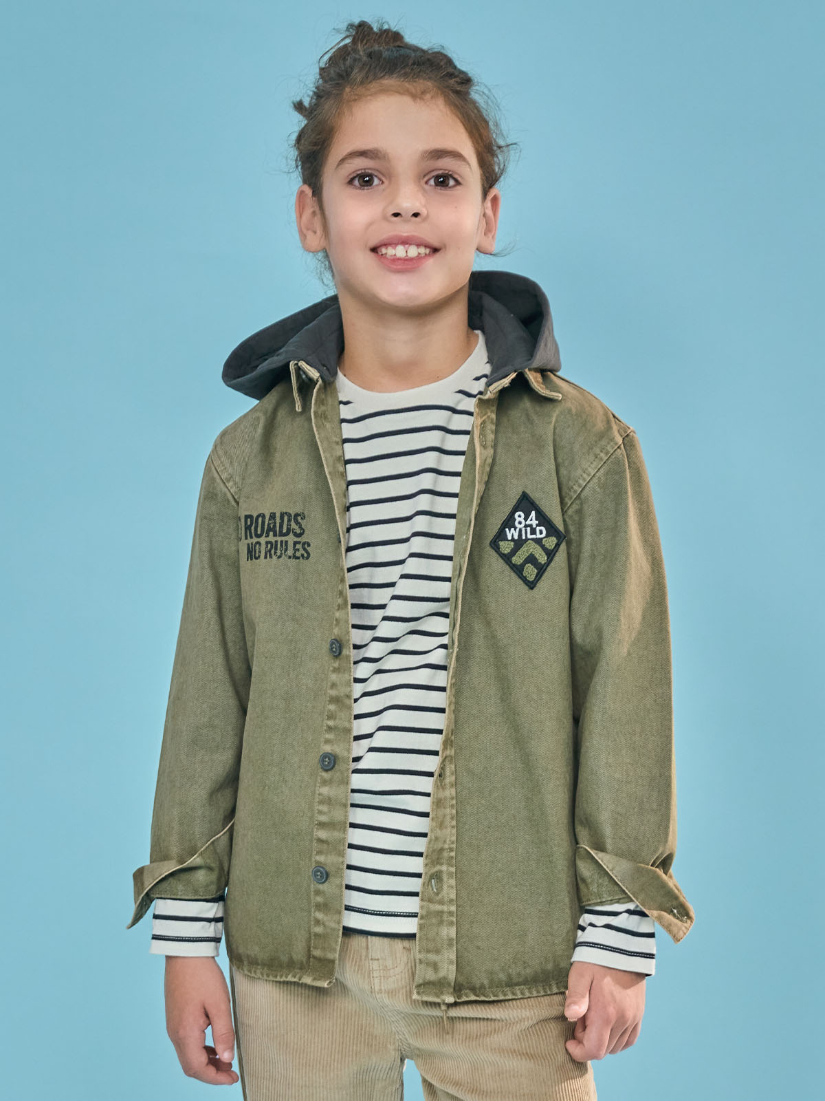 Camicia in drill vestibilità over con cappuccio staccabile in felpa e jersey. Apertura davanti e polsi con bottoni, stampa ed etichetta davanti. Lavaggio effetto vissuto. Un capo versatile, da indossare chiusa oppure in versione giacca sopra una t-shirt.
