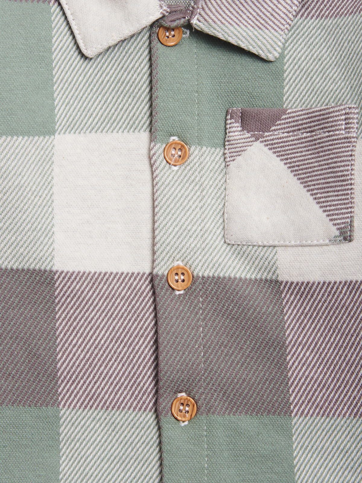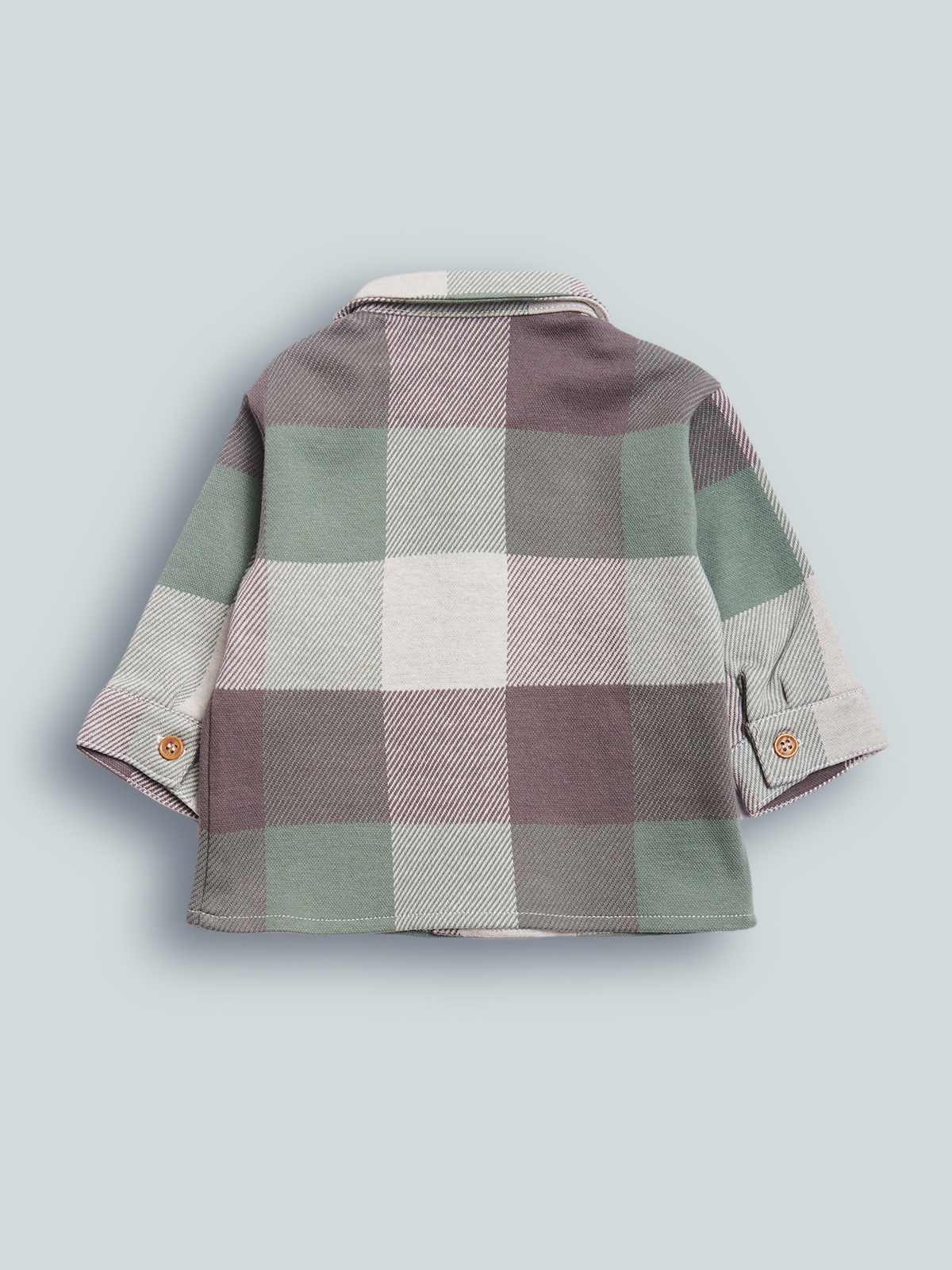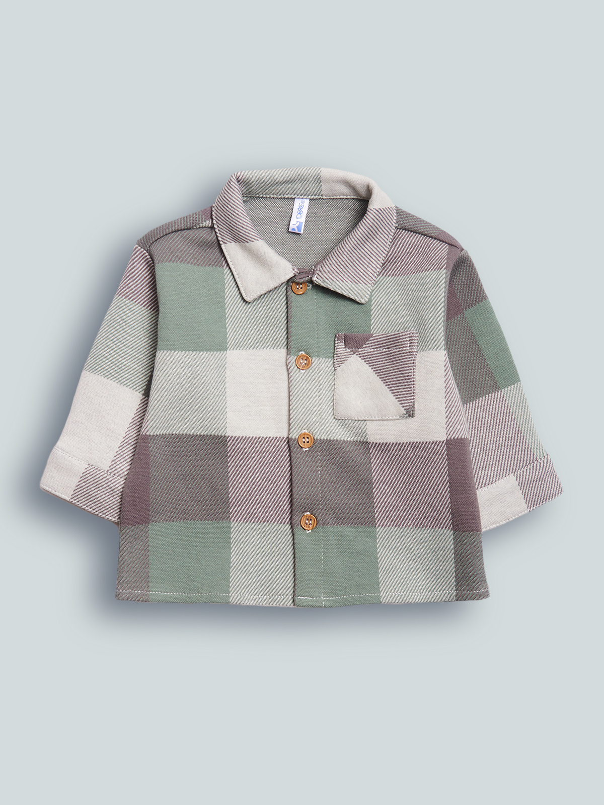Camicia modello oversize con spalla scesa, in maglia jaquard scozzese. Abbottonatura frontale con bottoni finto legno. Tasca applicata sul petto. Un “must have” che non può mancare nell’armadio dei vostri neonati.
