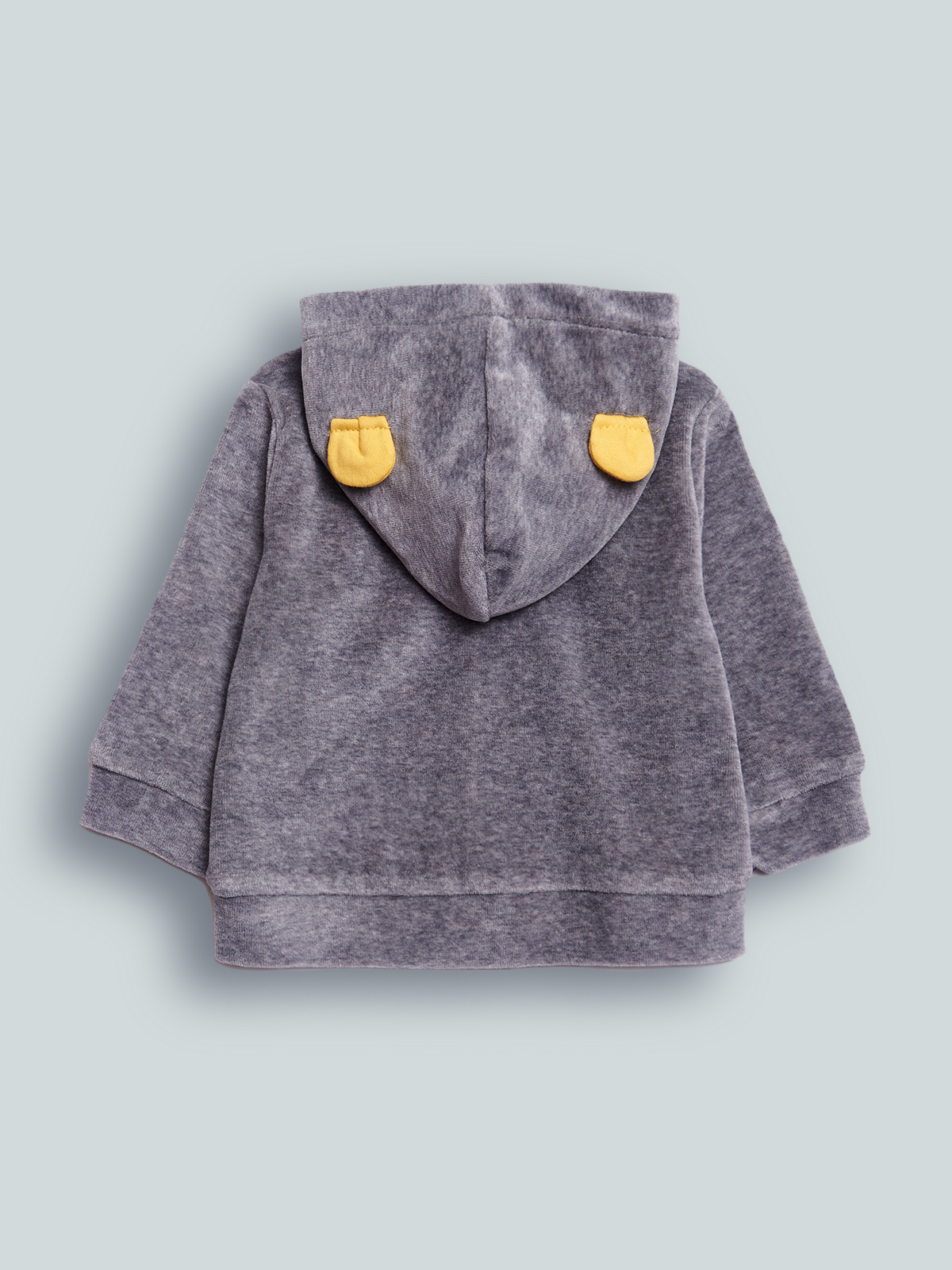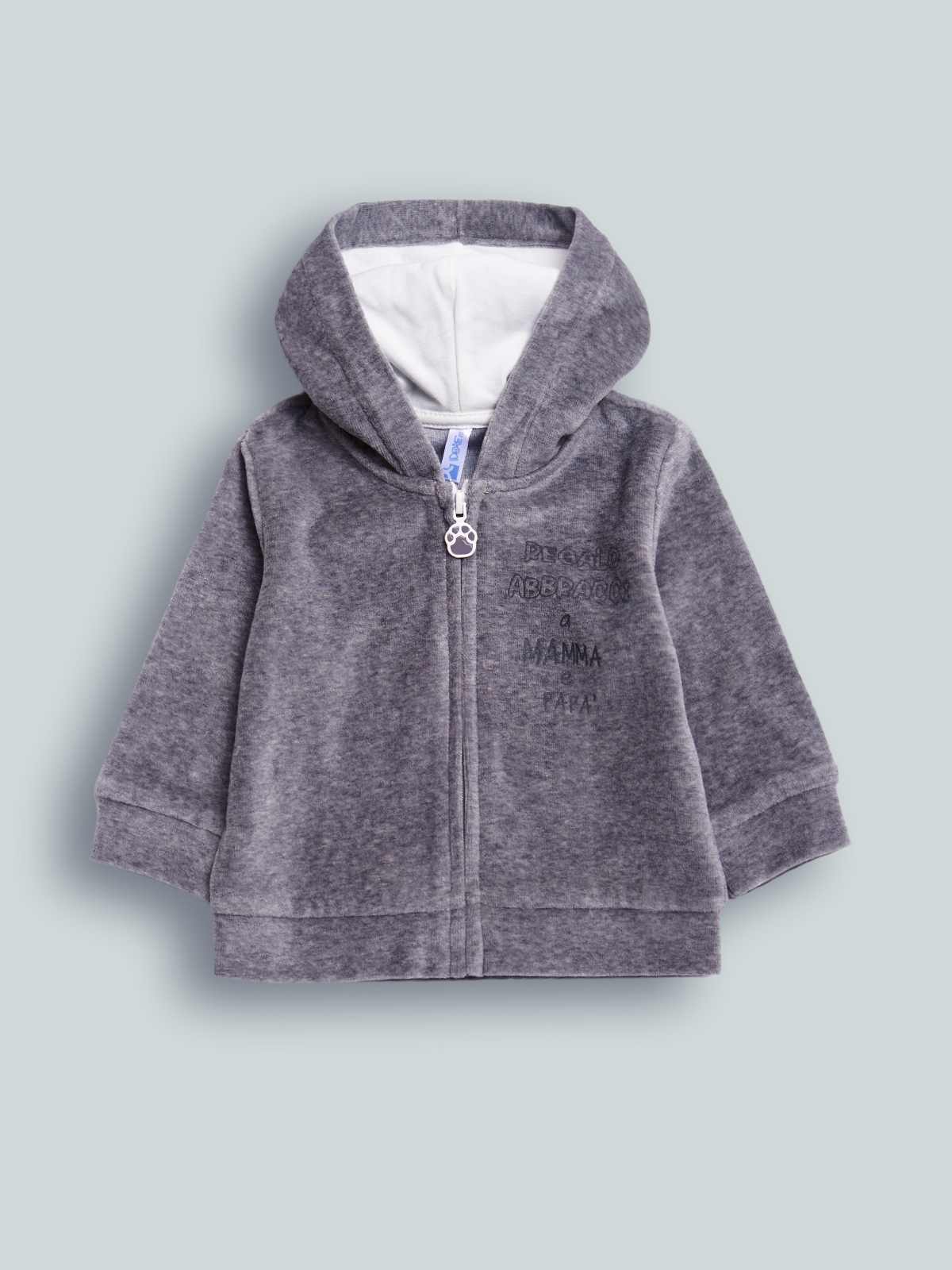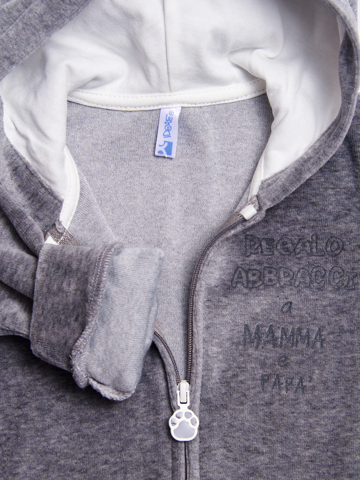 Cardigan in Morbida ciniglia grigio Melange, apertura frontale con zip e cursore personalizzato. Cappuccio e orecchie 3D. Stampa sul davanti. Un neonato “cool”, allo stesso tempo comodità e confort in un solo capo.