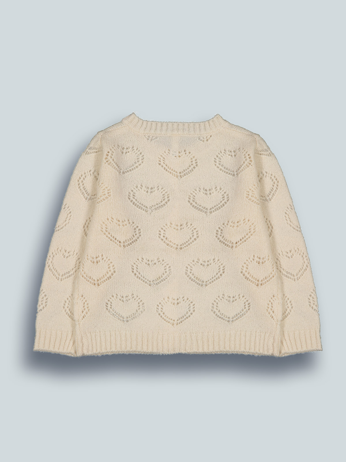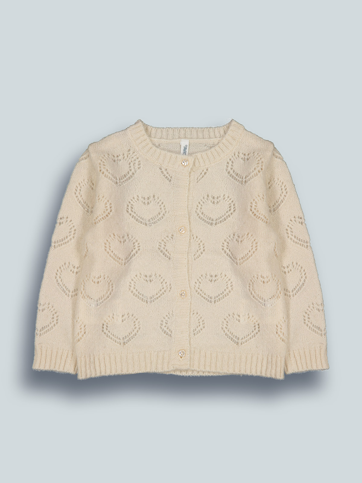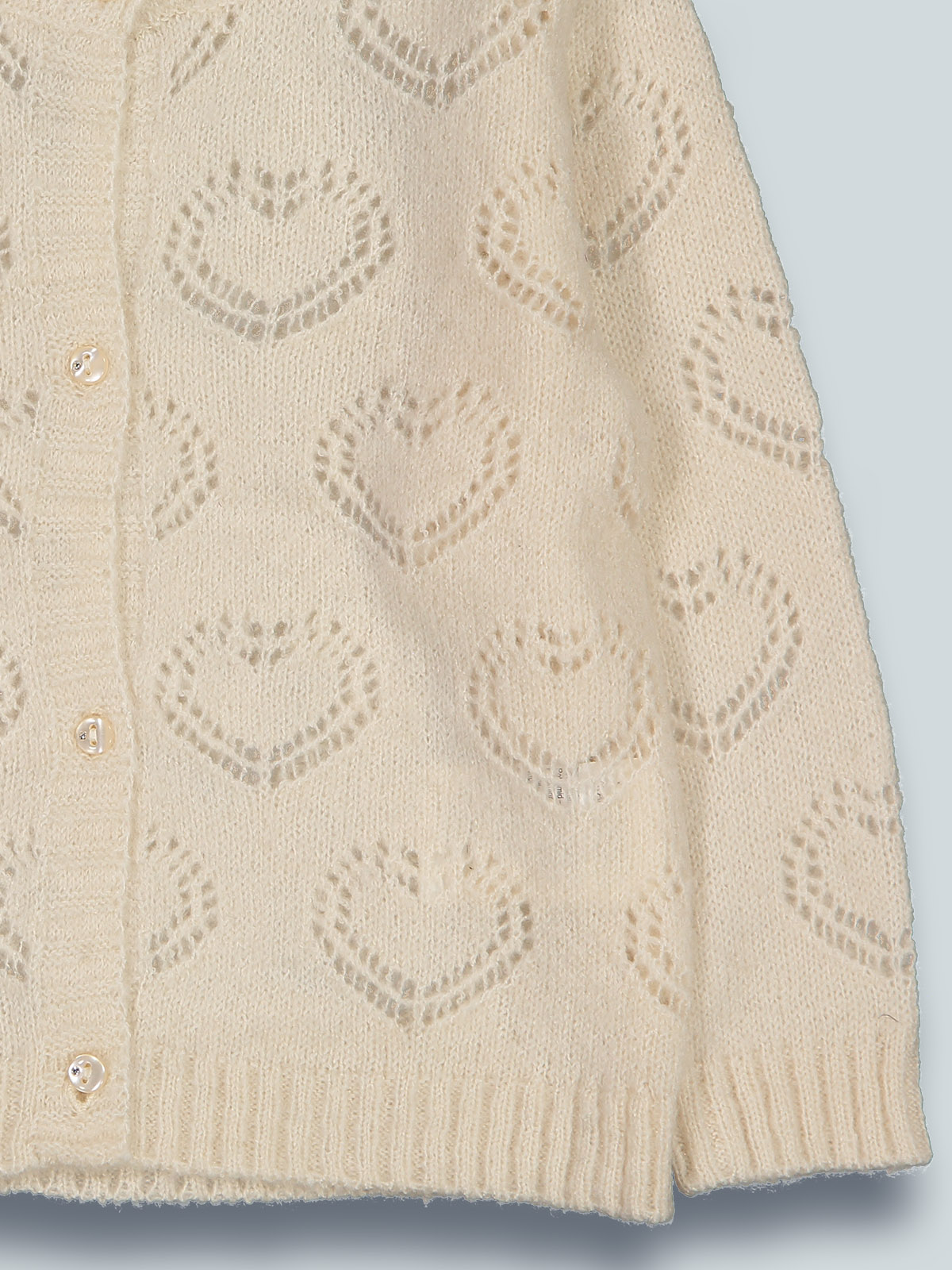 Cardigan in maglia di morbido cotone con lavorazione cuori, manica lunga. Pratica apertura frontale con bottoni. Un capo caldo e alla moda, perfetto in mille occasioni e indispensabile per i primi freddi di stagione.