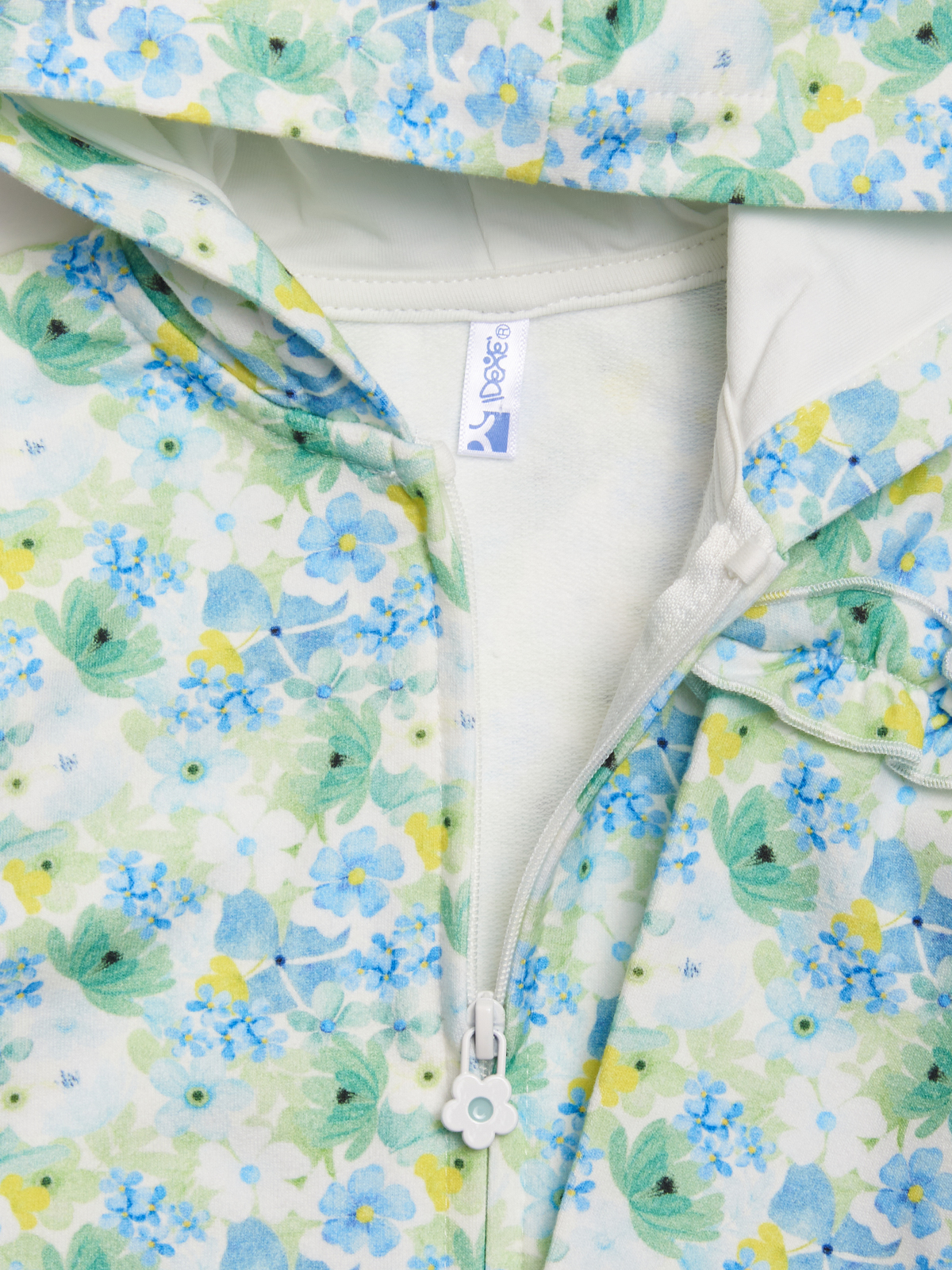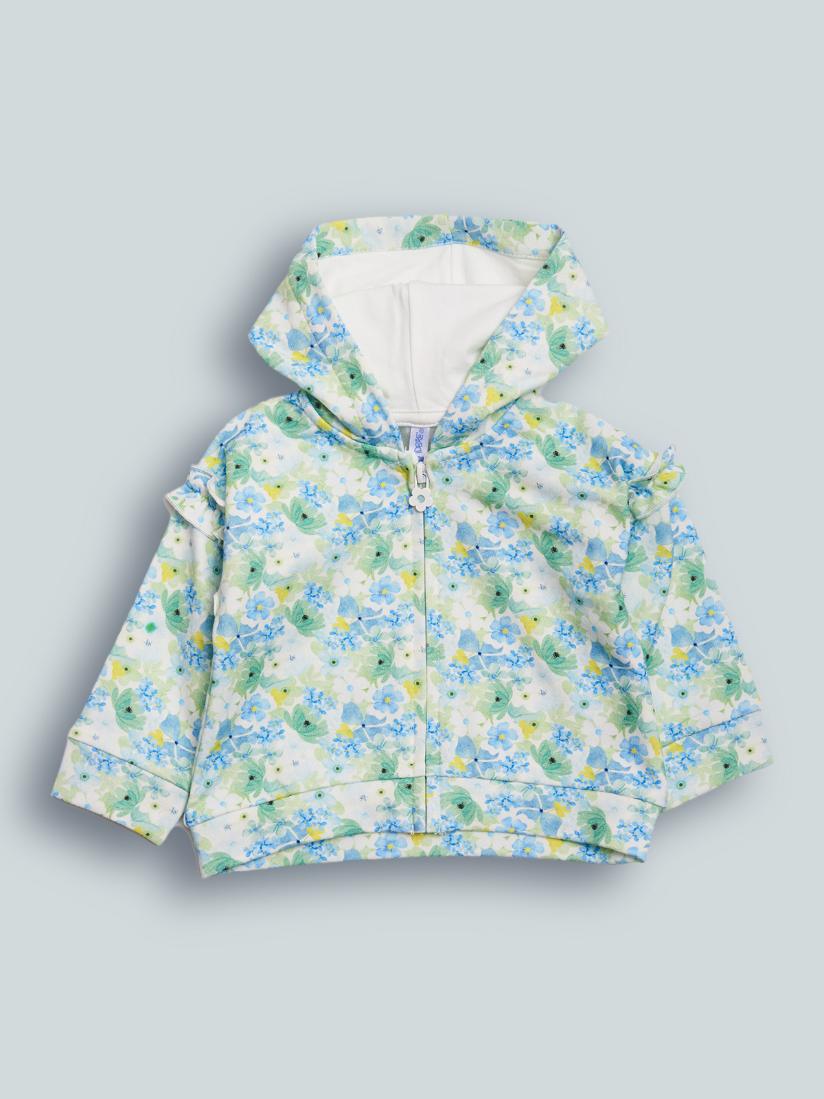 Cardigan in felpa leggera elasticizzata stampato fantasia floreale. Apertura frontale con zip e cursore personalizzato. Spalla scesa decorate da rouches completano questo Must-have del guardaroba, da usare in qualsiasi occasione!