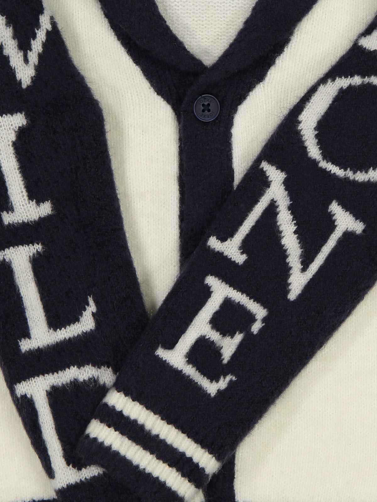 Cardigan in caldo e morbido tricot bicolore, modello con collo sciallato e abbottonatura davanti. Scritte jacquard su maniche. Un capo molto caldo ideale da indossare nella stagione invernale.