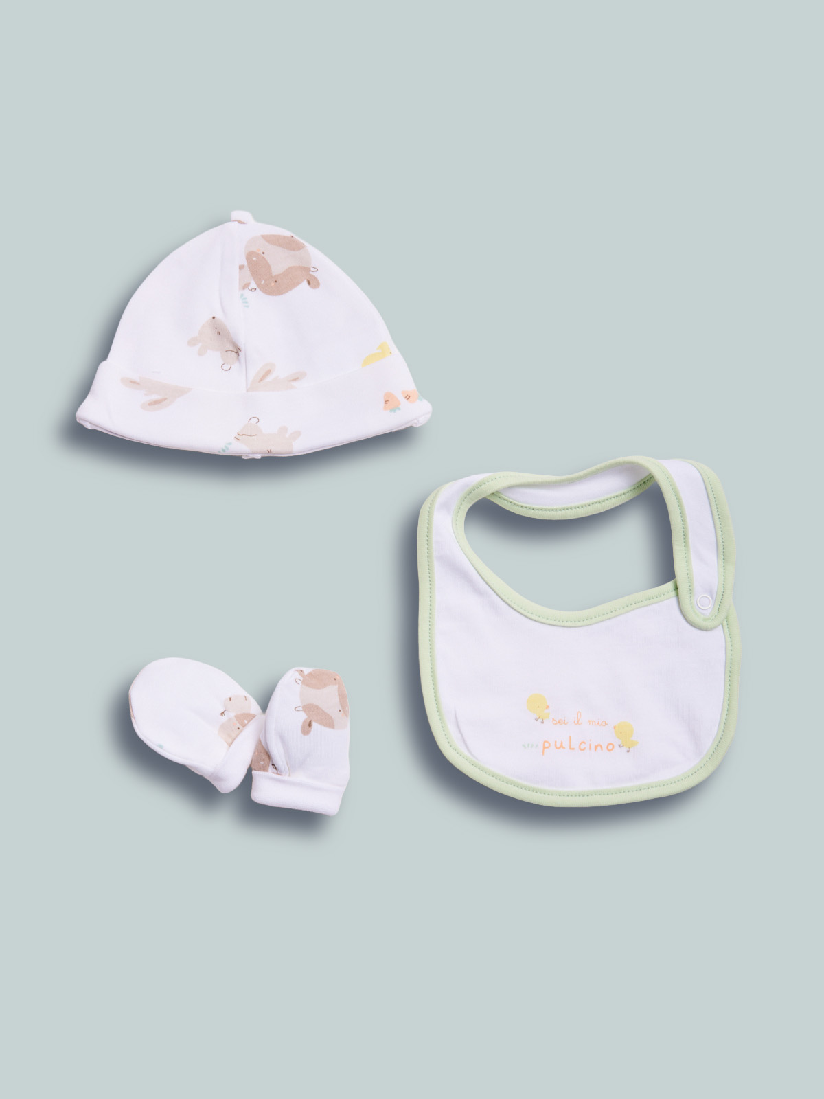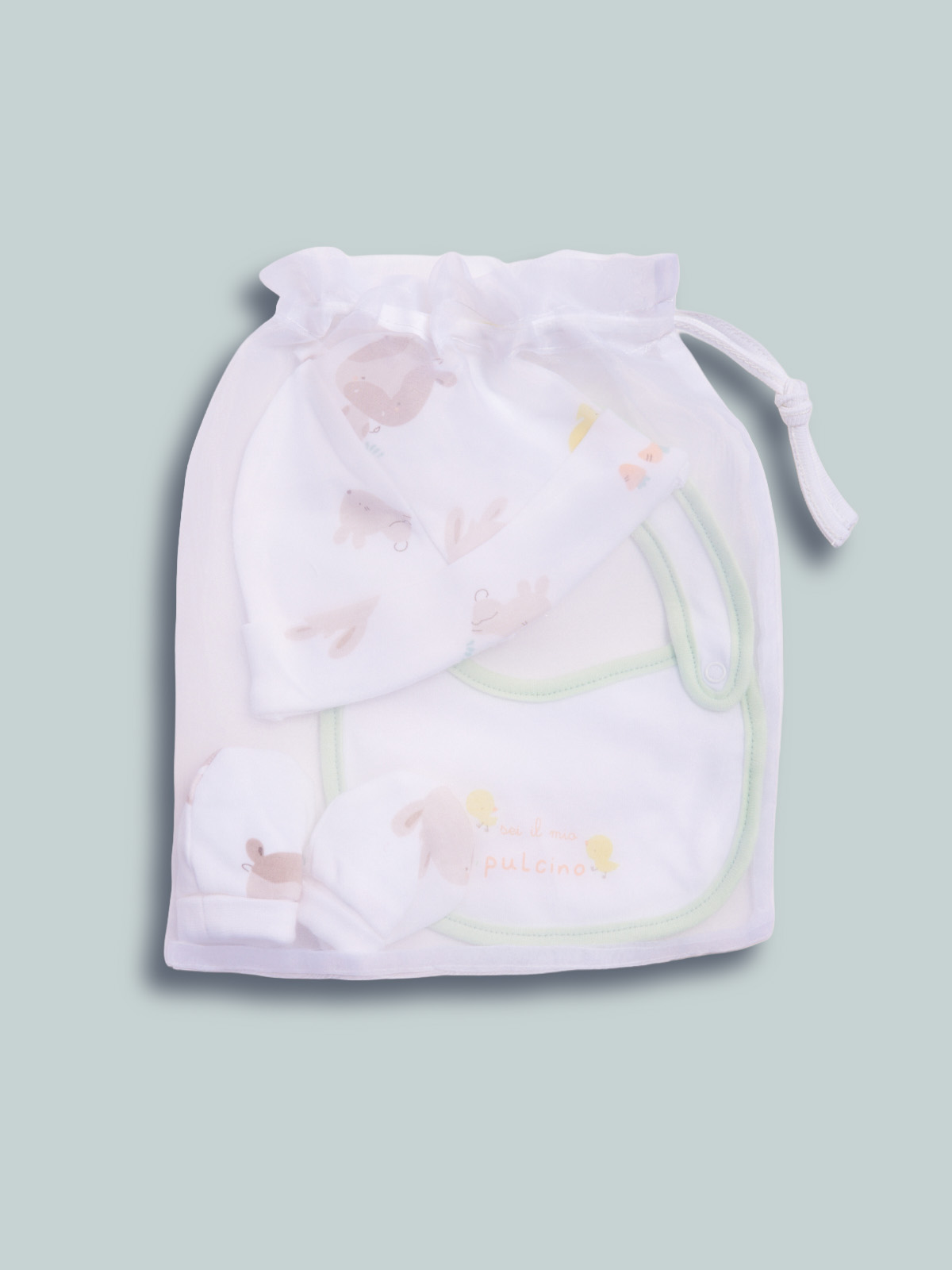 Morbido sacchetto organza contenente: 1 cappellino, 1 bavetta, 1 moffola in cotone per i primi giorni. Questo accessorio fa parte del corredino composto da tutti gli articoli indispensabili per il tuo neonato.
