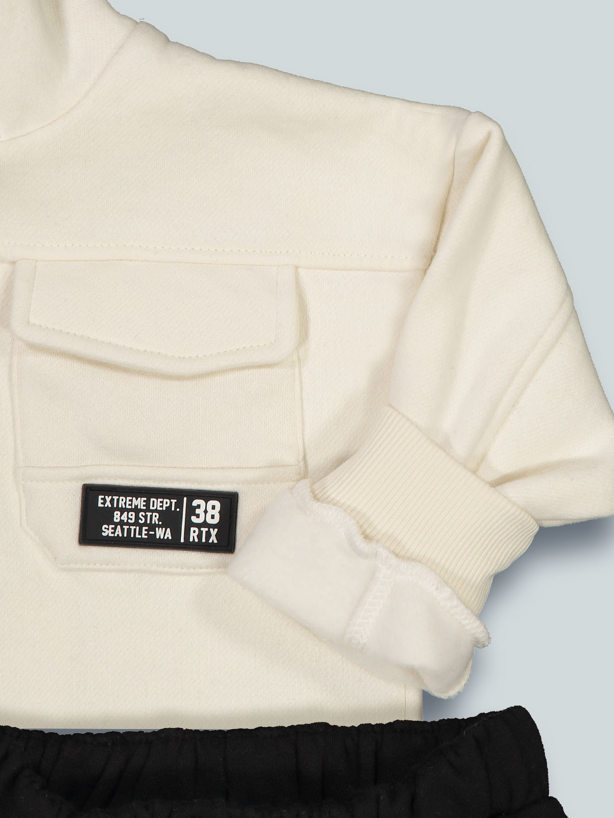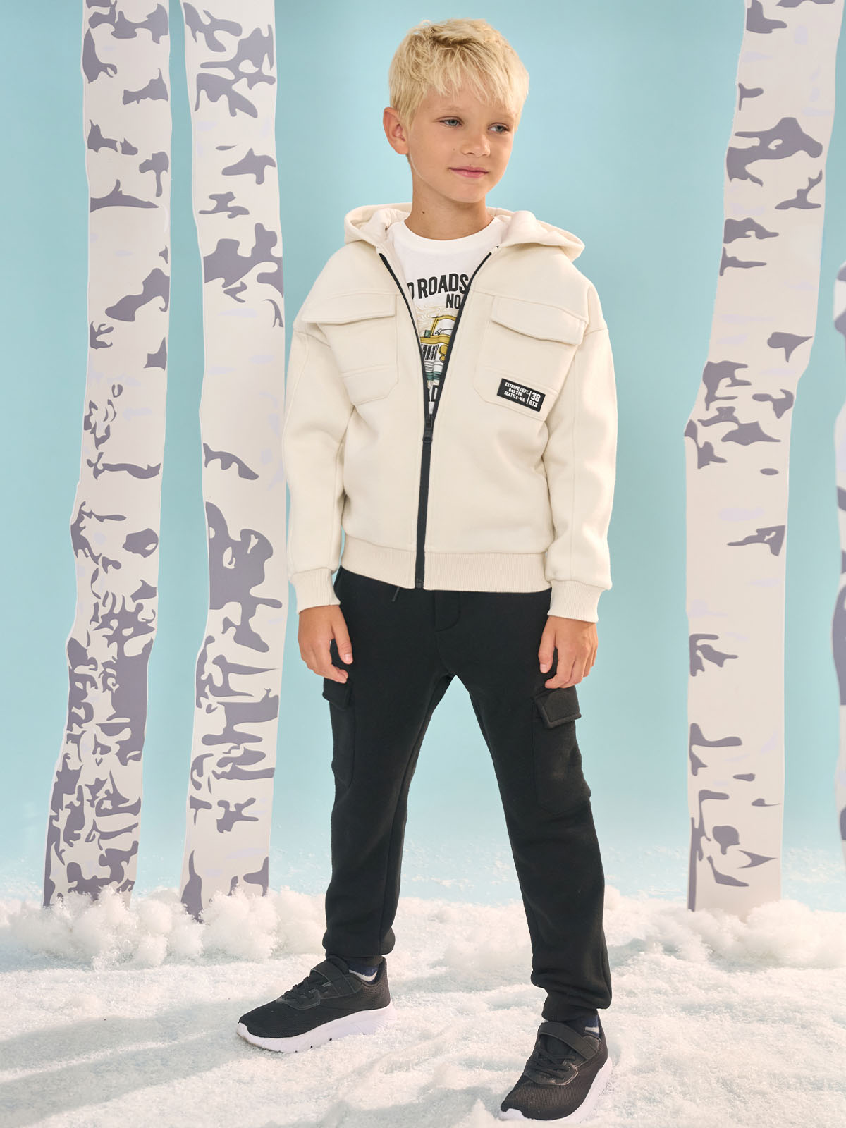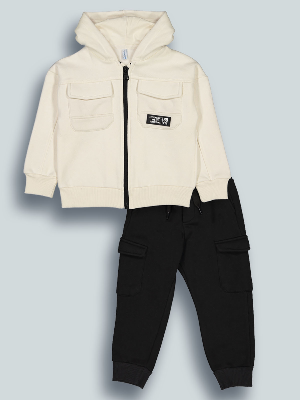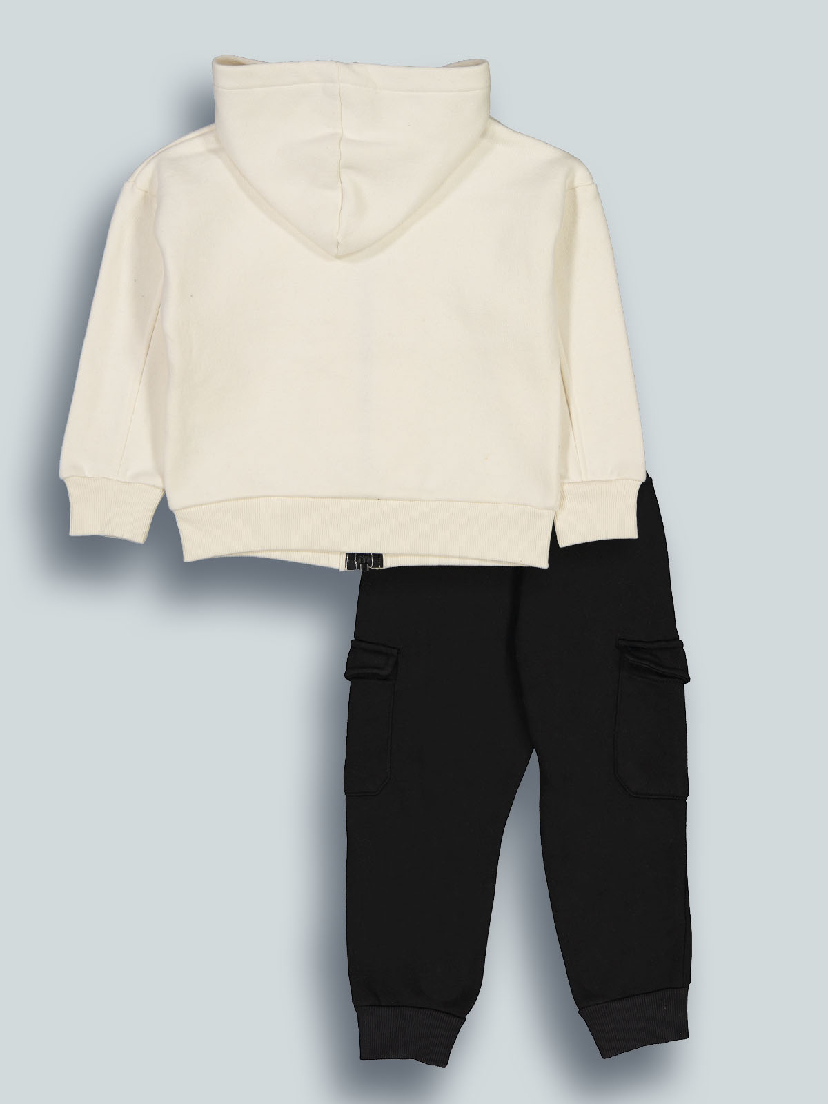 Completo due pezzi in calda felpa ideale per le giornate più fredde. Cardigan con cappuccio, aperto con lampo in contrasto, morbida costina per polsi e fondo, tasche sul davanti. Pantaloni con vita elasticata e coulisse, tasche davanti e sui fianchi stile cargo, fondo gamba in costina. L’interno di questo capo è lavorato in modo tale che le fibre del tessuto si sollevino, rendendolo più morbido, soffice e caldo sulla pelle. Un capo di tendenza, ideale per i momenti di sport e tempo libero.