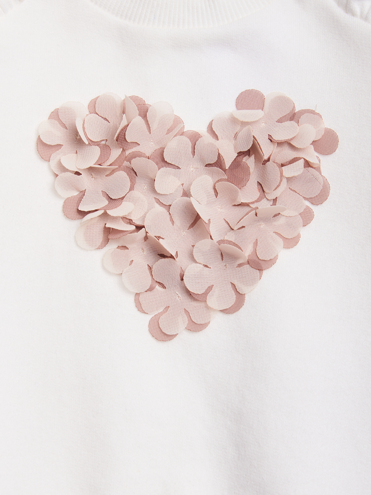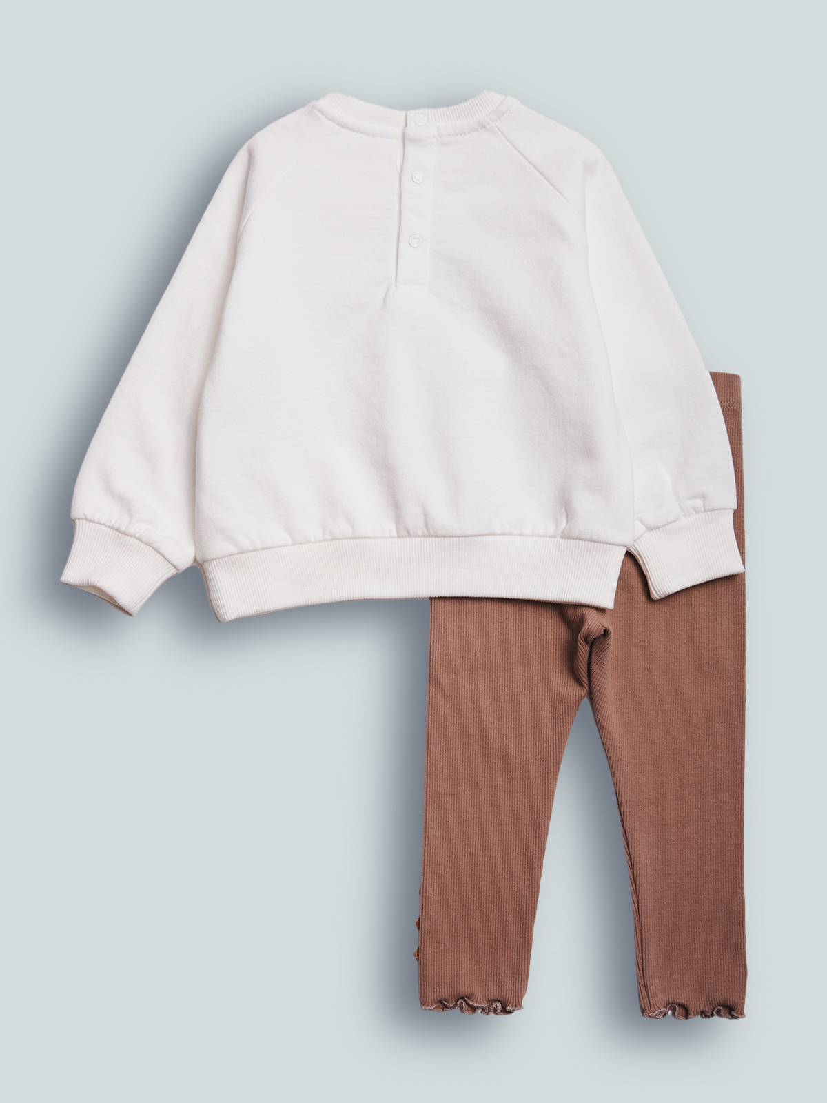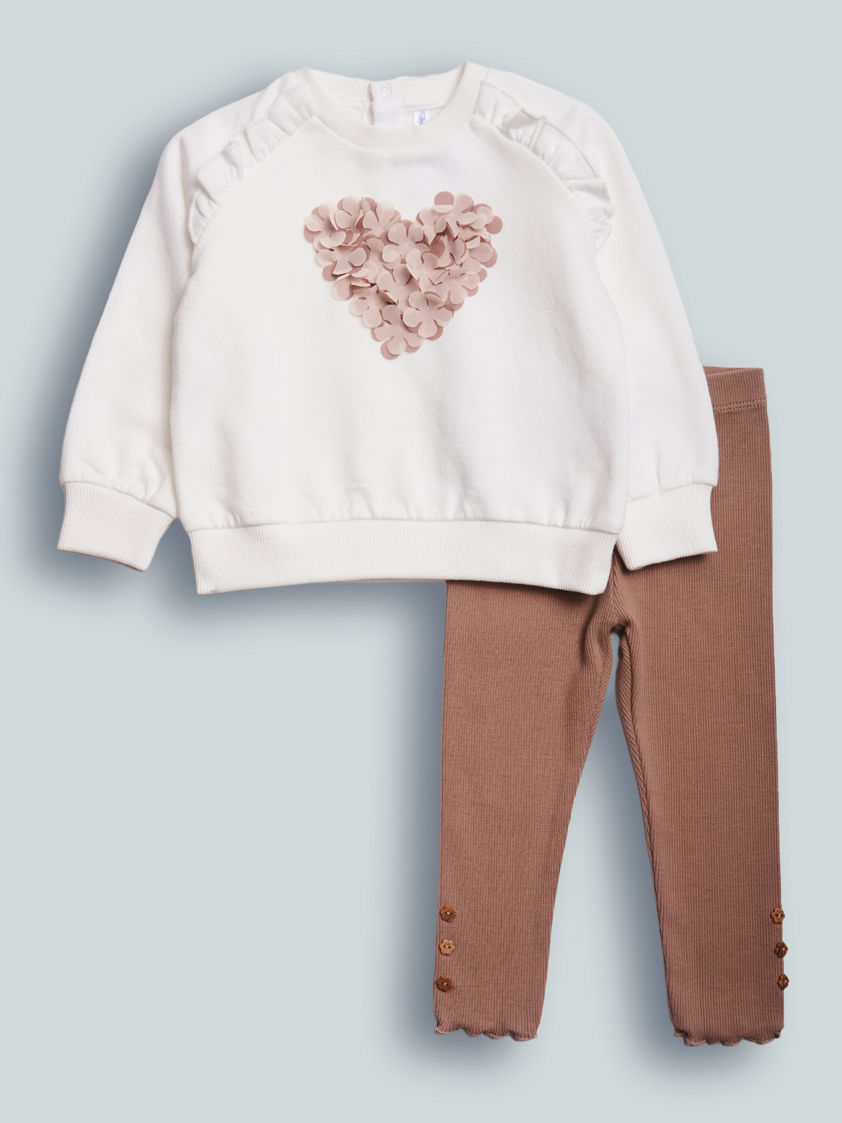 Completo due pezzi. Maglia girocollo in morbida e calda felpa manica lunga con pratica apertura sul dietro grazie ai bottoncini a pressione. Fiori tridimensionali colorati in voile in applicazione che formano un cuore. Costina per collo, polsi e fondo. Rouches al giromanica. L’interno della felpa di questo capo è lavorato in maniera tale che le fibre del tessuto si sollevino, rendendolo più morbido, soffice e caldo sulla pelle. Leggings in morbida e calda costina con vita elasticata per maggiore comodità. Bottoncini al fondo per ancora più femminilità. Un completo con dettagli chic e pratico allo stesso tempo.