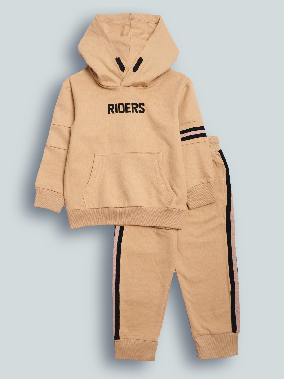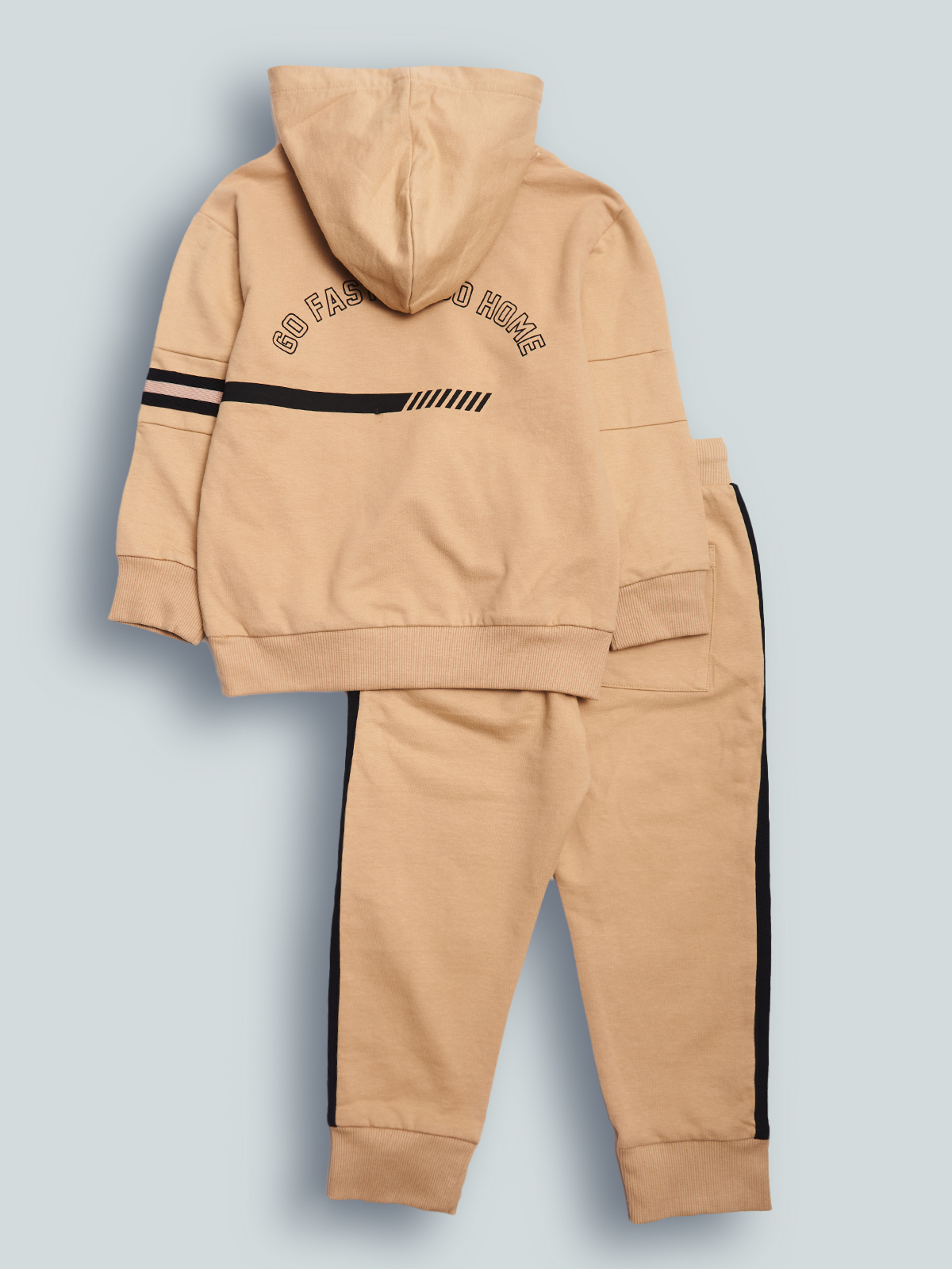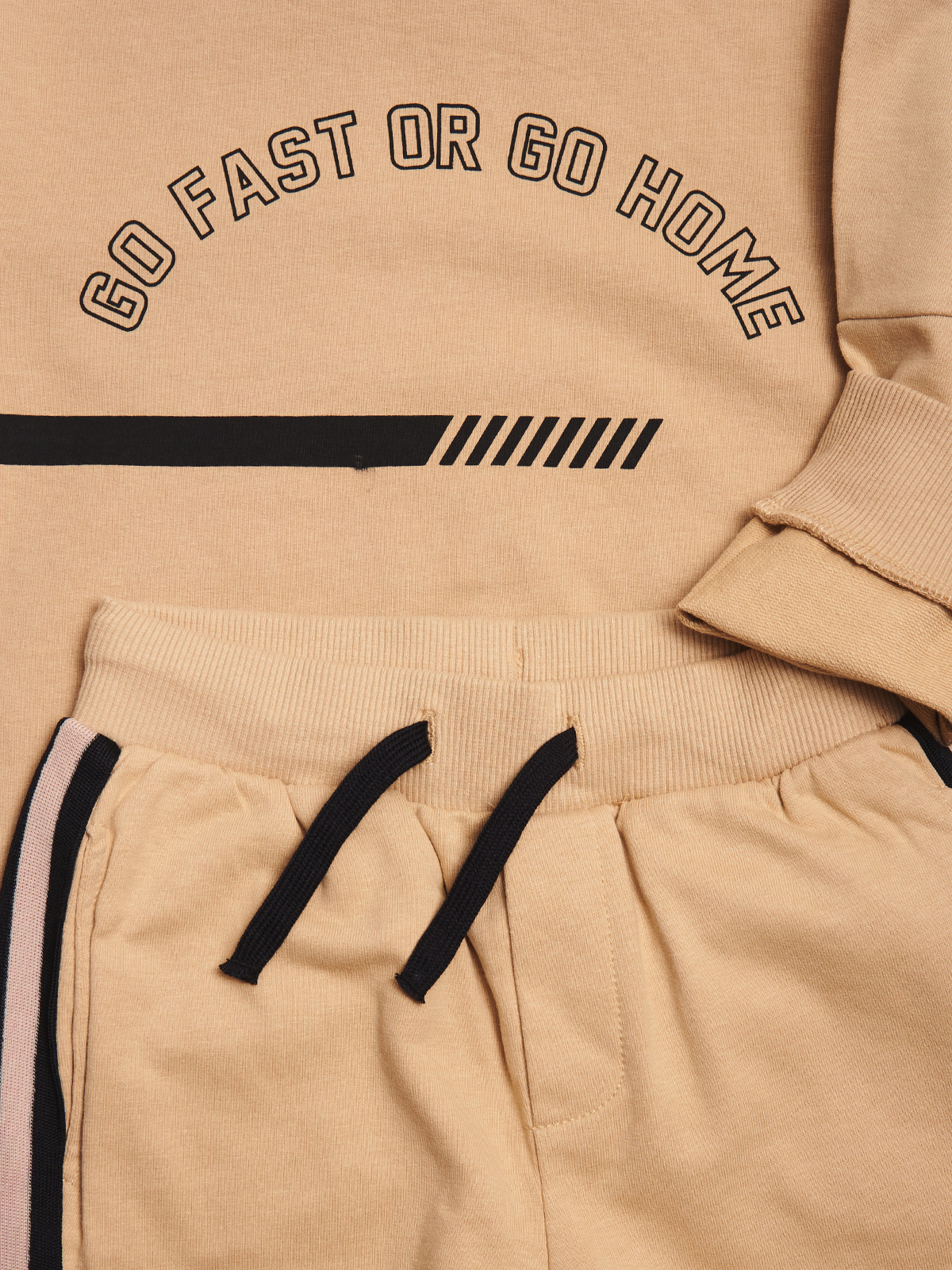 Completo due pezzi in morbida felpa leggera. Maglia con cappuccio e tasca davanti, morbida costina per polsi e fondo, particolari in fettuccia rigata. Pantaloni con vita e fondo gambe in costina e coulisse regolabile, tasche inserite nei fianchi e sul retro. Un capo di tendenza, ideale per i momenti di sport e tempo libero.