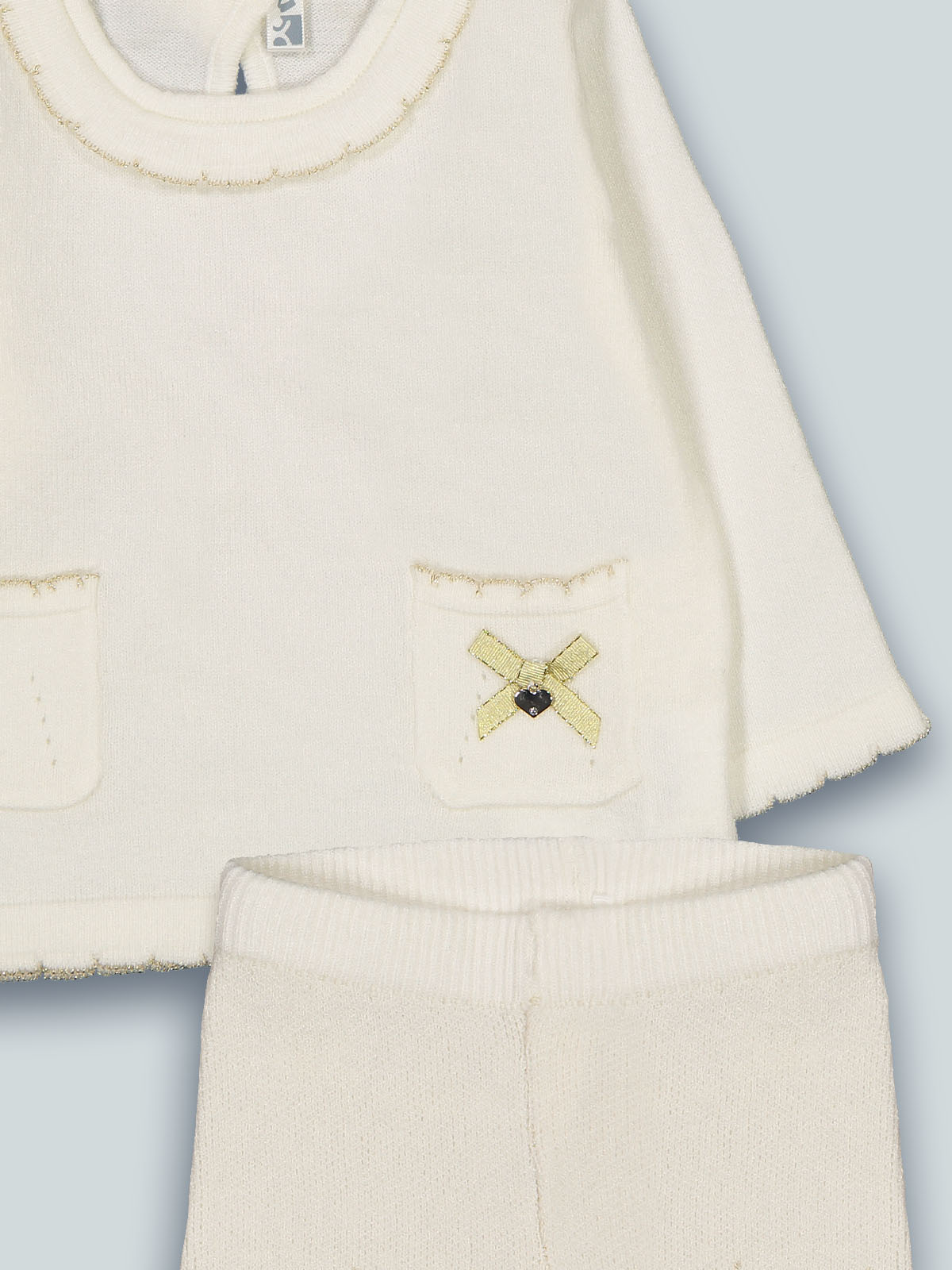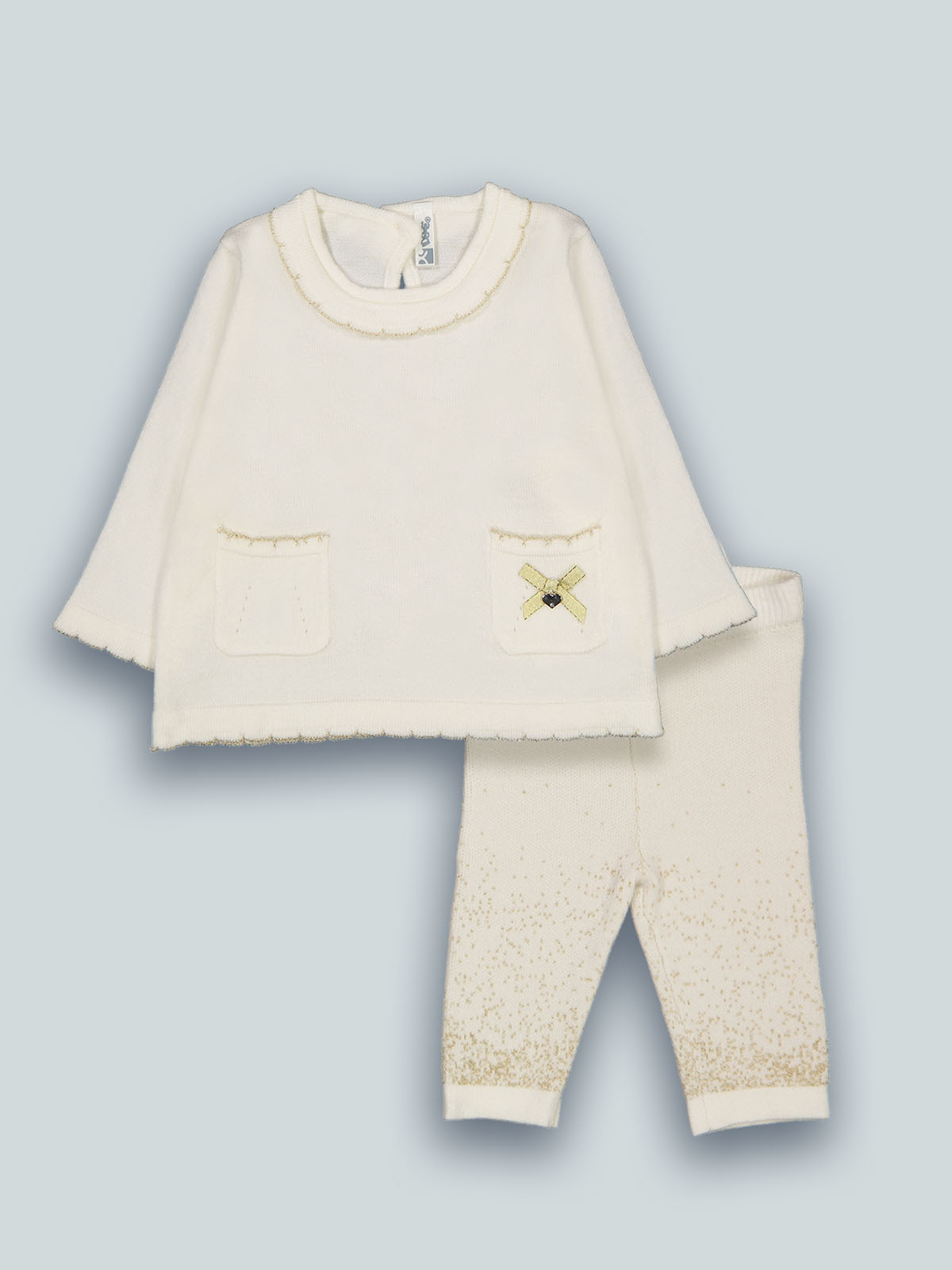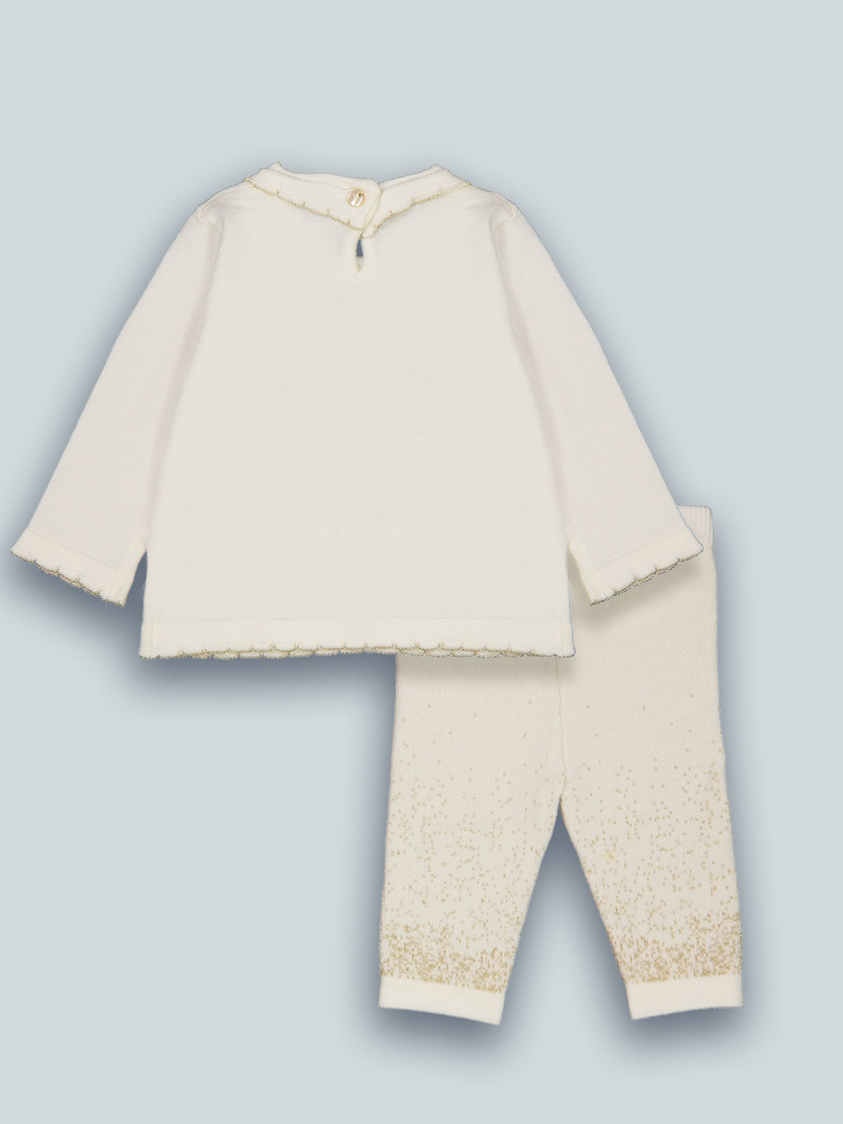 Completo due pezzi formato da maglia in morbido misto cotone, particolari con filo lurex. Abbottonatura a goccia sul dietro. Tasche funzionali davanti. Leggings vita elasticata, sfumature con filo lurex. Un capo dall’anima “chic” e ideale in ogni occasione.