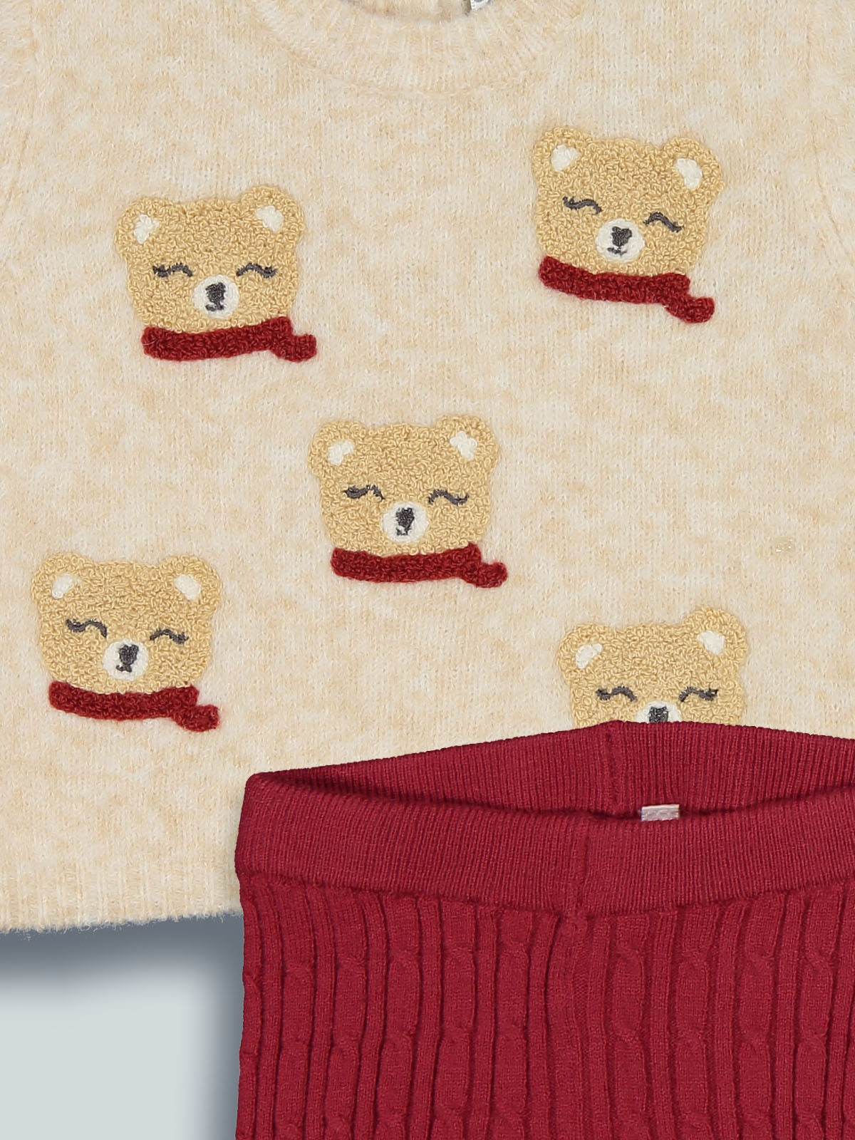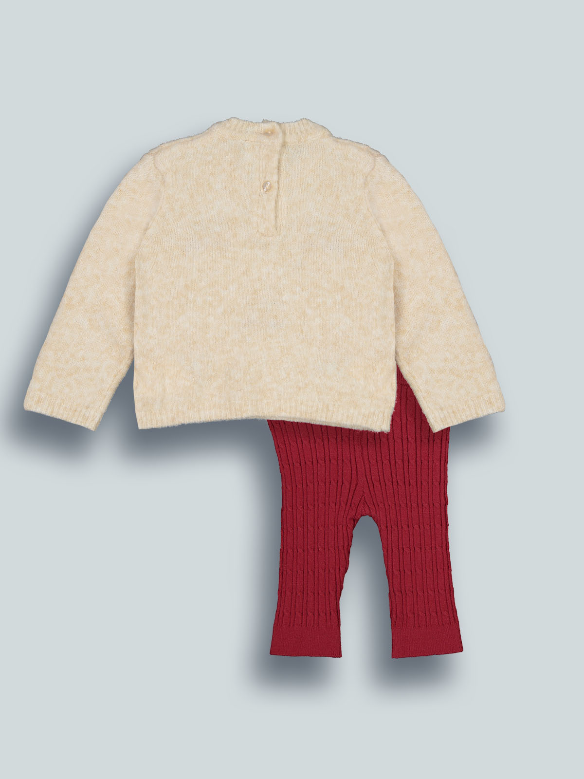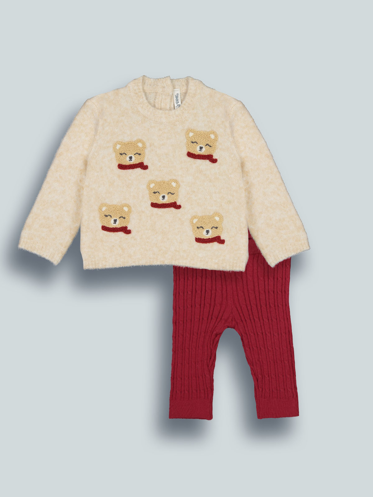 Completo composto da maglia girocollo in morbido misto cotone manica lunga. Pratico da indossare grazie all’apertura con bottoncini sul dietro. Simpatici orsetti a ricamo effetto punto spugna. Leggings in morbida maglia lavorazione a coste, vita elasticata. Un capo caldo, ideale per affrontare l’inverno con stile, perfetto per il periodo Natalizio.