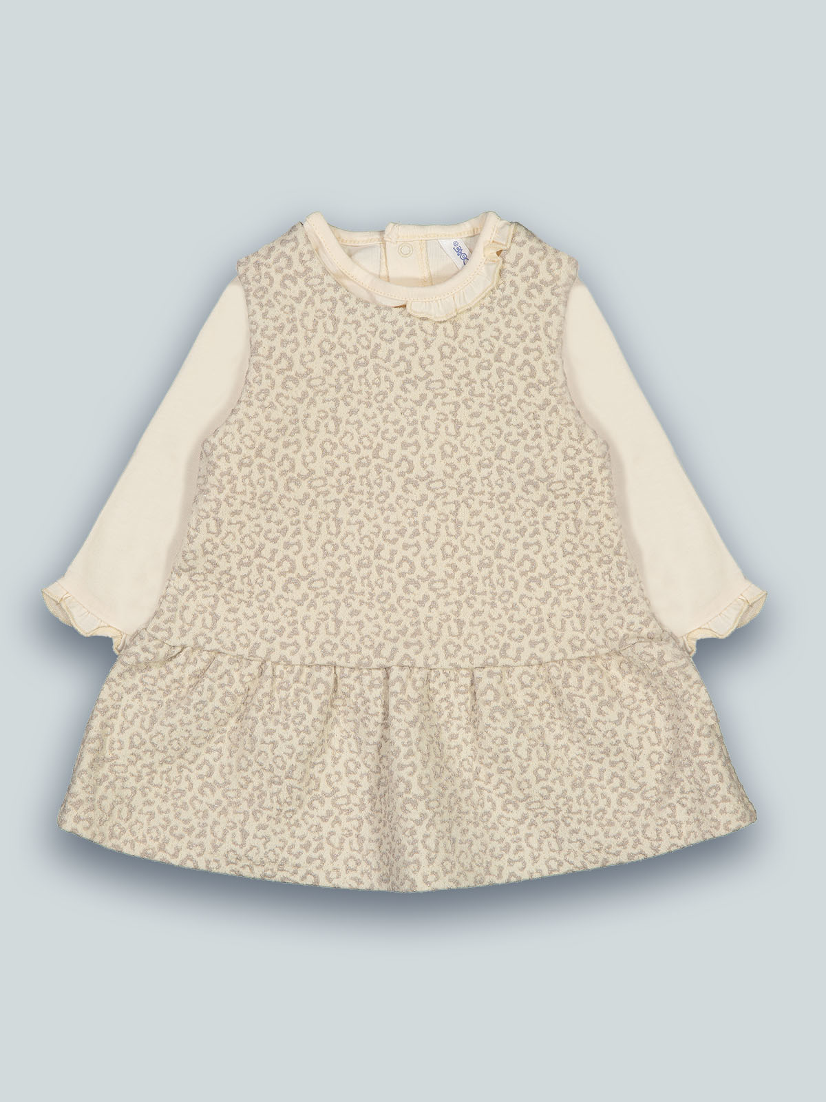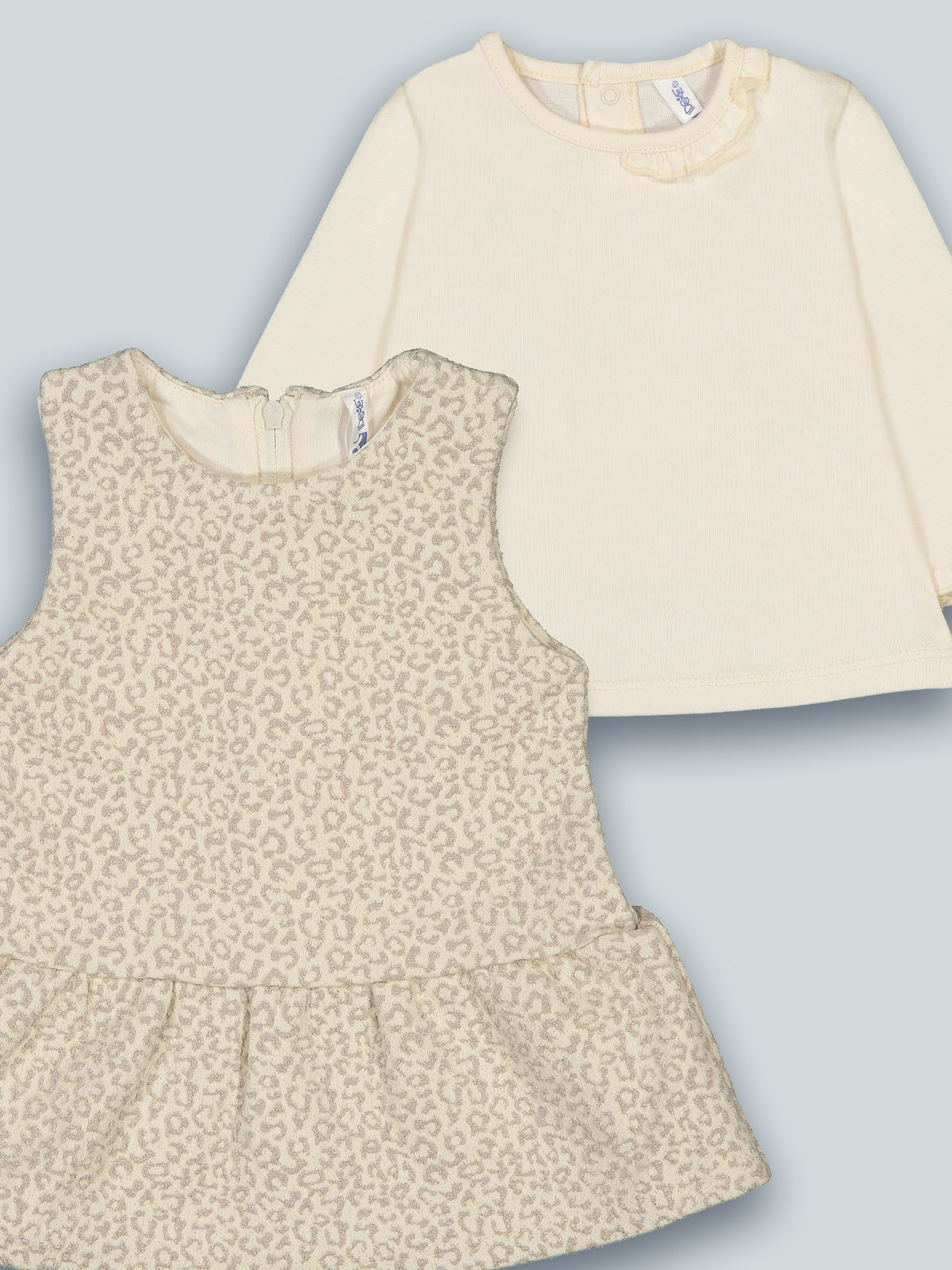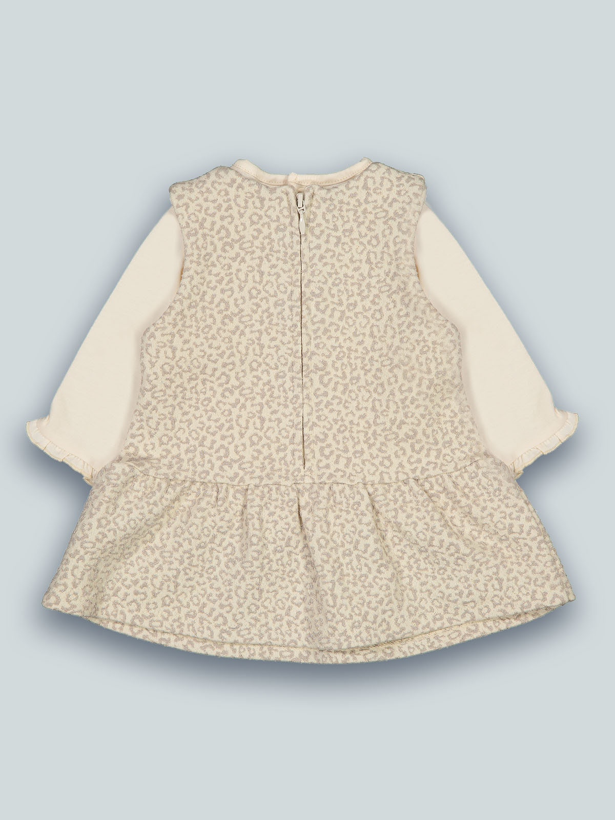 Completo due pezzi. Tshirt manica lunga in caldo cotone elasticizzato, apertura sul dietro con bottoni a pressione. Vestito dallo stile bon ton in morbido jaquard fantasia maculata. Apertura dietro con zip. Un capo elegante, outfit ideale per tutte le occasioni.