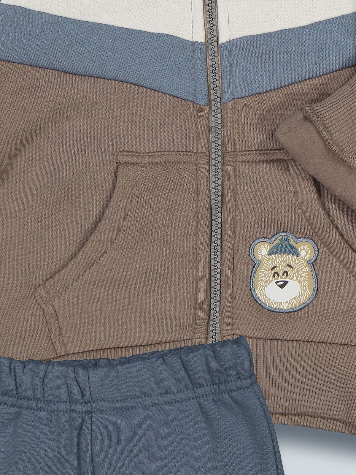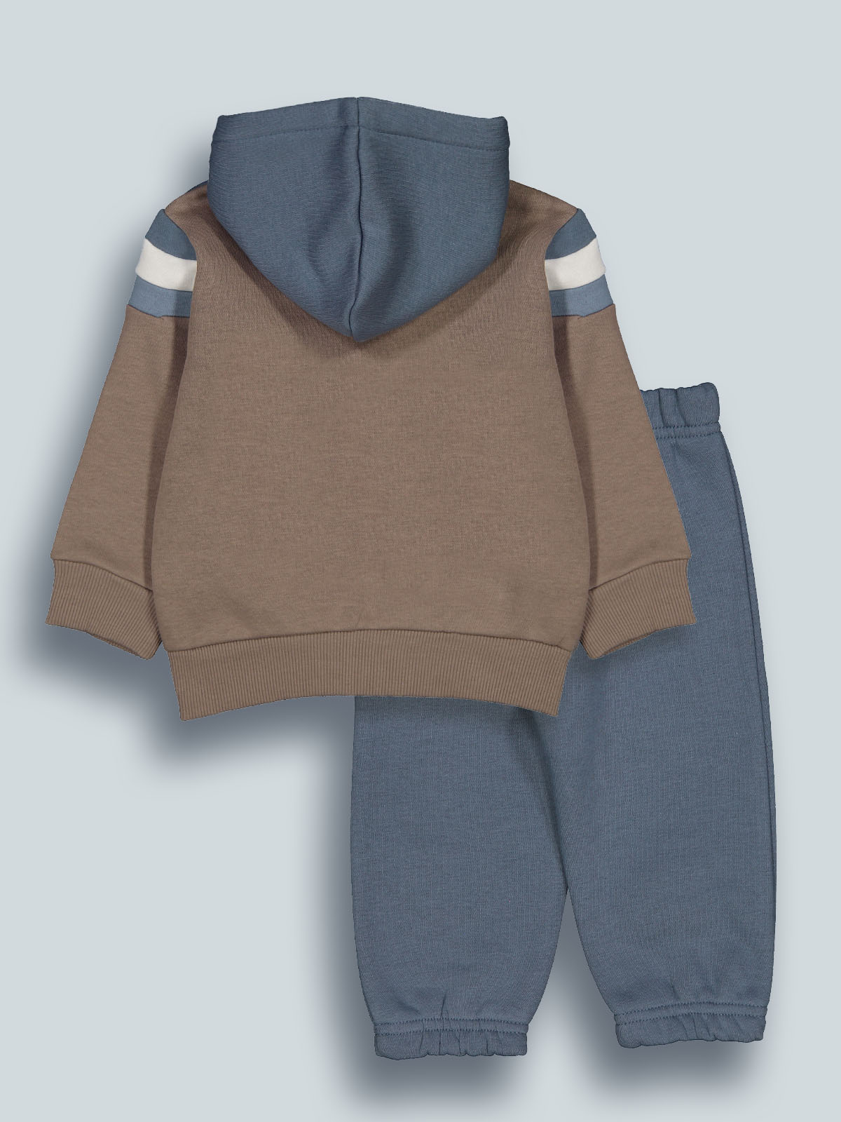 Completo due pezzi in mista calda felpa ideale per le giornate più fredde. Cardigan con cappuccio, colori a contrasto effetto color block. Aperto davanti con zip, morbida costina per polsi e fondo, tasche ed etichetta sul davanti. Pantaloni con vita e fondo gambe elasticati. L’interno di questo capo è lavorato in modo tale che le fibre del tessuto si sollevino, rendendolo più morbido, soffice e caldo sulla pelle. Ideale per i momenti di sport e per il tempo libero.