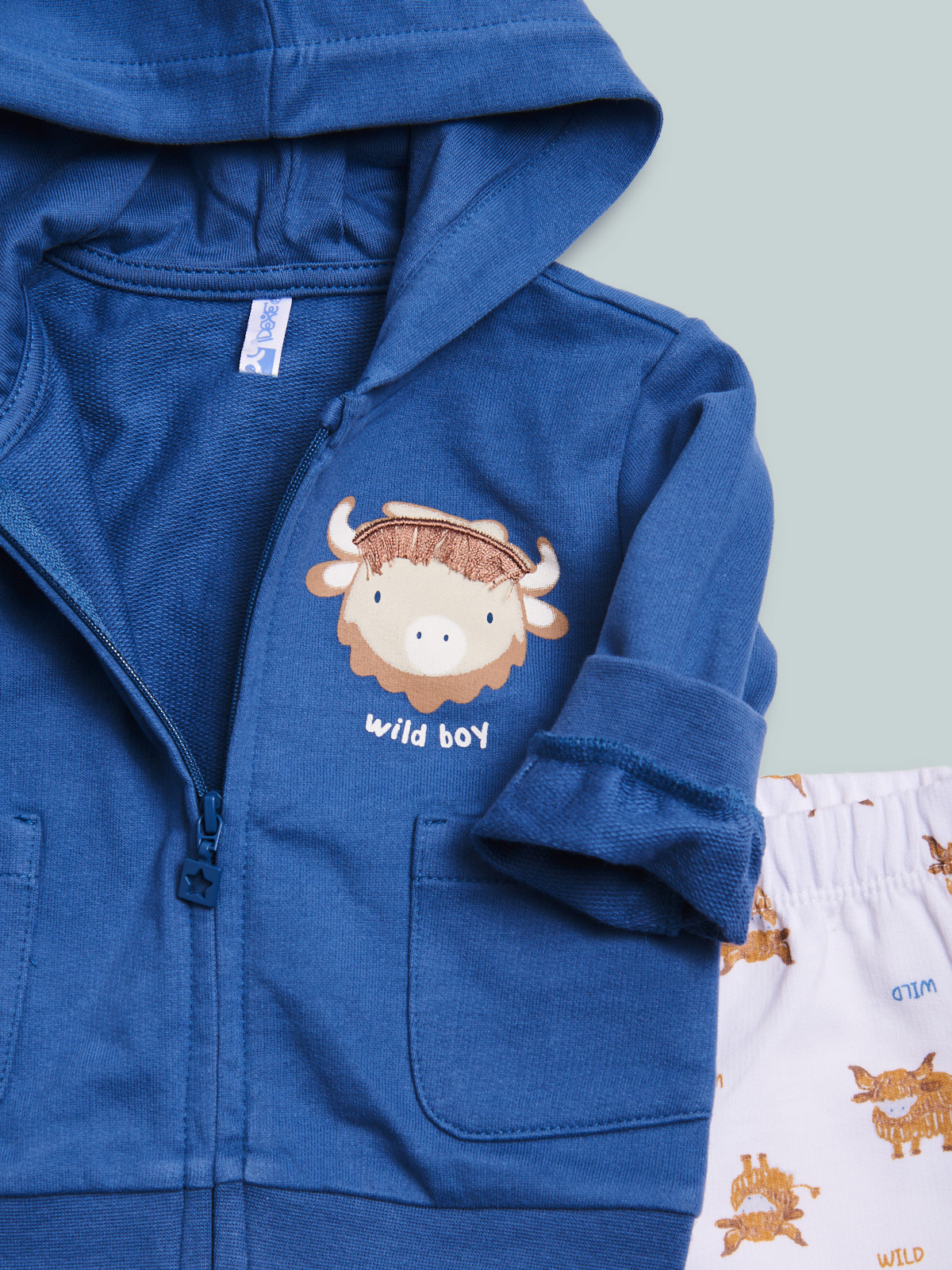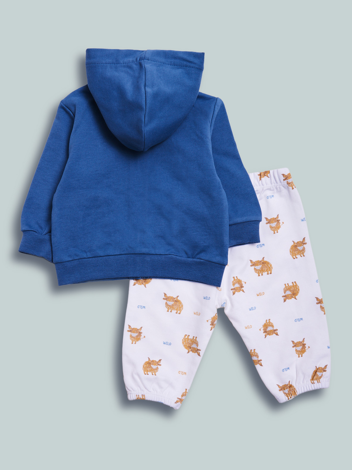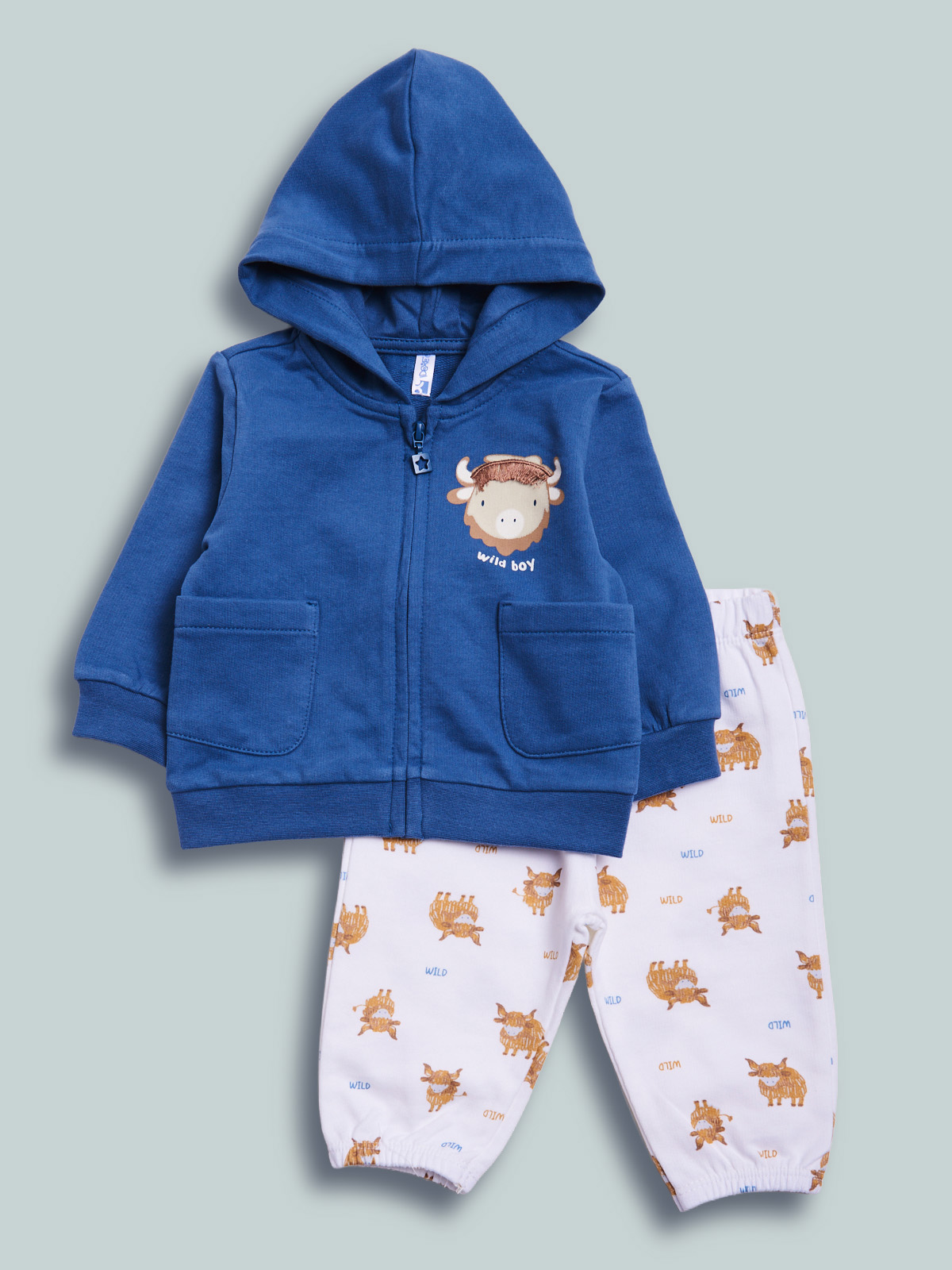 Completo due pezzi in morbida felpa leggera. Comodo cardigan a manica lunga con zip. Simpatica stampa e ricamo effetto 3D. Pantalone vita elasticata in morbida felpa leggera stampata. Un capo morbido e pratico, ideale per le mezze stagioni.