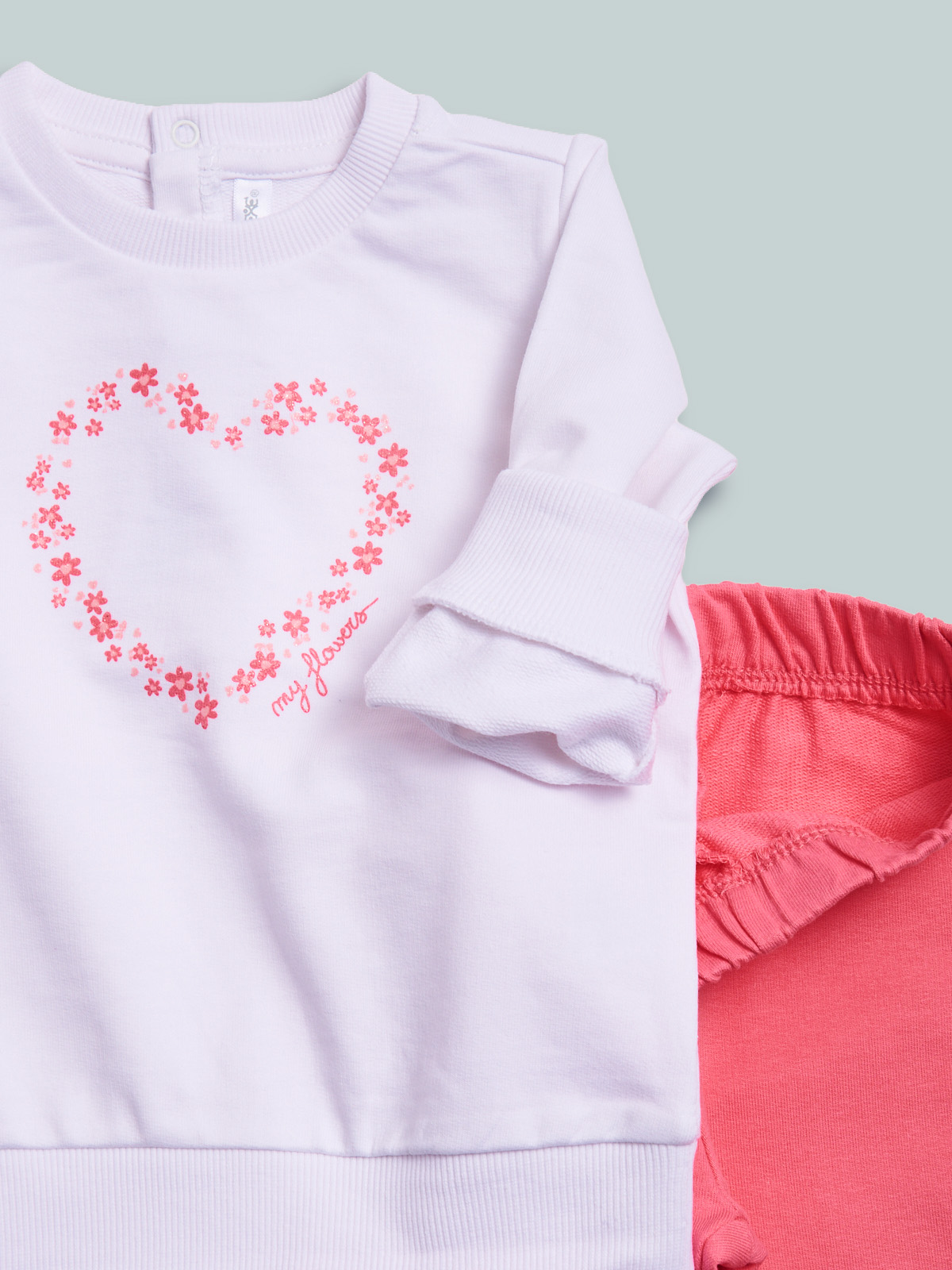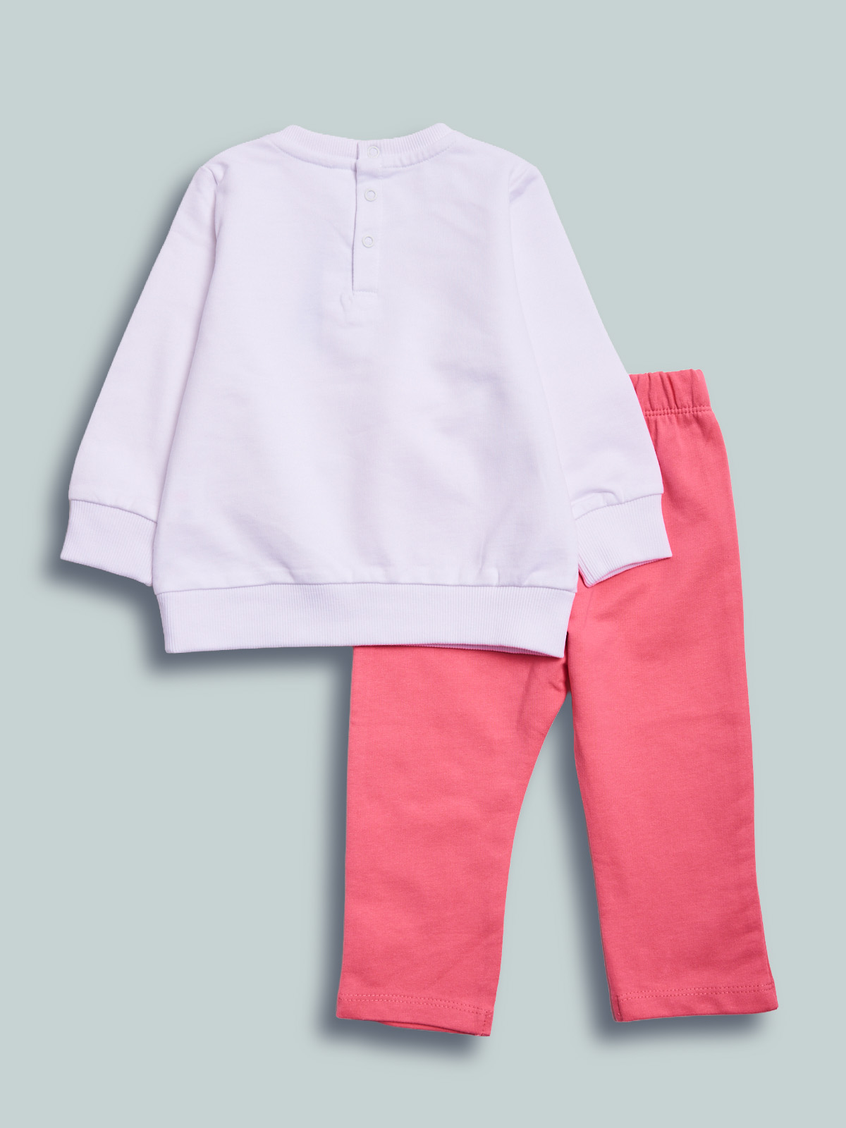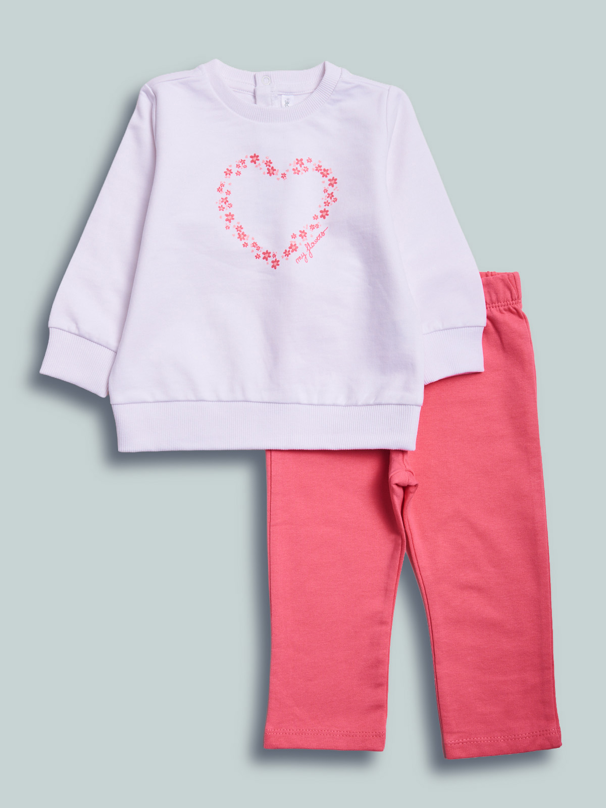Completo due pezzi in morbida felpa leggera. Maglia girocollo manica lunga con pratica apertura sul dietro grazie ai bottoncini a pressione. Simpatica stampa fiori con glitter. Pantaloni con vita elasticata per maggiore comodità. Un completo molto pratico, ideale da indossare all’asilo e nel tempo libero.