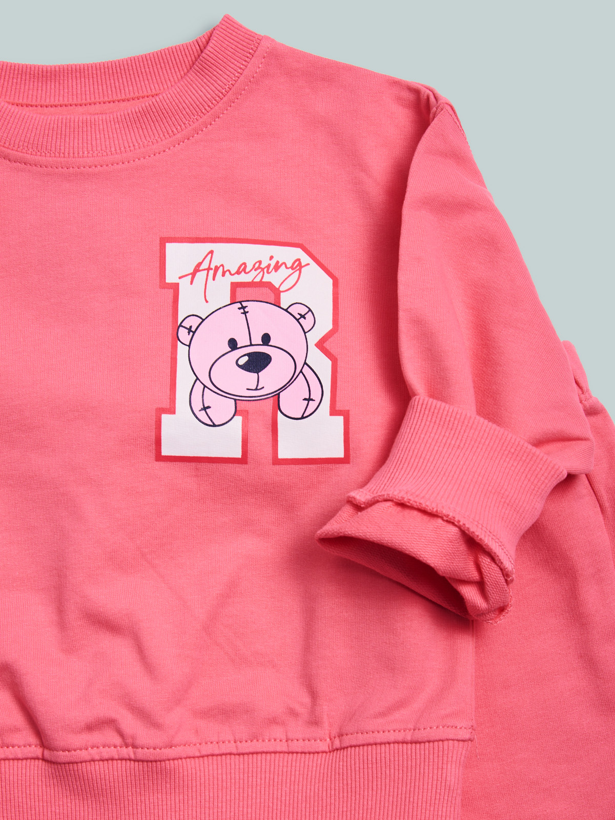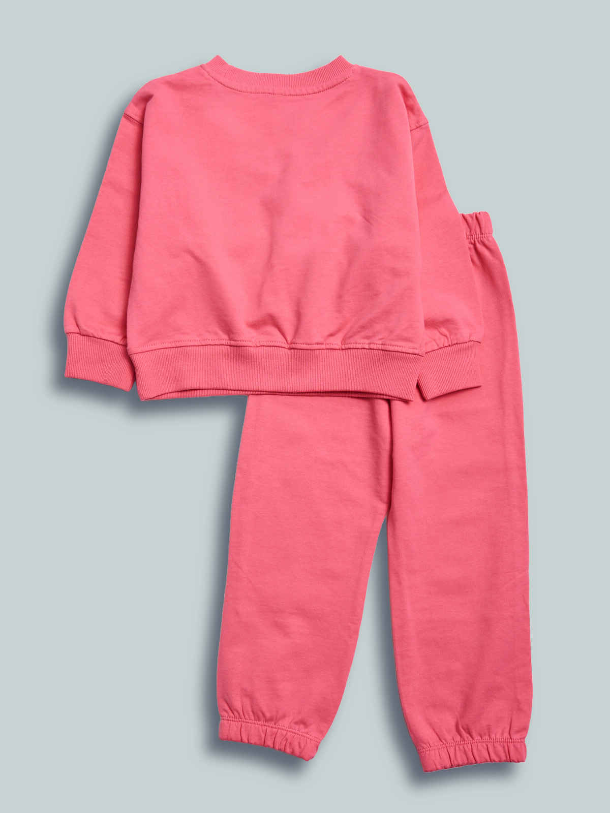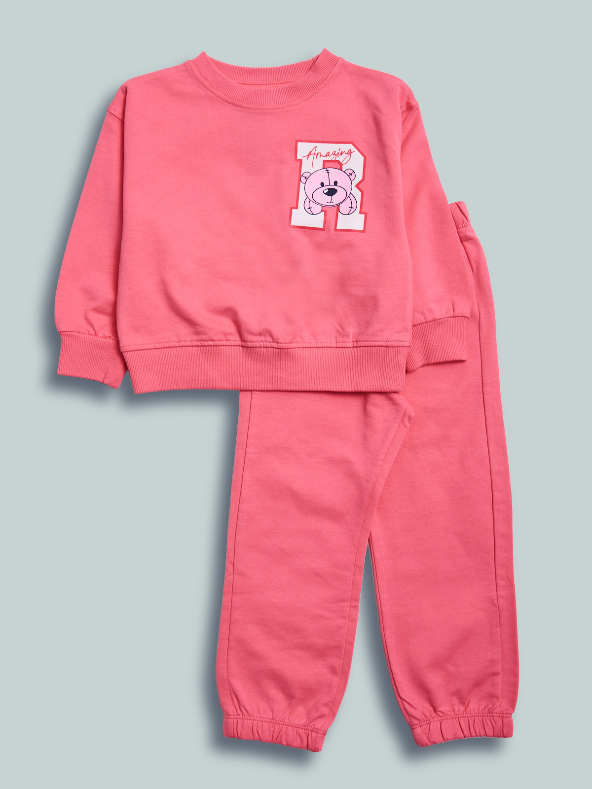 Completo due pezzi in leggera e morbida felpa. Maglia girocollo con stampa orsetto sul davanti sinistro. Pantaloni con vita elasticata per maggiore comodità. Un completo ideale da indossare a scuola e nel tempo libero.