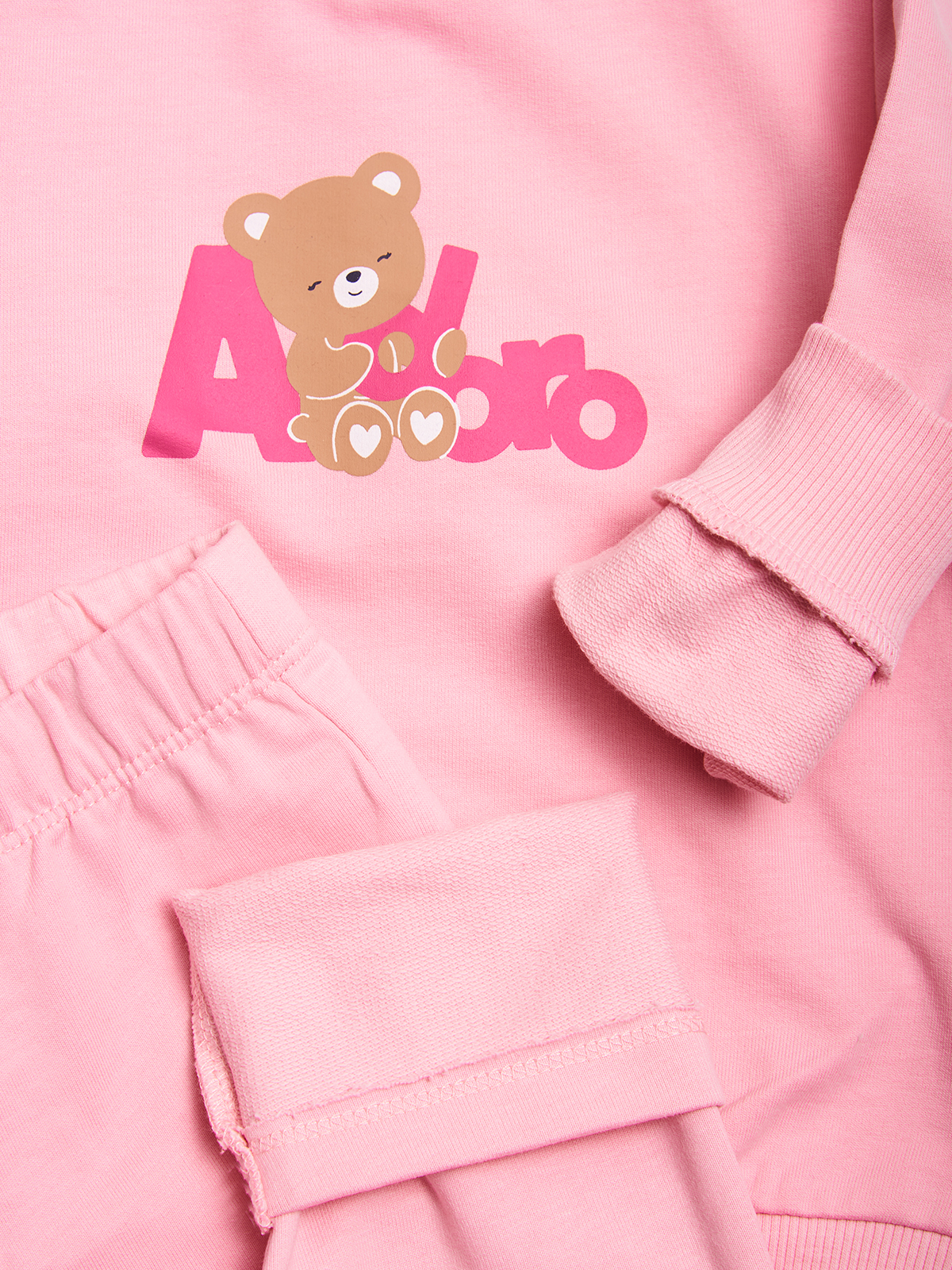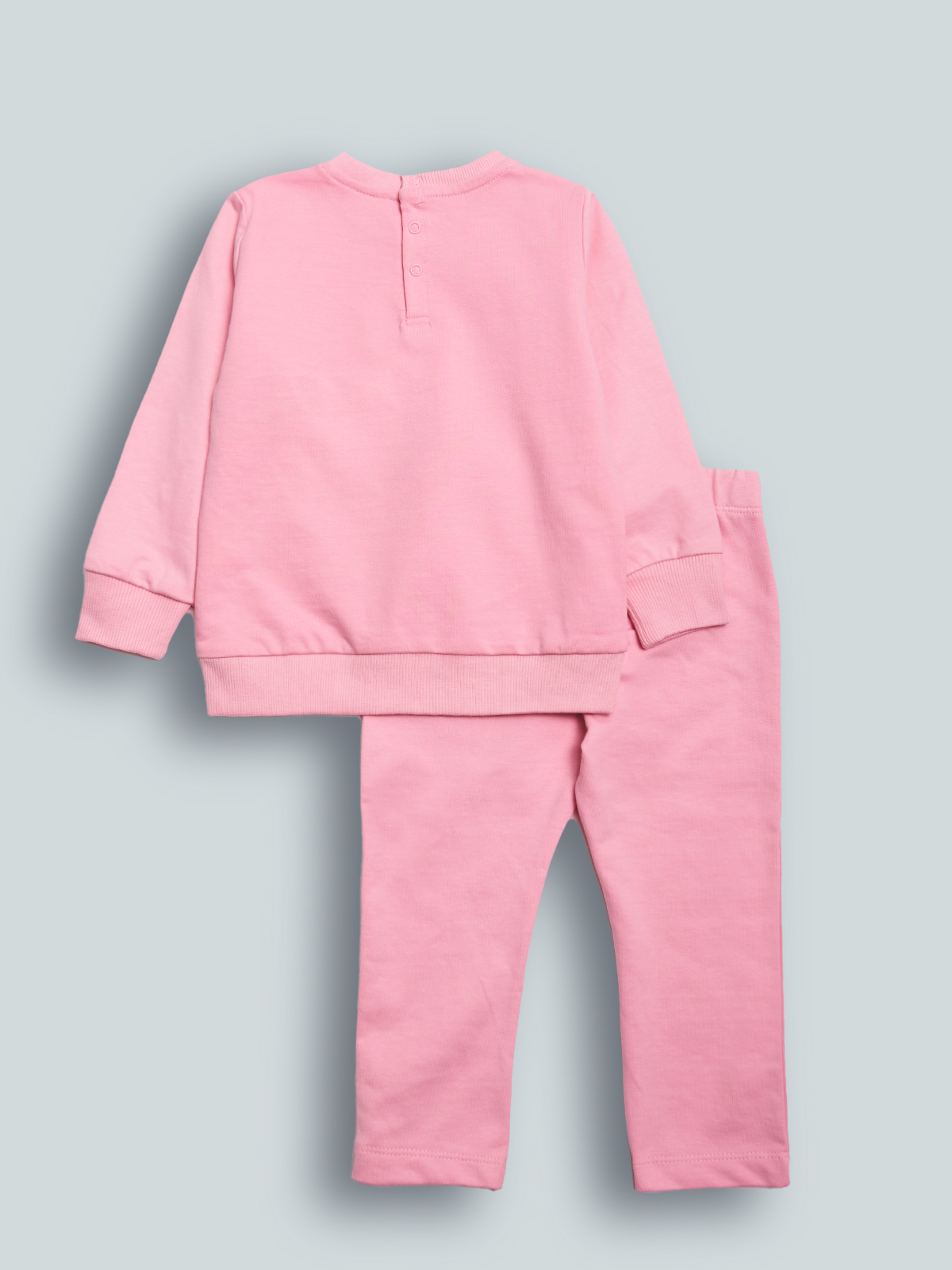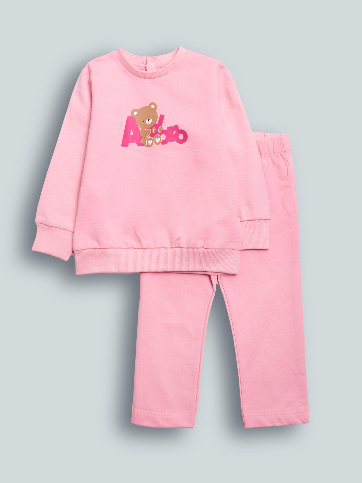 Completo due pezzi in Morbida felpa leggera. Maglia girocollo Manica lunga con pratica apertura sul dietro grazie ai bottoncini a pressione. Impreziosito da una tenera stampa orsetto. Pantaloni con vita elasticata per Maggiore comodità. Un completo ideale da indossare all’asilo.