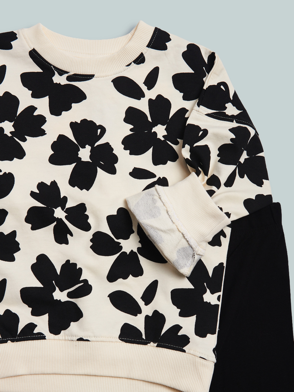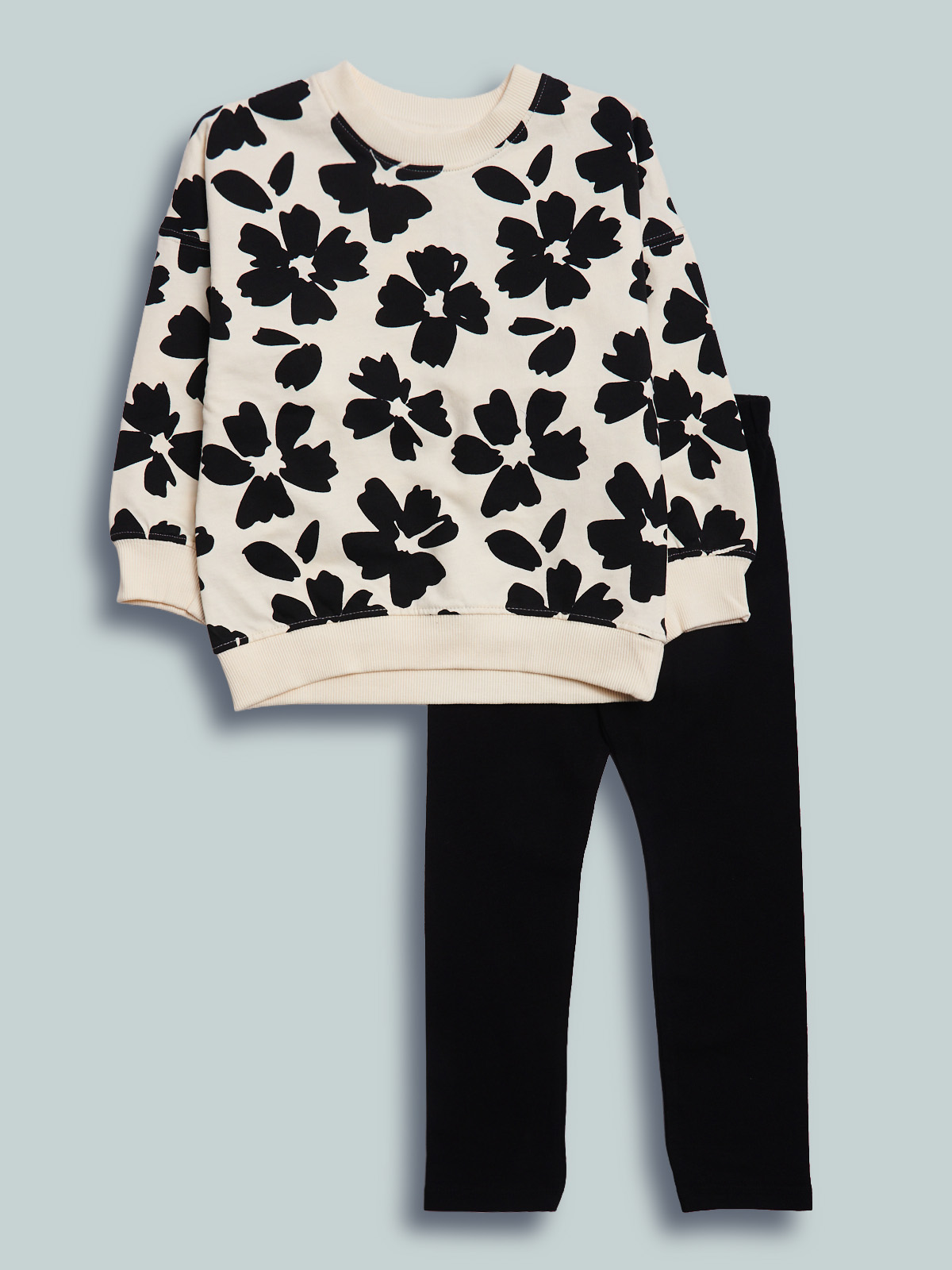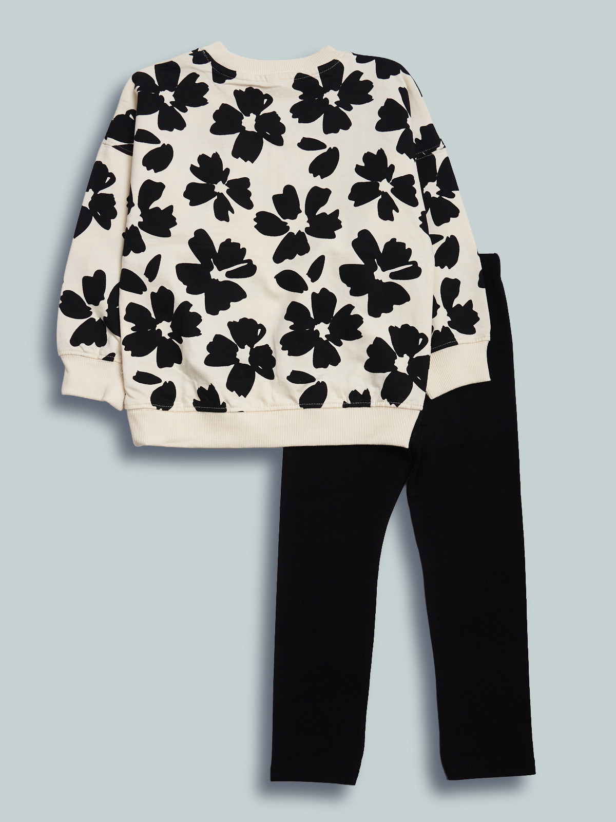 Completo due pezzi. Maxi maglia in morbida e leggera felpa fantasia fiori. Collo polsi e fondo in costina unita. Leggings in morbido cotone elasticizzato con vita elasticata per maggiore comodità di indosso. Un completo ideale da indossare a scuola e nel tempo libero.