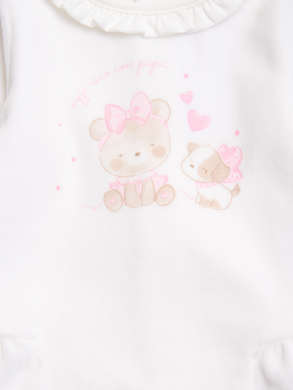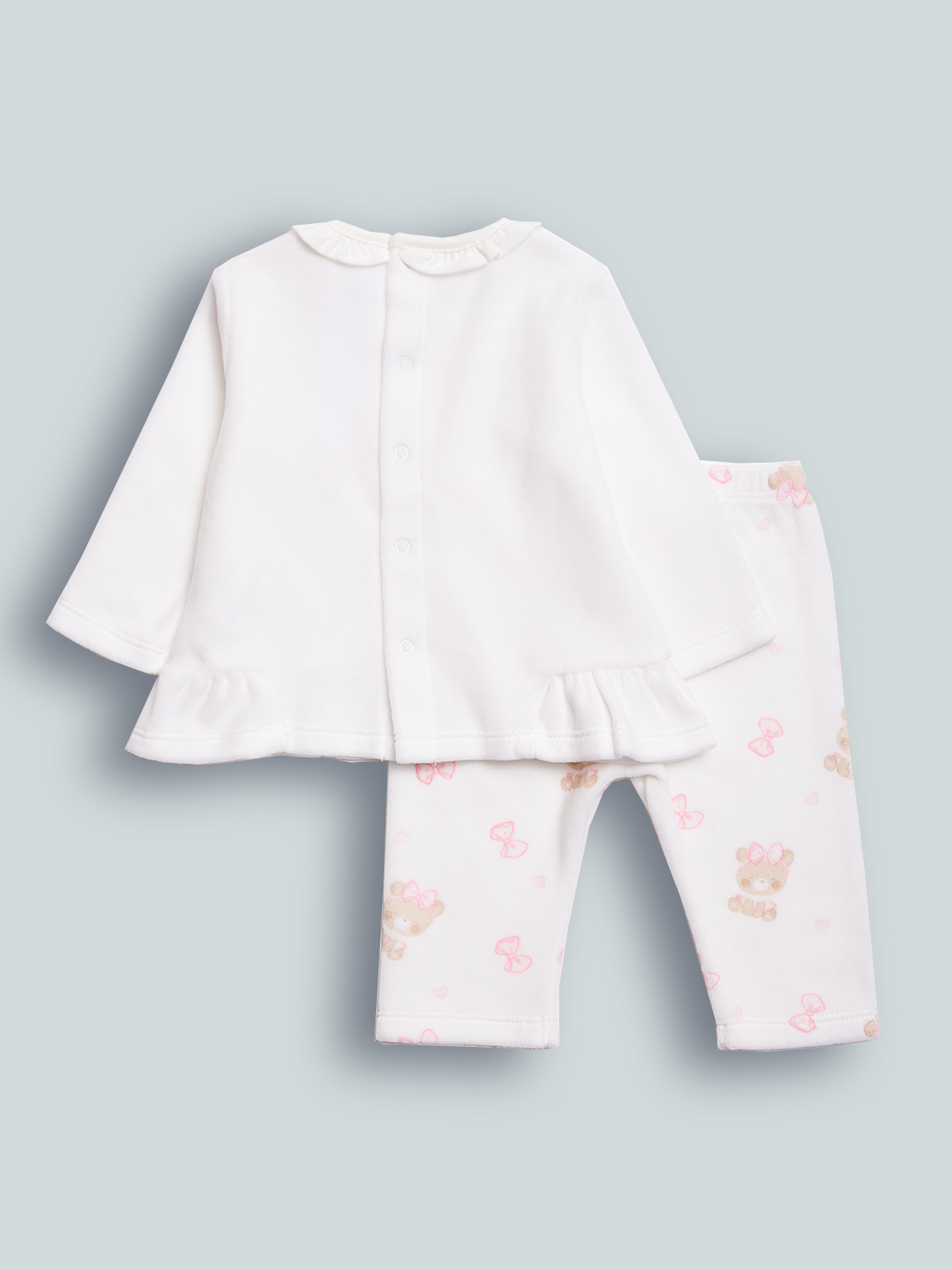 Completo due pezzi composto da Maglia in ciniglia tinta unita. Pratica apertura totale sul dietro con bottoncini a pressione. L’arricciatura sui fianchi e il girocollo bordato con rouches aggiunge un tocco femminile. Tenera stampa davanti. Pantalone in ciniglia stampata, vita elasticata. Un capo Molto pratico e ideale per essere sempre al passo con la Moda.