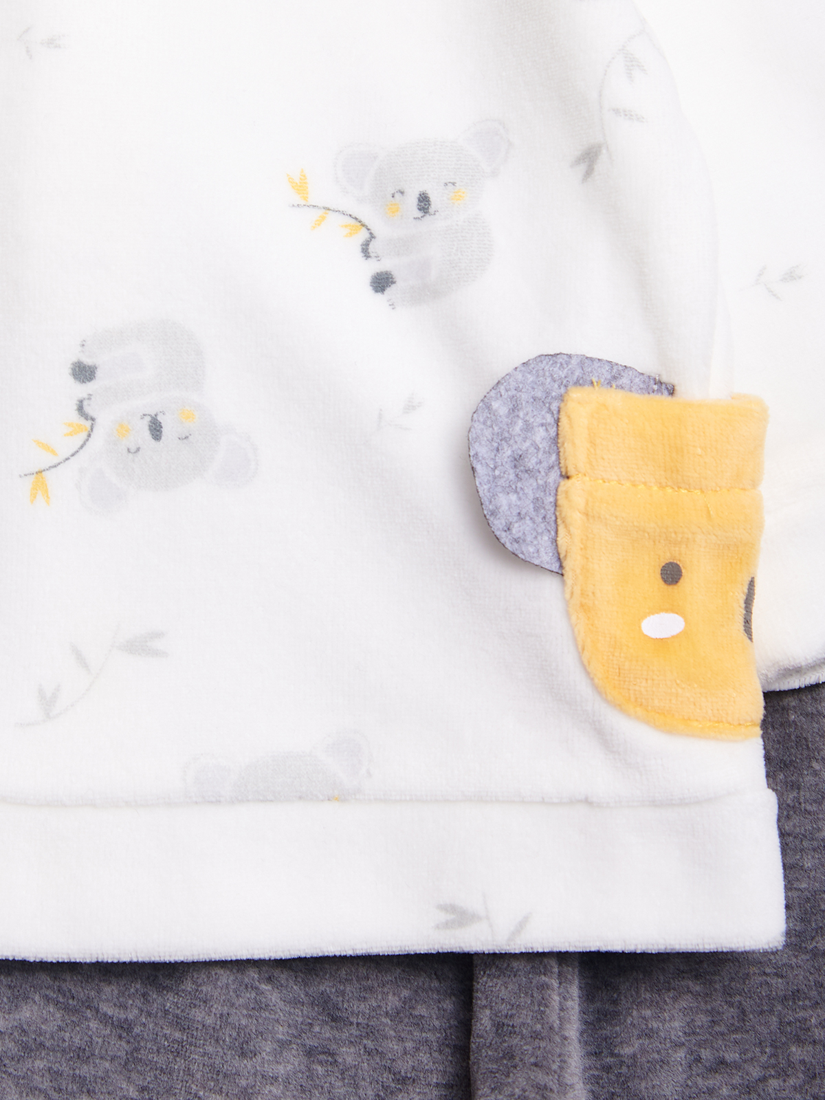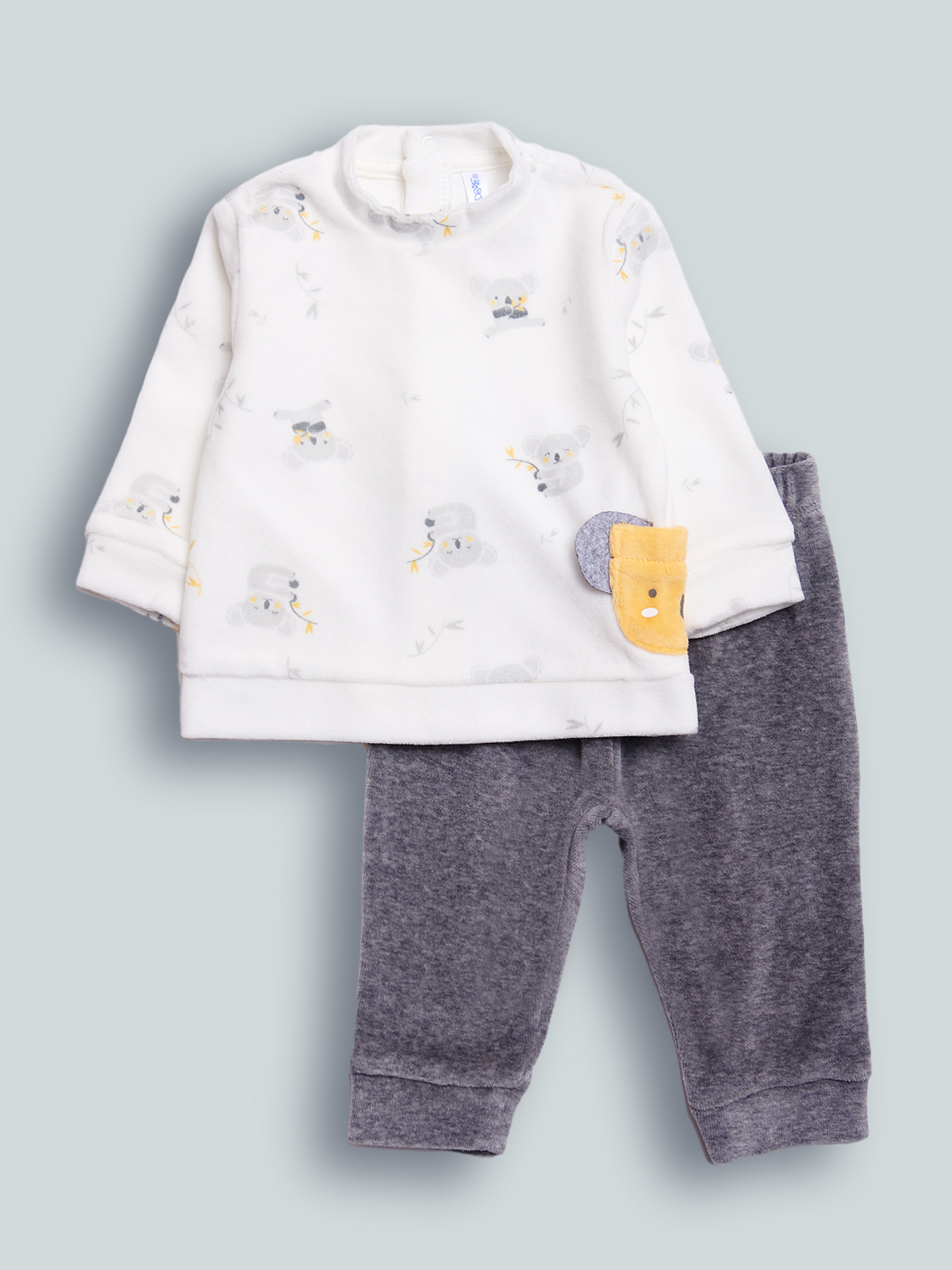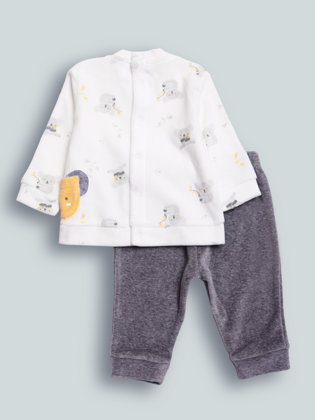 Completo due pezzi composto da Maglia Manica lunga ciniglia stampata. Apertura totale sul dietro. Elemento decorativo: tasca con stampa Musetto e orecchie 3D. Pantalone ciniglia grigio Melange, vita elasticata per agevolare la vestibilità. Questo completo fa parte del corredino composto da tutti gli articoli indispensabili per il tuo neonato.