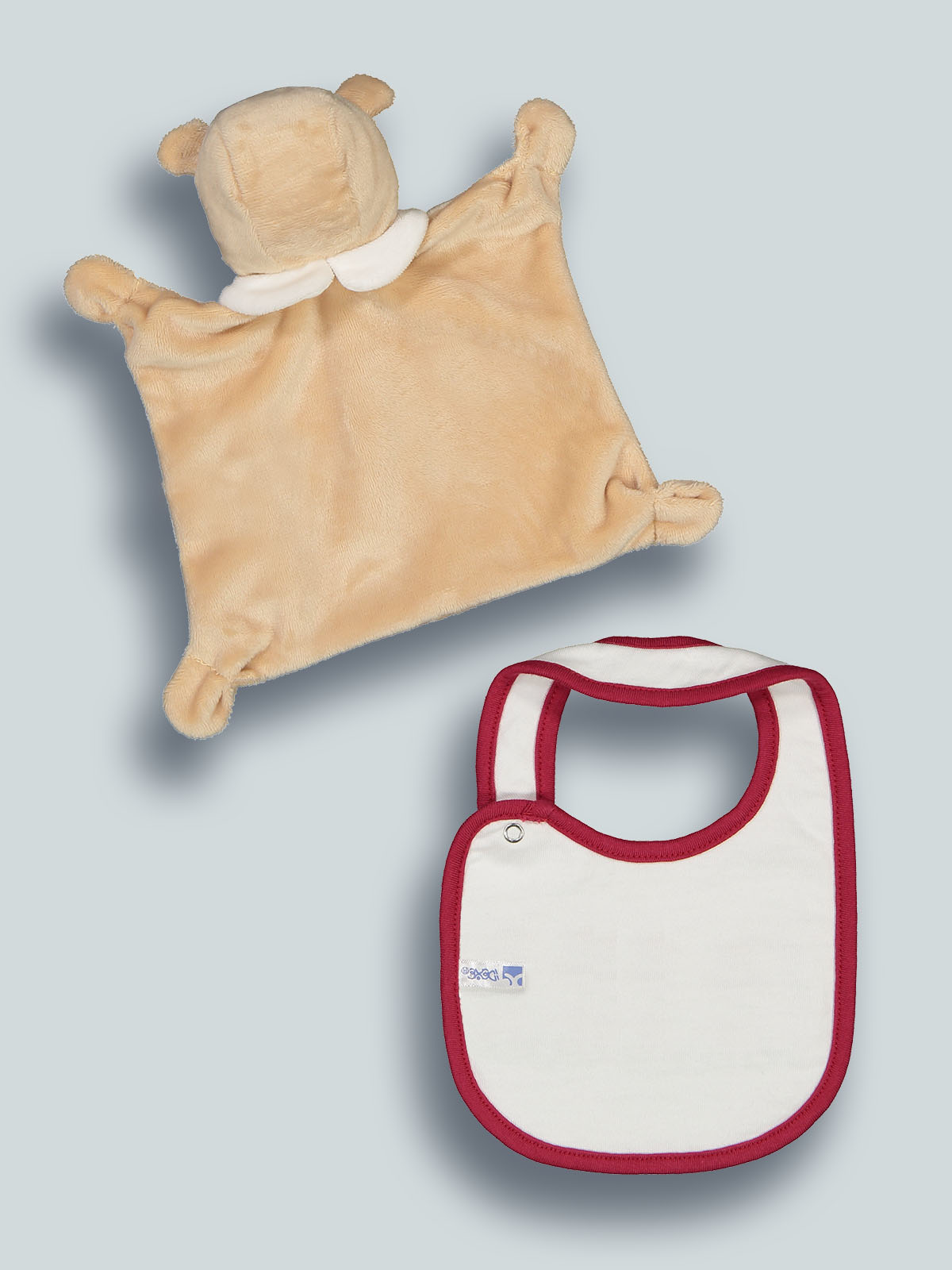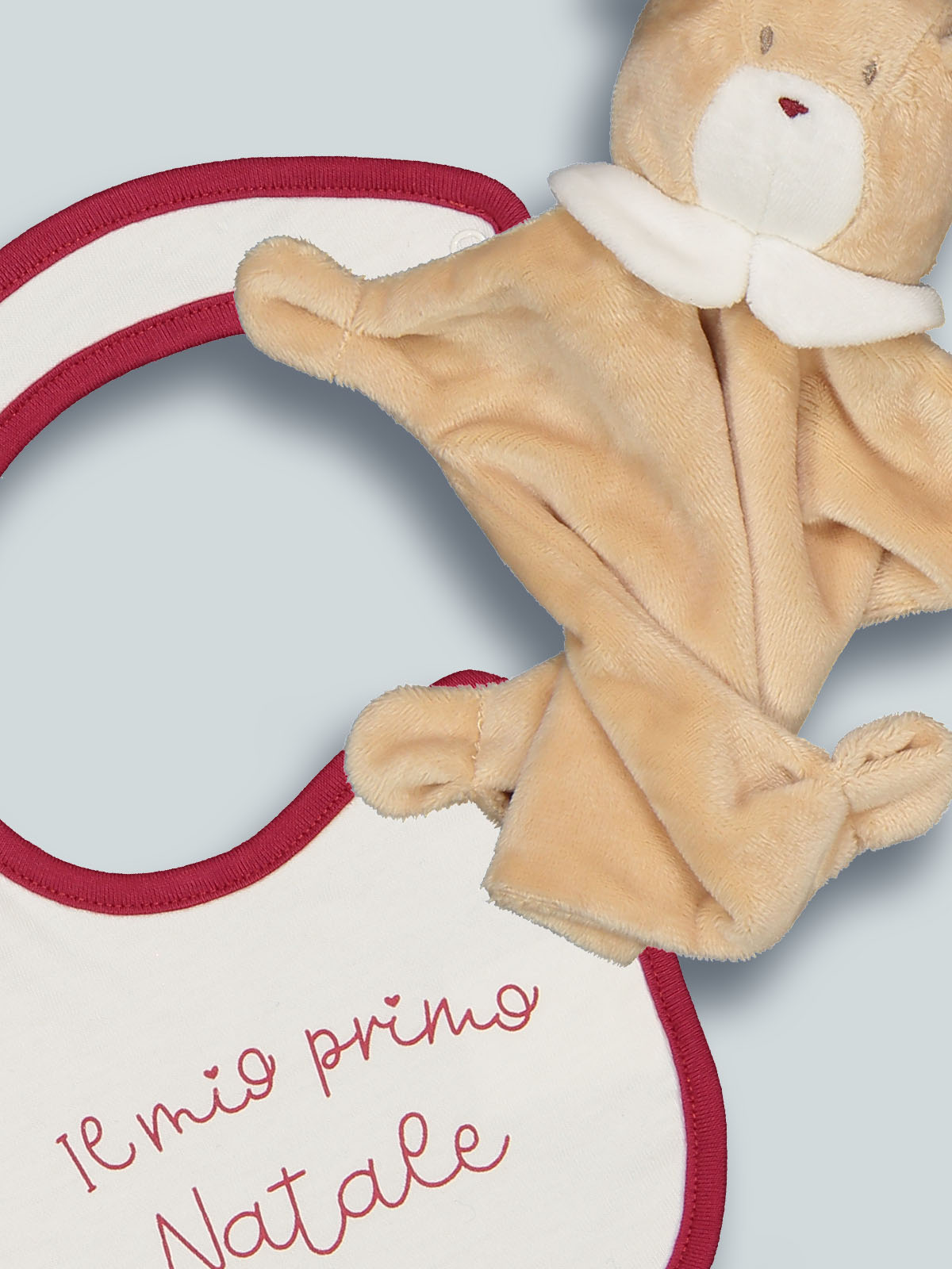 Completo composto da bavetta in morbido cotone e simpatico doudou in morbido peluche. Completo adatto da indossare nel periodo natalizio.
