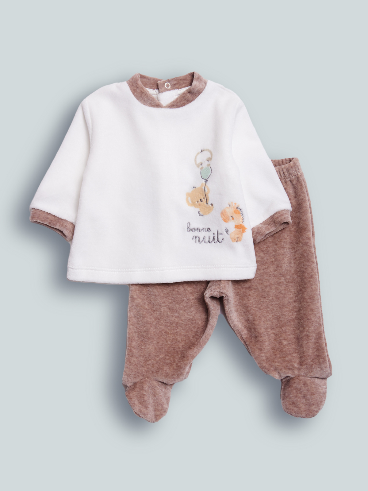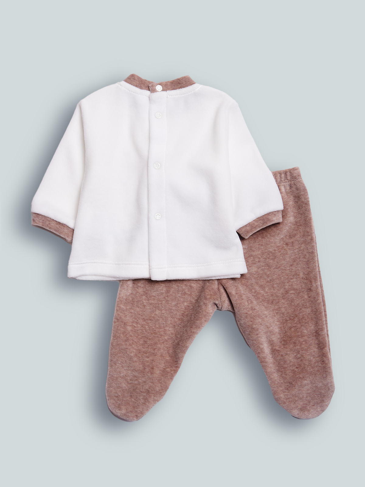 Completo due pezzi composto da coprifasce ciniglia, apertura totale sul dietro con bottoni a pressione. Elemento decorativo: ricamato e stampato sul davanti, ghettina ciniglia nocciola Melange. Fantastico per tutti i giorni, data la sua praticità. Questo completo fa parte del corredino composto da tutti gli articoli indispensabili per il tuo neonato.