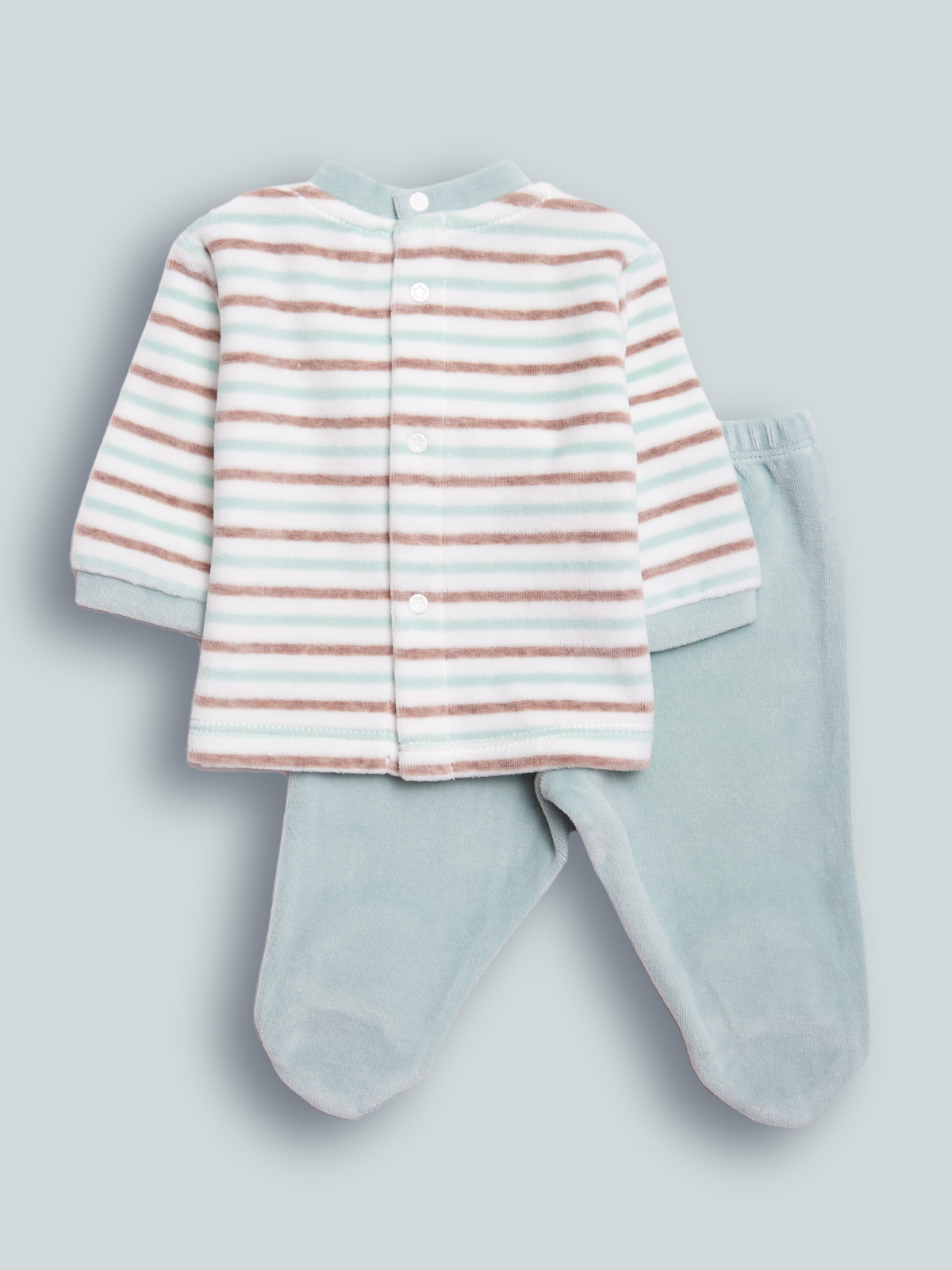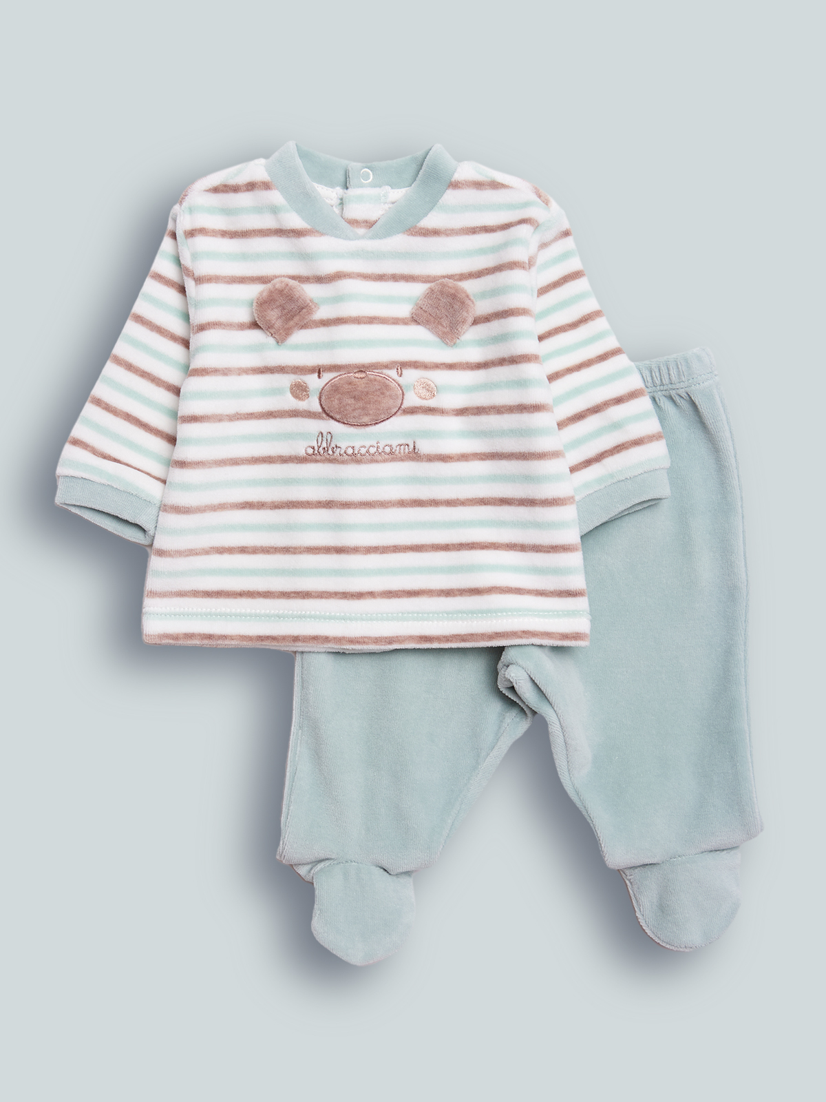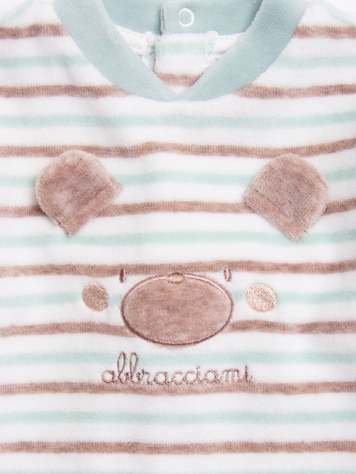 Completo due pezzi composto da coprifasce ciniglia rigato tinto filo, apertura totale sul dietro con bottoni a pressione. Elemento decorativo: ricamo sul davanti con orecchie 3D, ghettina ciniglia unito. Fantastico per tutti i giorni, data la sua praticità. Questo completo fa parte del corredino composto da tutti gli articoli indispensabili per il tuo neonato.