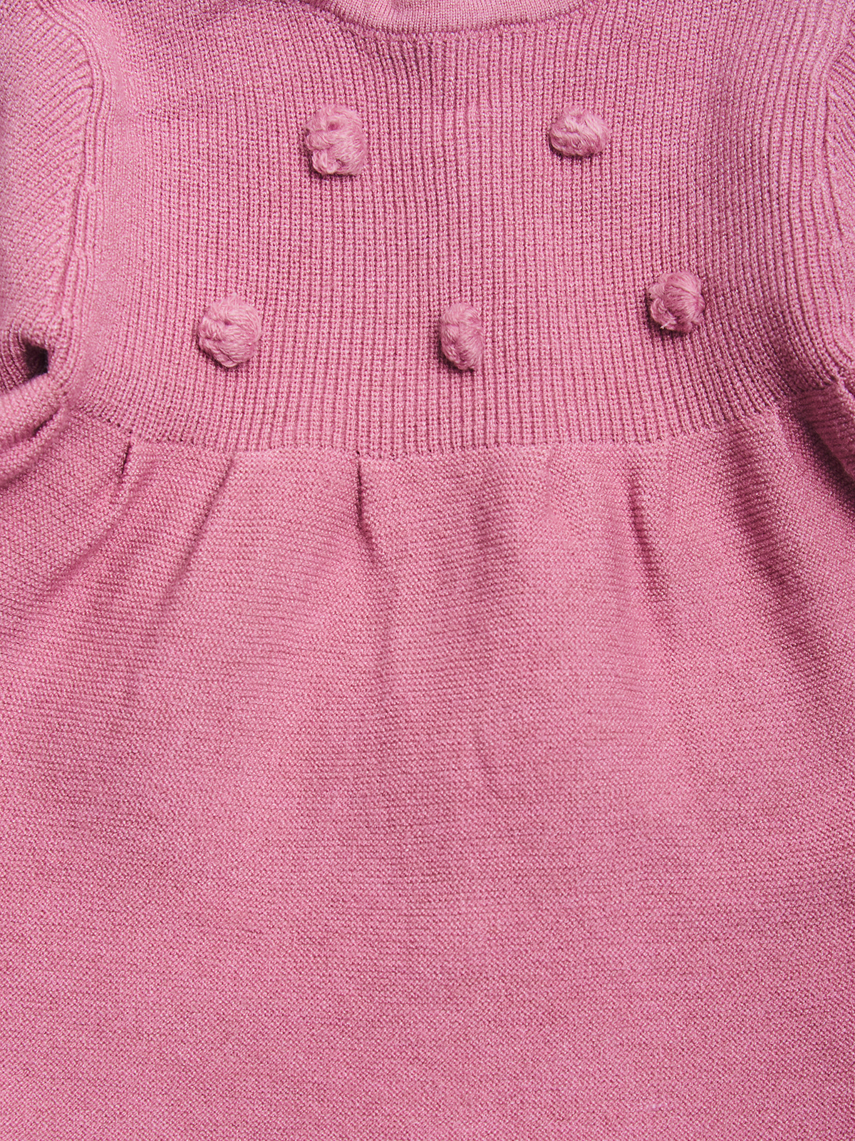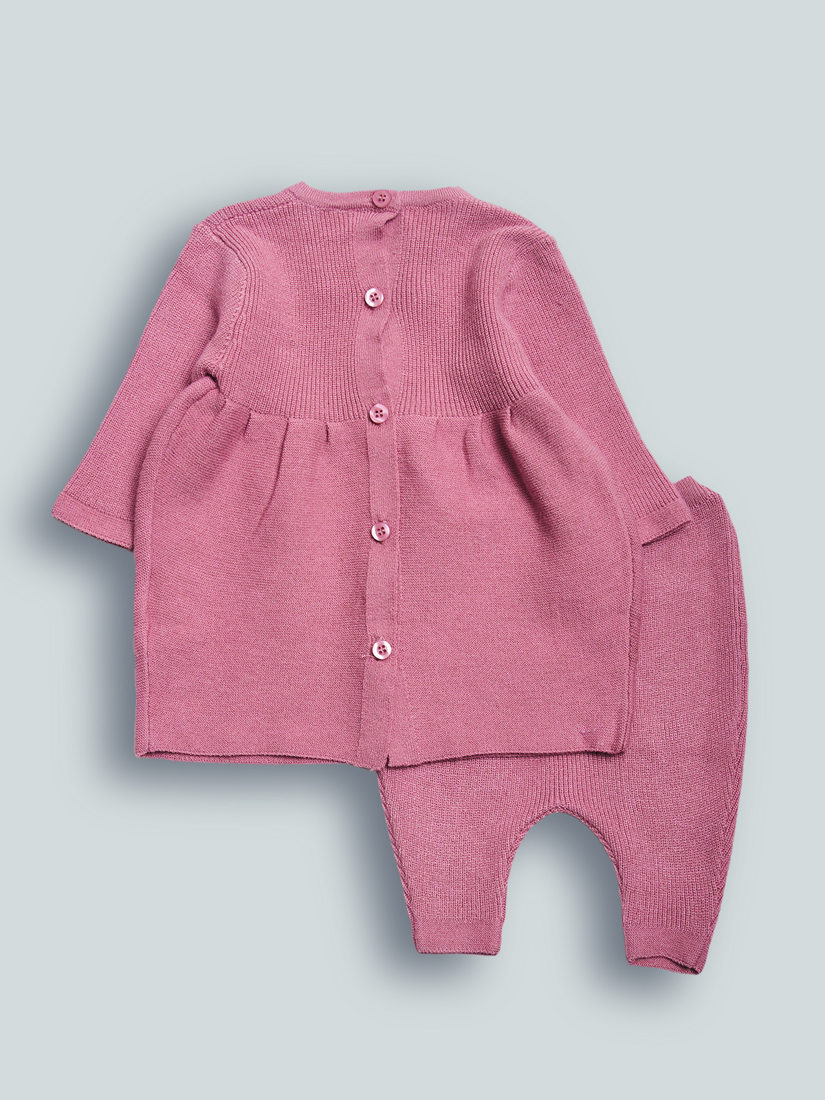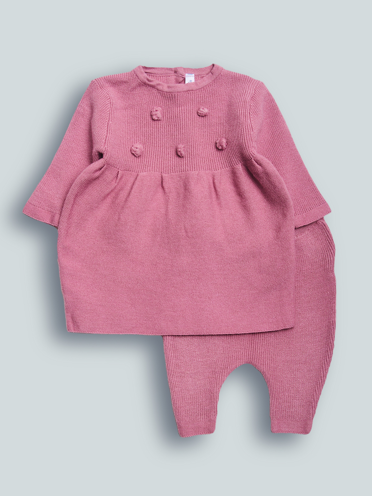 Completo due pezzi in morbida maglia tricot. Vestito manica lunga, collo rotondo. Chiusura con bottoni sulla schiena per facilitare la vestibilità. Pantalone modello leggings. Morbido elastico in vita. Non farti sfuggire comodità ed eleganza in un solo capo.