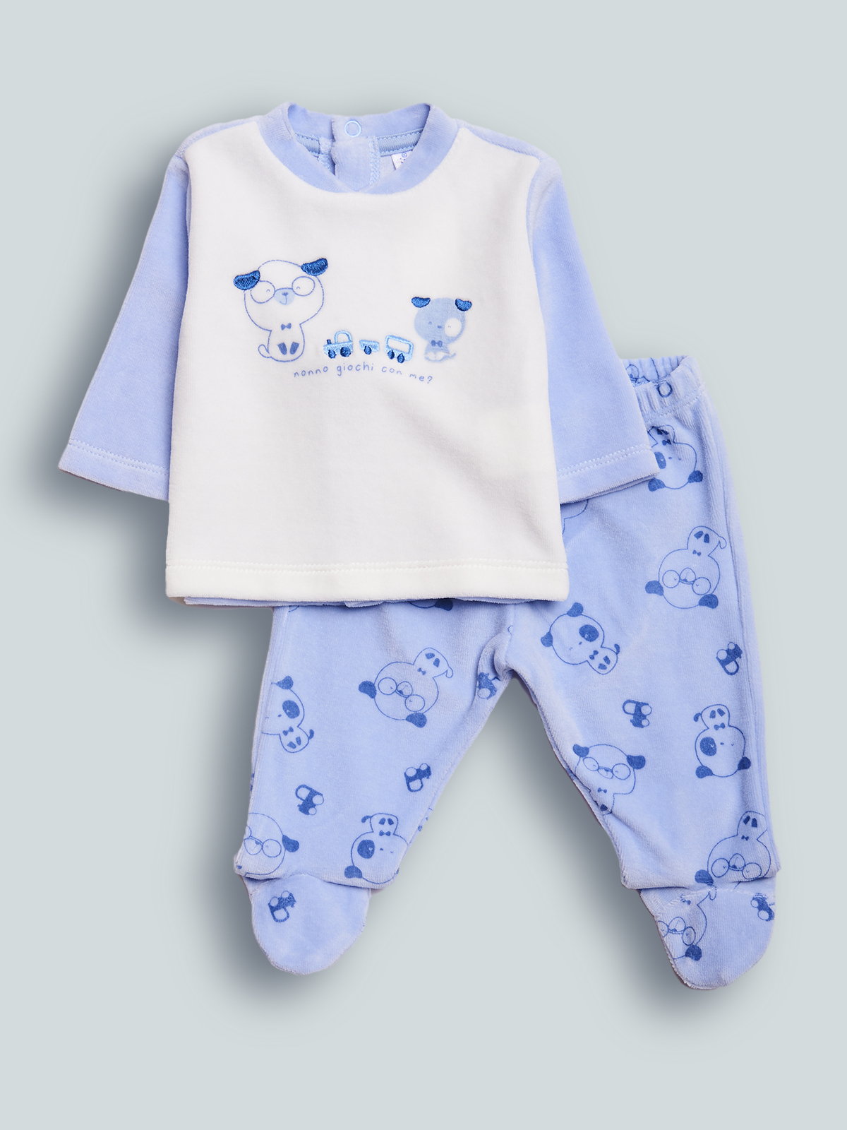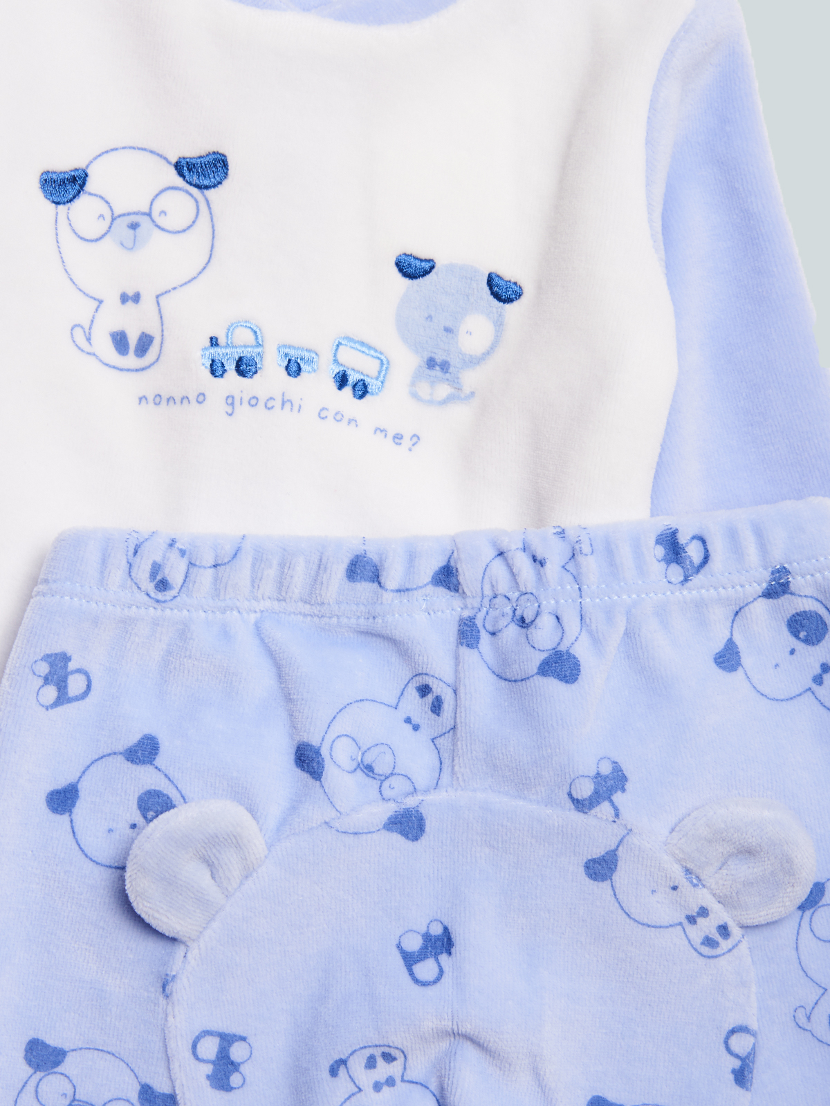 Completo due pezzi composto da coprifasce ciniglia, apertura totale sul dietro con bottoni a pressione. Elemento decorativo: ricamo e stampa davanti. Ghettina ciniglia stampata, sul lato posteriore inserto con orecchie 3D. Fantastico per tutti i giorni, data la sua praticità. Questo completo fa parte del corredino composto da tutti gli articoli indispensabili per il tuo neonato.