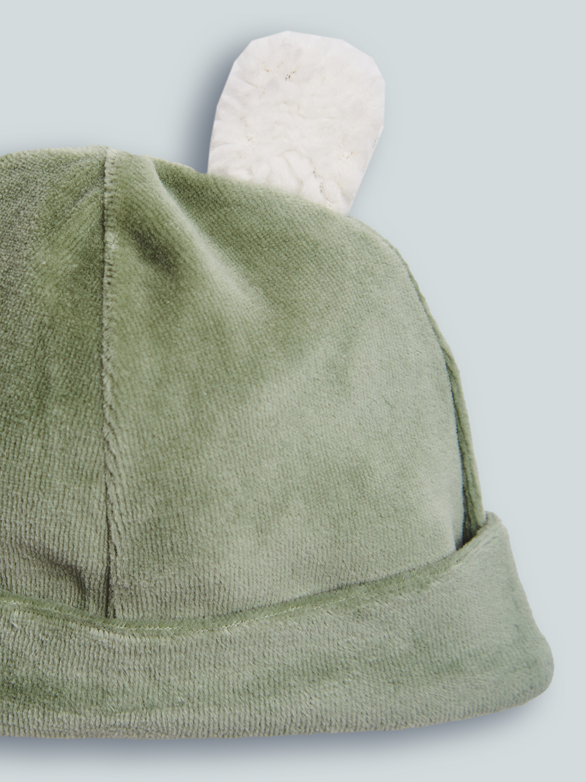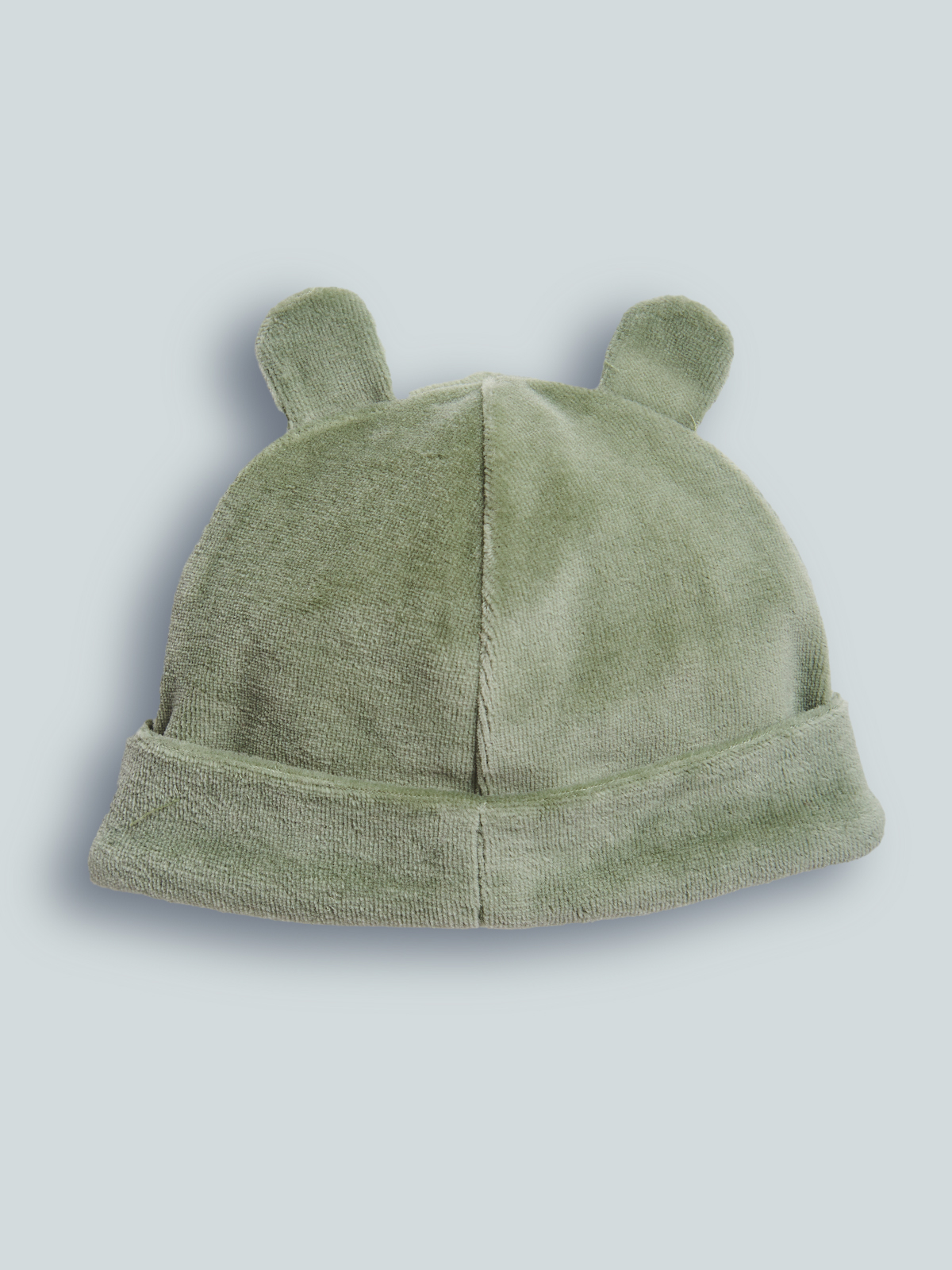 Cappello in ciniglia con risvolto, orecchie 3D in peluches. Questo cappellino fa parte del corredino composto da tutti gli articoli indispensabili per la tuo neonato.