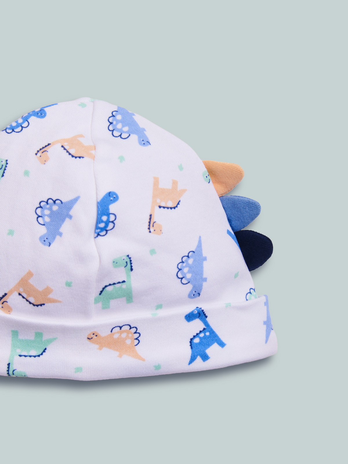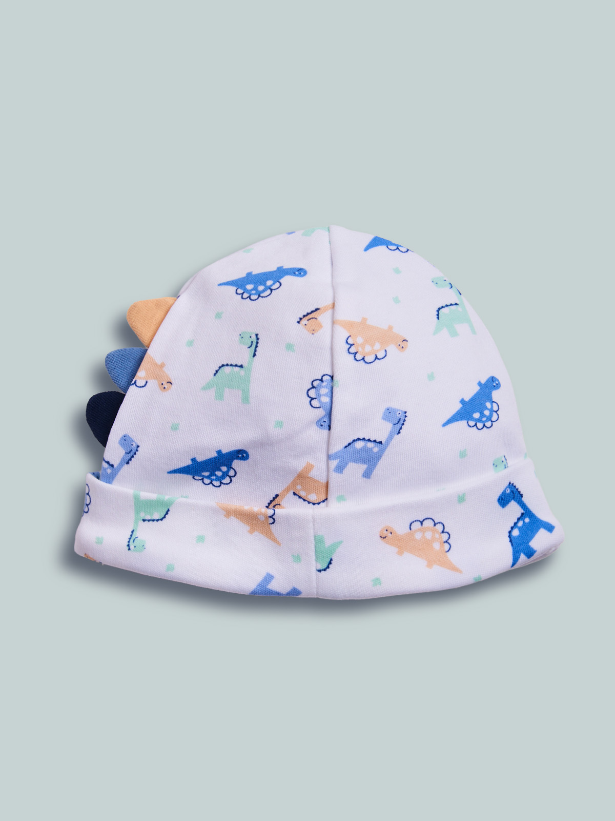 Divertente cuffia in caldo cotone stampato, aculei 3D in unito. Ideale per le giornate primaverili. Questo accessorio fa parte del corredino composto da tutti gli articoli indispensabili per la tua neonata.