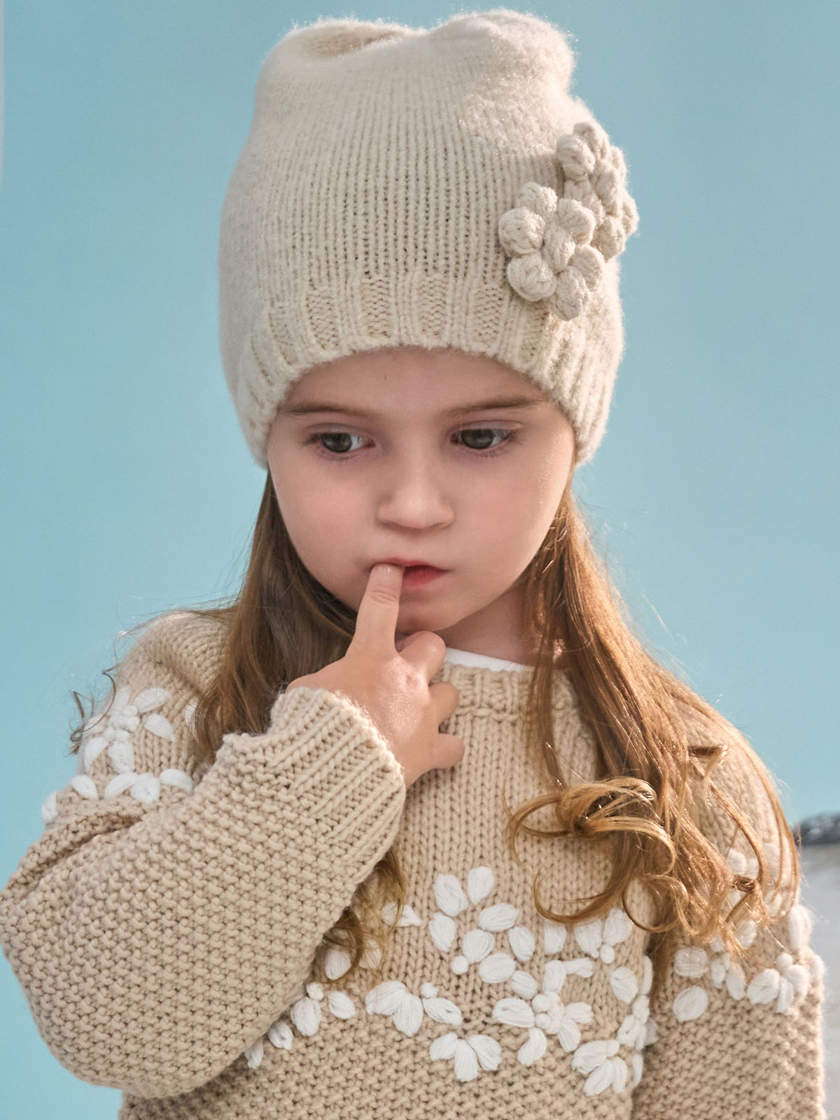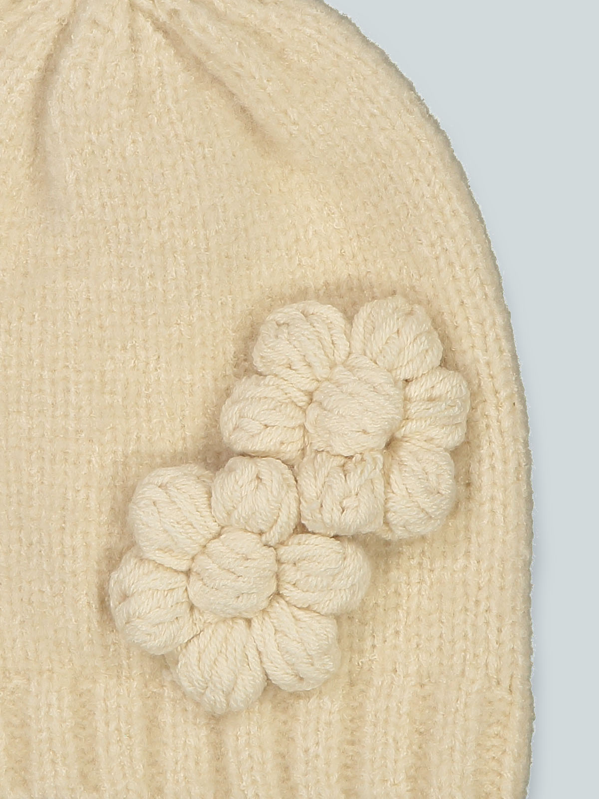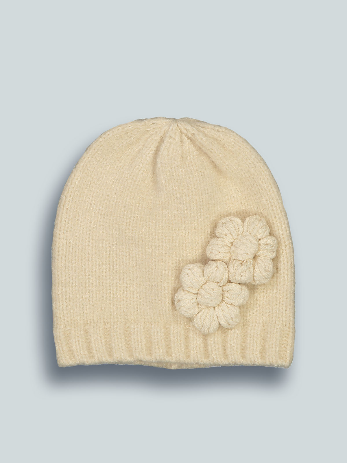 Cuffia in maglia di morbido misto cotone con fiori tridimensionali. E’ perfettamente abbinabile con la sua sciarpa coordinata, realizzata con lo stesso filato. La cuffia ideale da indossare nelle fredde giornate invernali.