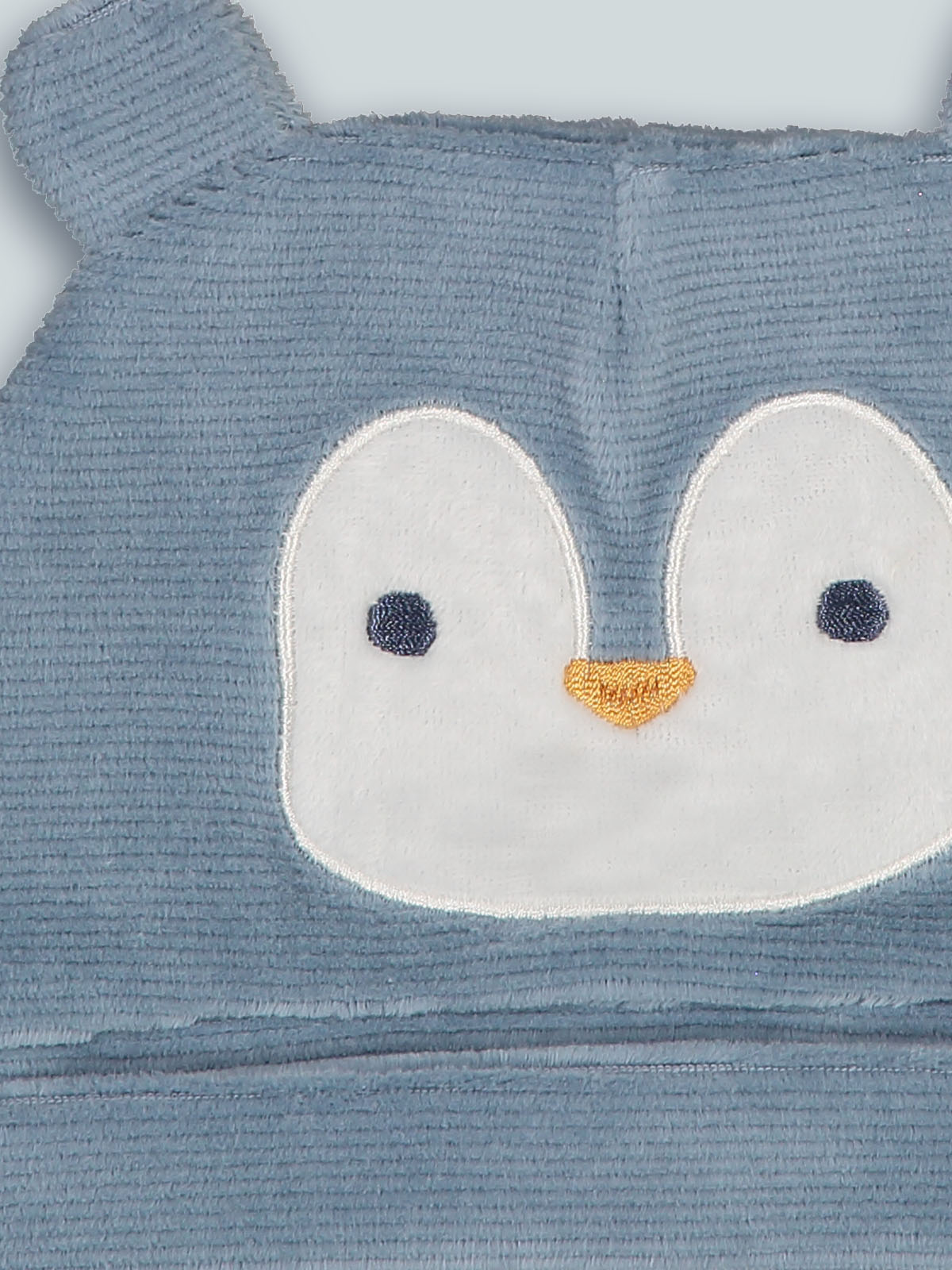 Cuffia in morbida ciniglia a coste. Elemento decoratvo: musetto pinguino e orecchie 3D. Questo cappellino fa parte del corredino composto da tutti gli articoli indispensabili per la tuo neonato.