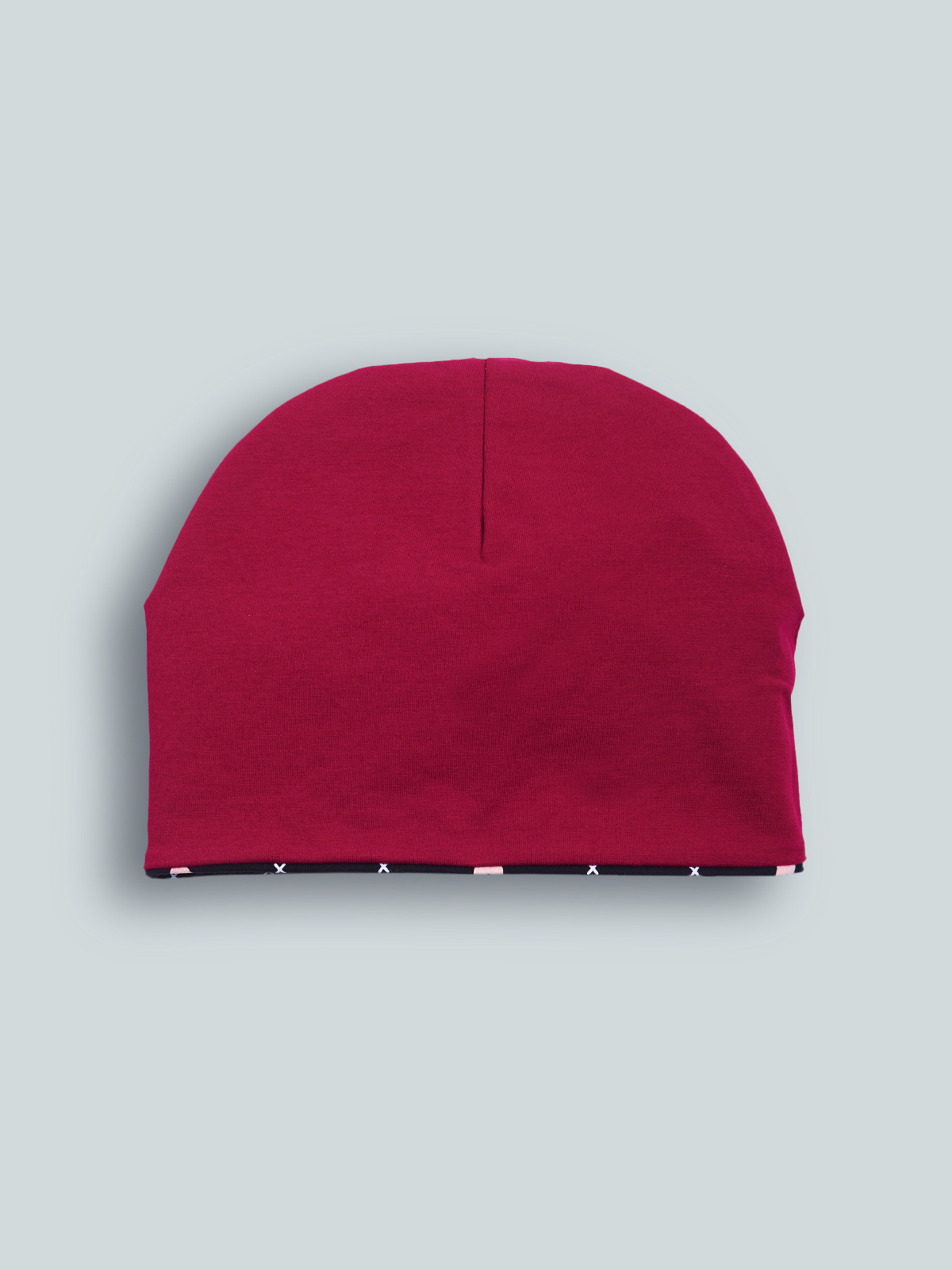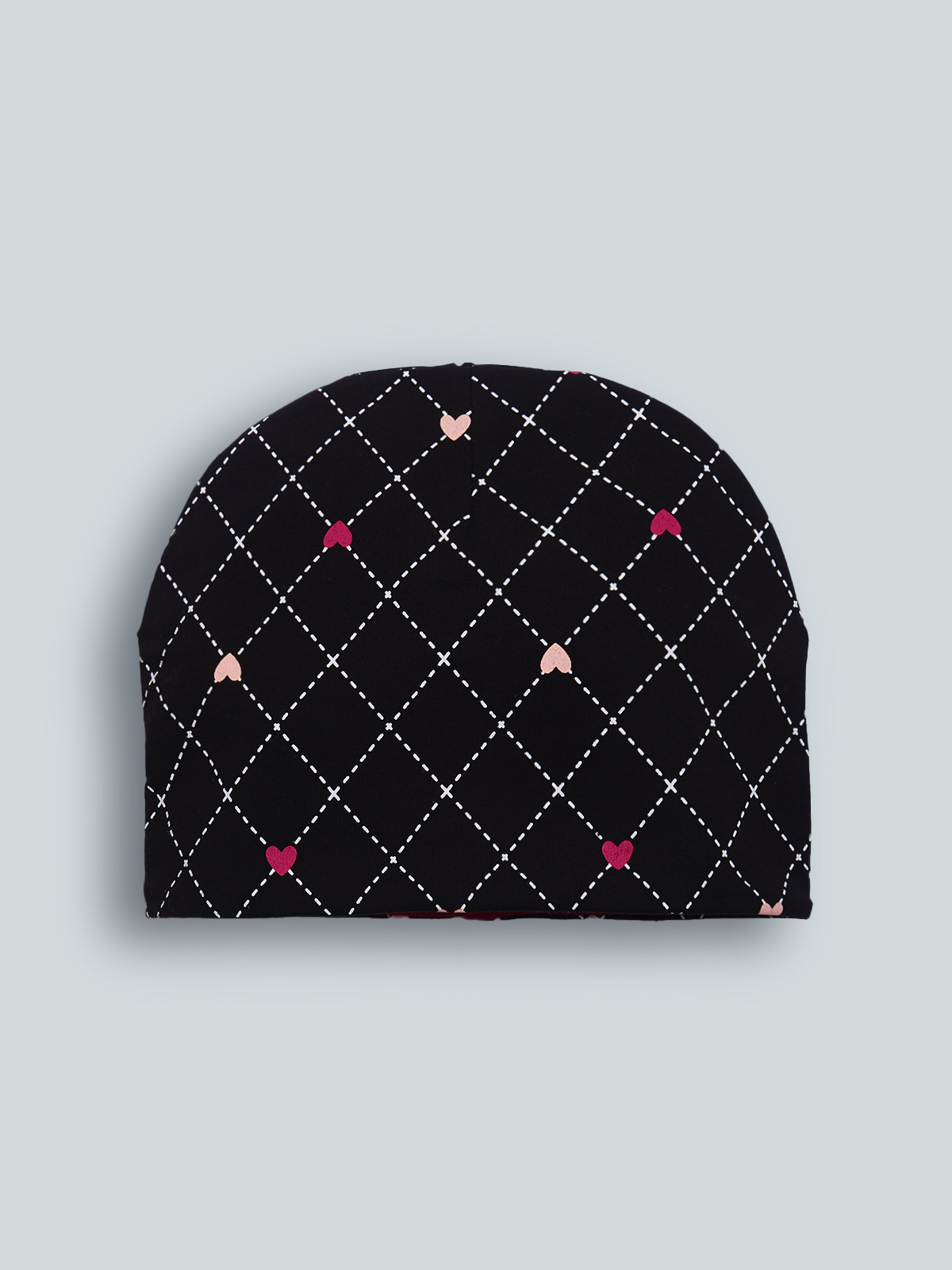 Cuffia in Morbida felpa leggera fantasia cuoricini reversibile tinta unita. Ideale per i primi freddi di stagione e Molto versatile.