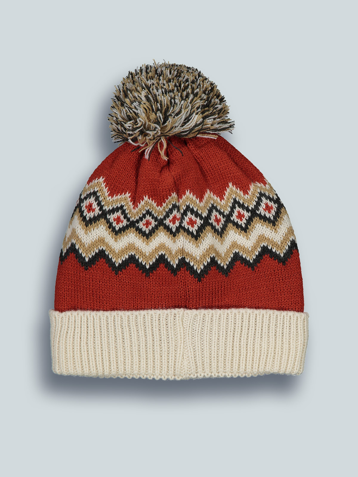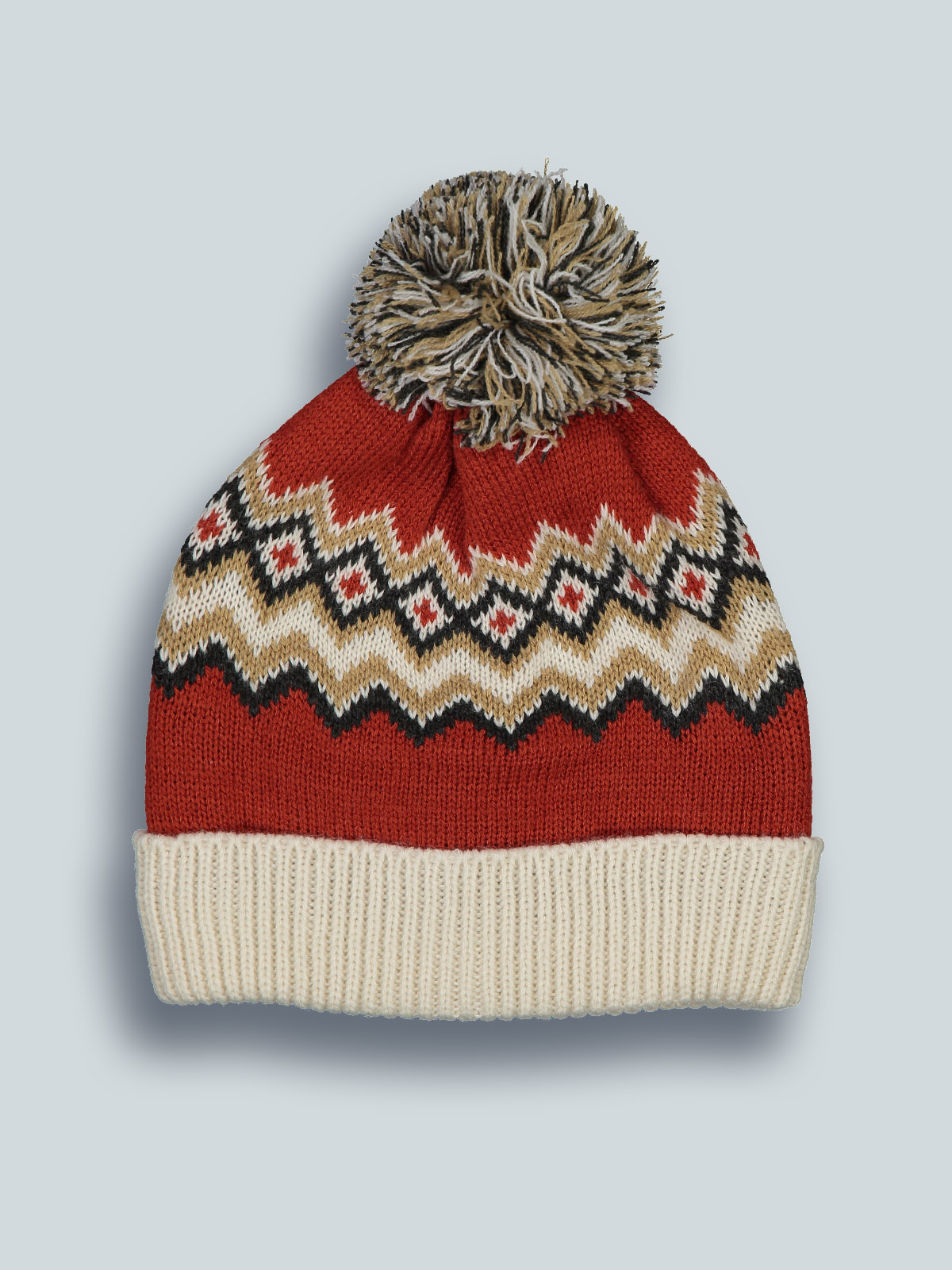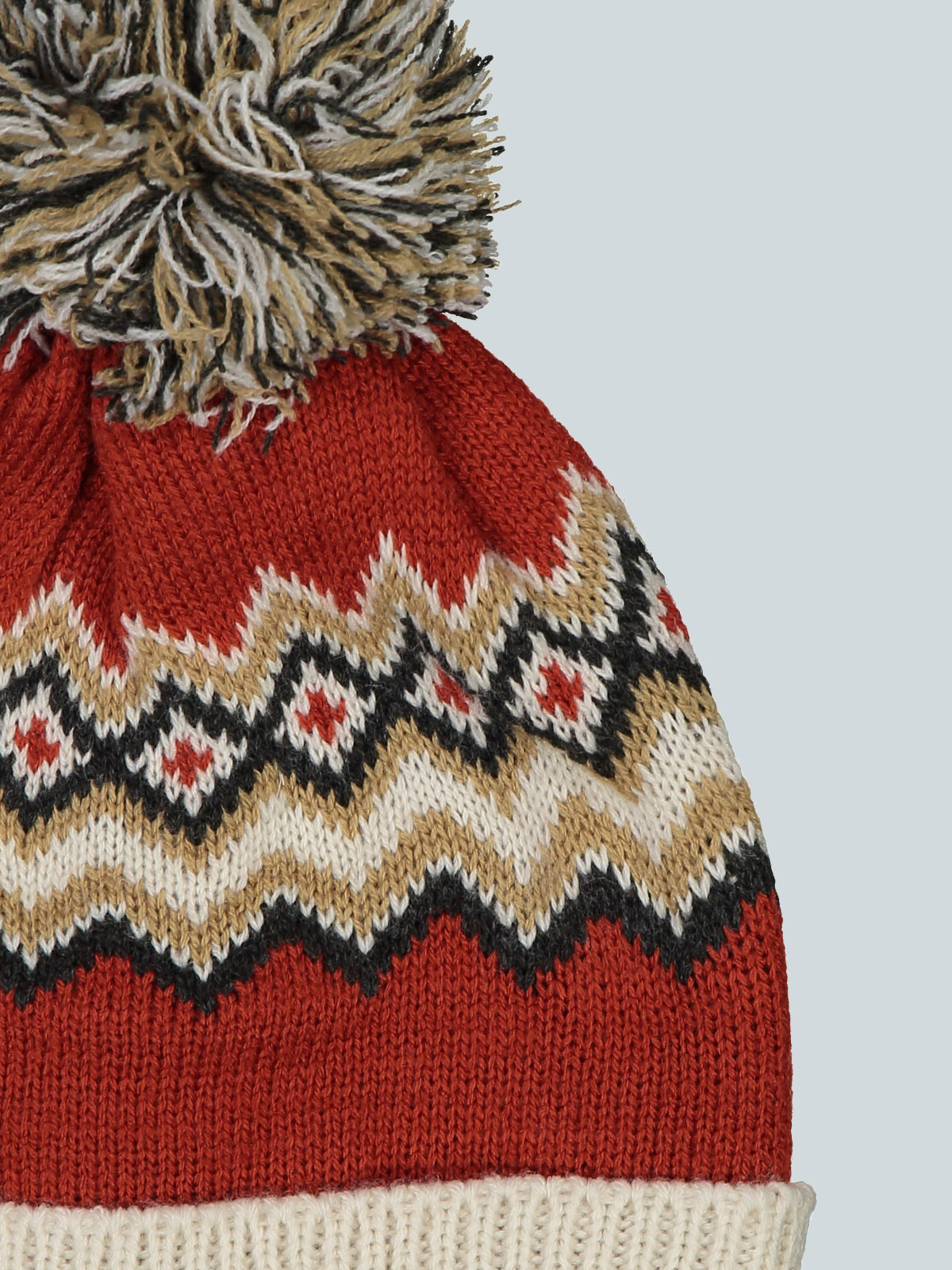 Cuffia in caldo e morbido tricot con lavorazione greche jacquard, pom pon e risvolto. Fodera in jersey. Un capo caldo e morbido per giocare nella neve, perfetto in abbinamento al collo.