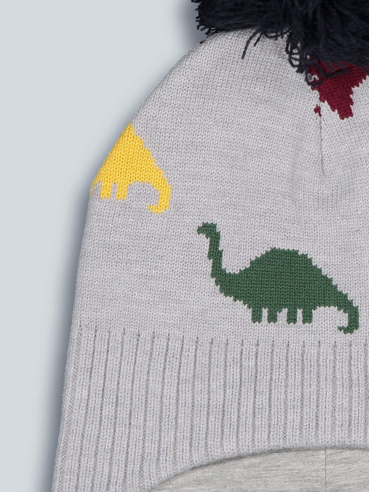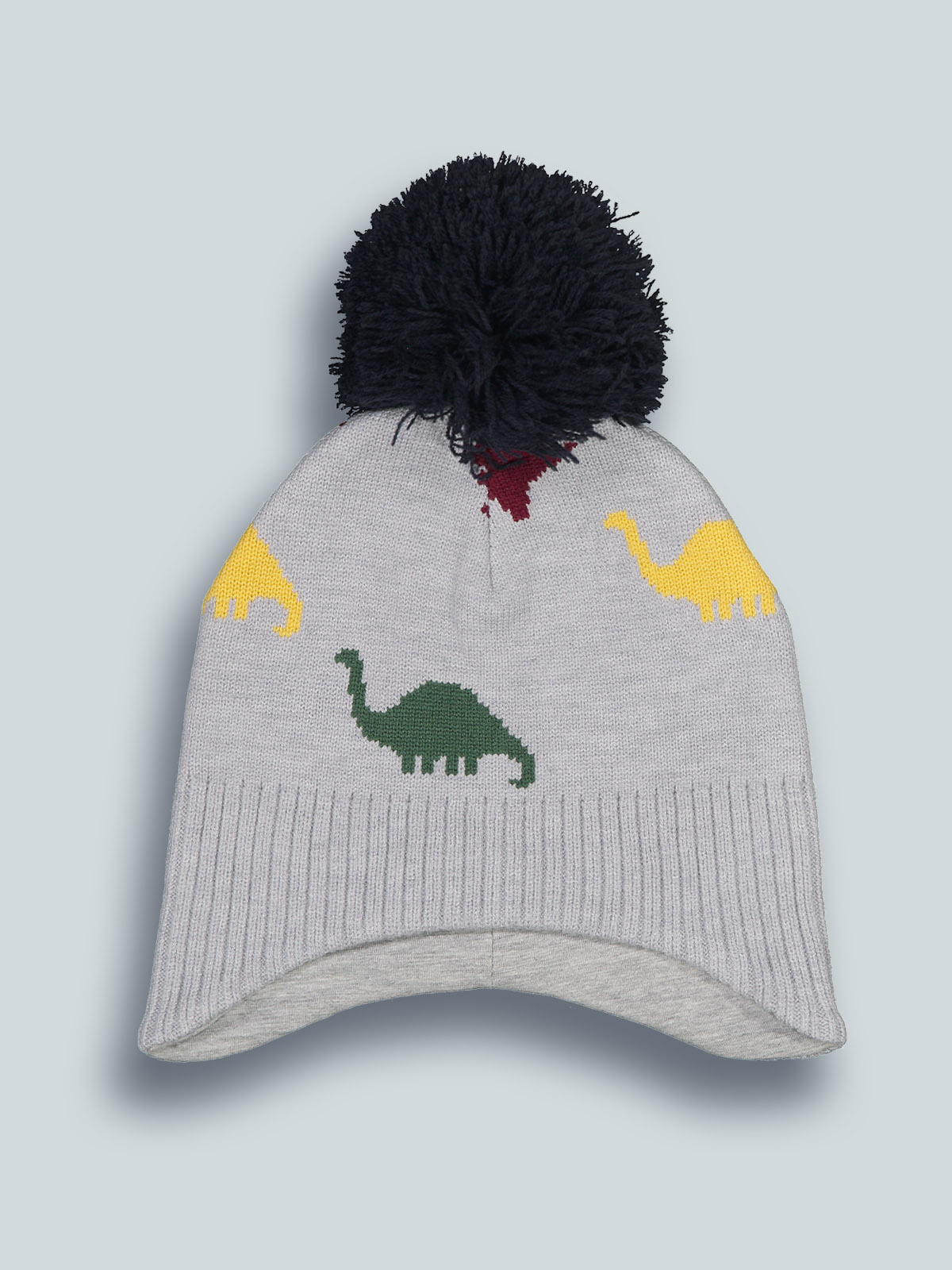 Cuffia in caldo e morbido tricot melange in fantasia dinosauri colorati. Modello con paraorecchie e pom pon. Foderato in jersey per rimanere ancora più al caldo. Perfetta da abbinare al collo e moffole coordinati, immancabili nelle fredde giornate d’inverno.