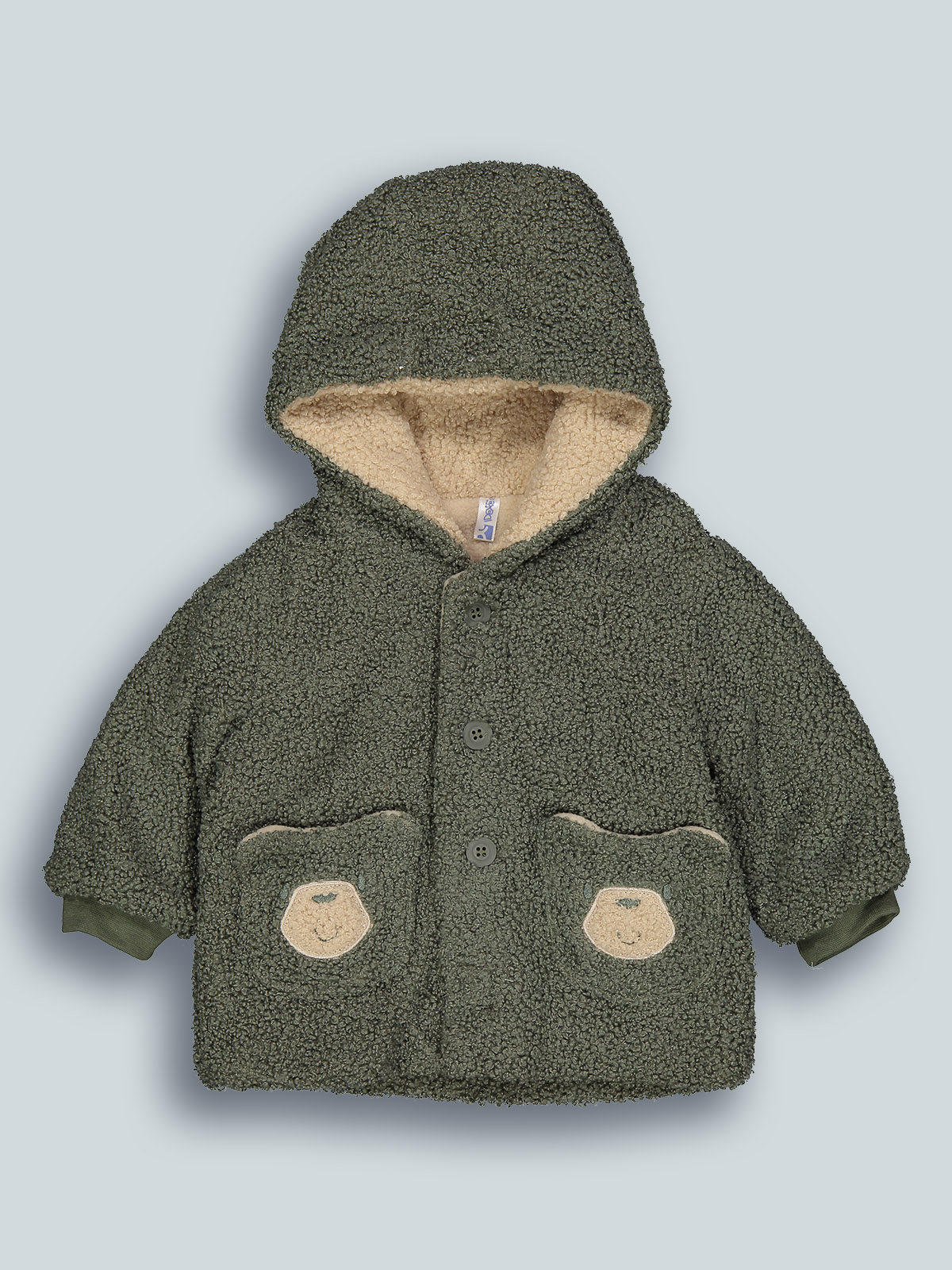 Simpatico il nostro giubbino in morbido bouclette, cappuccio attaccato, polsini salvaneve, foderato in morbido e caldo pile, imbottito. Tasche a forma di orsetto con ricamo. Abbottonatura davanti con bottoni. Un “must have” che non può mancare nell’armadio dei vostri neonati.